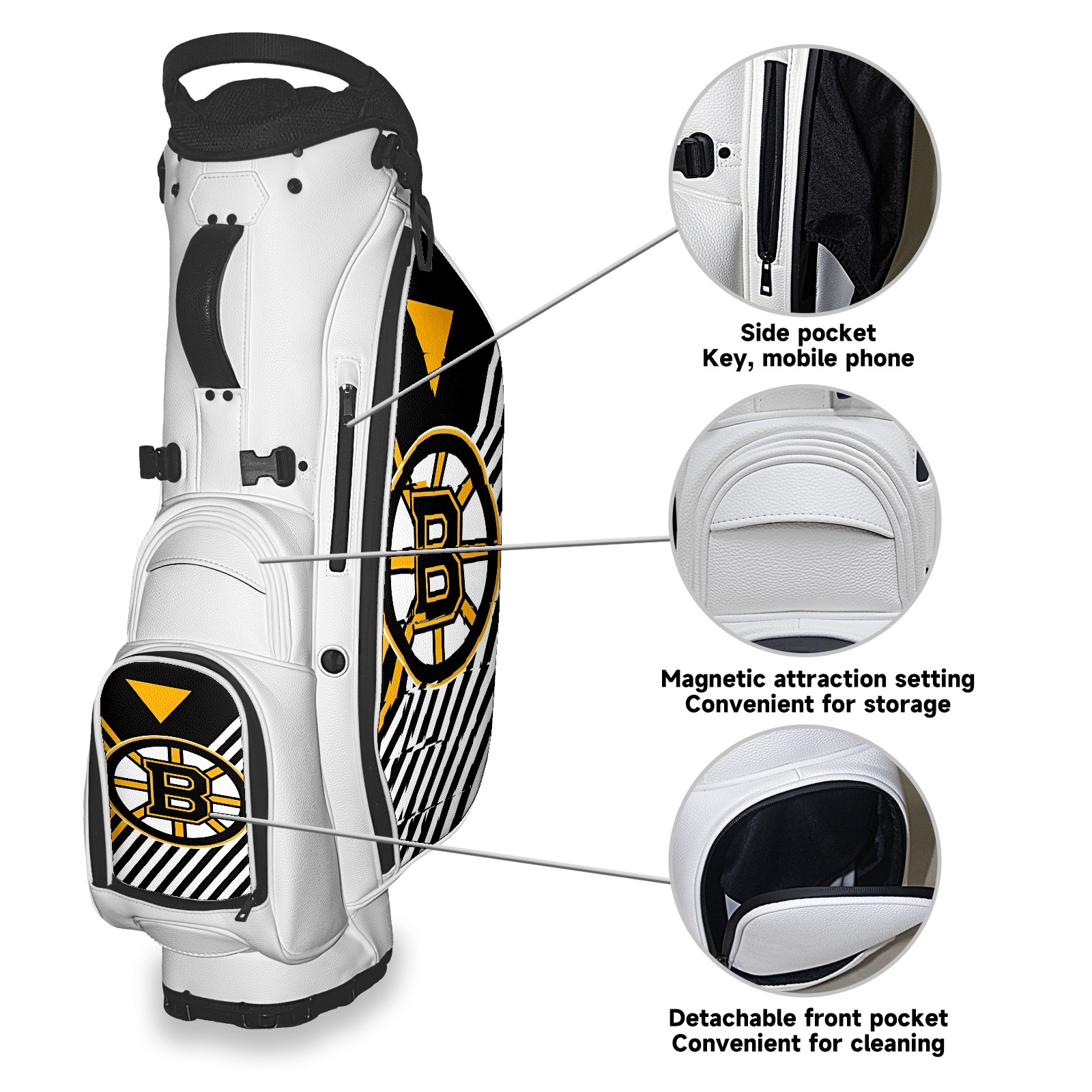 <p>The Golf Stand Bag, designed specifically for golf enthusiasts, offers a choice of 5 - way and 14 - way top dividers. Its 5/14 - compartment design with independent full - size club compartments safeguards clubs from collisions. Equipped with a rain cover, waterproof zippered pockets (tested to resist moderate to heavy rain), and a high - performance cooler pouch that can keep drinks cold for hours, it ensures a convenient golfing experience. The bag features thickened, breathable neoprene shoulder straps and an adjustable chest buckle, reducing shoulder fatigue by 35% compared to regular bags, and its automatic aluminum alloy stand provides stable support on various terrains. Crafted from top - tier, water - resistant litchi - grain PU leather, with double - stitched edges, reliable zippers tested for over 15,000 cycles, and anti - abrasion bottom studs, it guarantees durability. You can personalize it with embroidery on the front pocket and rain cover side (15*15cm area), and it comes in classic black and white, with a matte finish and litchi - grain texture that combines business and leisure styles. Measuring 130 cm in height, 37 cm in width, and 31 cm in depth (including rain cover) and 90 cm x 31 cm x 37 cm (excluding rain cover), it strikes a balance between storage and portability, capable of holding 14 standard - sized clubs and other essentials, and it also includes a dust cover. It's truly the perfect choice for golfers.<br></p>