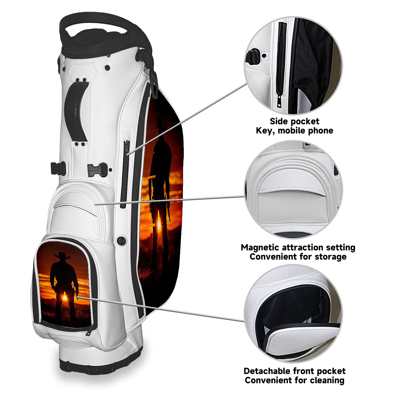 • <p>The Golf Stand Bag, designed specifically for golf enthusiasts, offers a choice of 5 - way and 14 - way top dividers. Its 5/14 - compartment design with independent full - size club compartments safeguards clubs from collisions. Equipped with a rain cover, waterproof zippered pockets (tested to resist moderate to heavy rain), and a high - performance cooler pouch that can keep drinks cold for hours, it ensures a convenient golfing experience. The bag features thickened, breathable neoprene shoulder straps and an adjustable chest buckle, reducing shoulder fatigue by 35% compared to regular bags, and its automatic aluminum alloy stand provides stable support on various terrains. Crafted from top - tier, water - resistant litchi - grain PU leather, with double - stitched edges, reliable zippers tested for over 15,000 cycles, and anti - abrasion bottom studs, it guarantees durability. You can personalize it with embroidery on the front pocket and rain cover side (15*15cm area), and it comes in classic black and white, with a matte finish and litchi - grain texture that combines business and leisure styles. Measuring 130 cm in height, 37 cm in width, and 31 cm in depth (including rain cover) and 90 cm x 31 cm x 37 cm (excluding rain cover), it strikes a balance between storage and portability, capable of holding 14 standard - sized clubs and other essentials, and it also includes a dust cover. It's truly the perfect choice for golfers.<br></p>