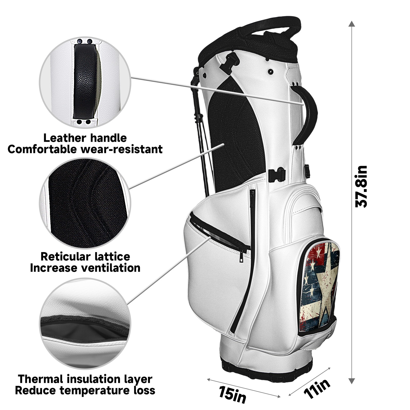 • <p>The Golf Stand Bag, designed specifically for golf enthusiasts, offers a choice of 5 - way and 14 - way top dividers. Its 5/14 - compartment design with independent full - size club compartments safeguards clubs from collisions. Equipped with a rain cover, waterproof zippered pockets (tested to resist moderate to heavy rain), and a high - performance cooler pouch that can keep drinks cold for hours, it ensures a convenient golfing experience. The bag features thickened, breathable neoprene shoulder straps and an adjustable chest buckle, reducing shoulder fatigue by 35% compared to regular bags, and its automatic aluminum alloy stand provides stable support on various terrains. Crafted from top - tier, water - resistant litchi - grain PU leather, with double - stitched edges, reliable zippers tested for over 15,000 cycles, and anti - abrasion bottom studs, it guarantees durability. You can personalize it with embroidery on the front pocket and rain cover side (15*15cm area), and it comes in classic black and white, with a matte finish and litchi - grain texture that combines business and leisure styles. Measuring 130 cm in height, 37 cm in width, and 31 cm in depth (including rain cover) and 90 cm x 31 cm x 37 cm (excluding rain cover), it strikes a balance between storage and portability, capable of holding 14 standard - sized clubs and other essentials, and it also includes a dust cover. It's truly the perfect choice for golfers.<br></p>