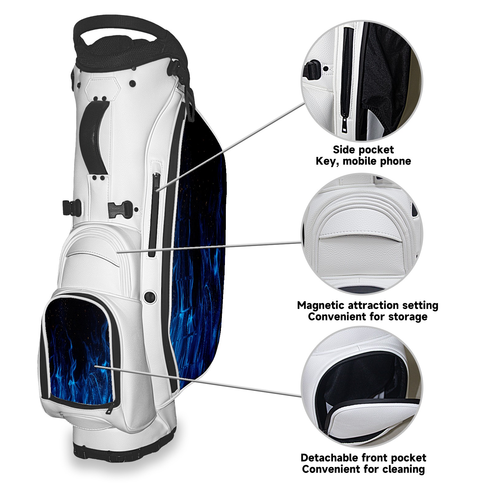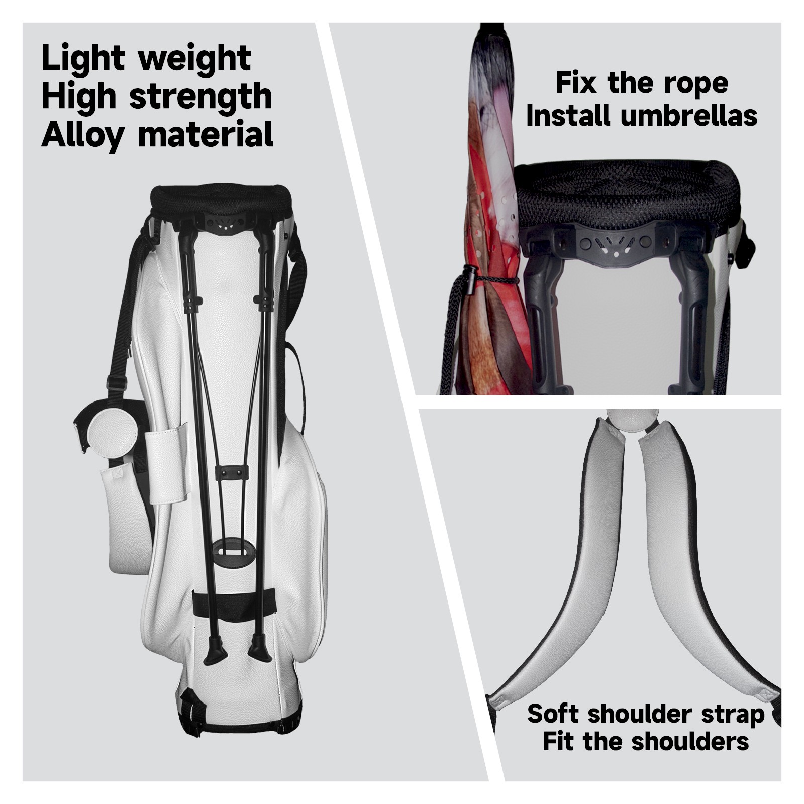 • <p>The Golf Stand Bag, designed specifically for golf enthusiasts, offers a choice of 5 - way and 14 - way top dividers. Its 5/14 - compartment design with independent full - size club compartments safeguards clubs from collisions. Equipped with a rain cover, waterproof zippered pockets (tested to resist moderate to heavy rain), and a high - performance cooler pouch that can keep drinks cold for hours, it ensures a convenient golfing experience. The bag features thickened, breathable neoprene shoulder straps and an adjustable chest buckle, reducing shoulder fatigue by 35% compared to regular bags, and its automatic aluminum alloy stand provides stable support on various terrains. Crafted from top - tier, water - resistant litchi - grain PU leather, with double - stitched edges, reliable zippers tested for over 15,000 cycles, and anti - abrasion bottom studs, it guarantees durability. You can personalize it with embroidery on the front pocket and rain cover side (15*15cm area), and it comes in classic black and white, with a matte finish and litchi - grain texture that combines business and leisure styles. Measuring 130 cm in height, 37 cm in width, and 31 cm in depth (including rain cover) and 90 cm x 31 cm x 37 cm (excluding rain cover), it strikes a balance between storage and portability, capable of holding 14 standard - sized clubs and other essentials, and it also includes a dust cover. It's truly the perfect choice for golfers.<br></p>