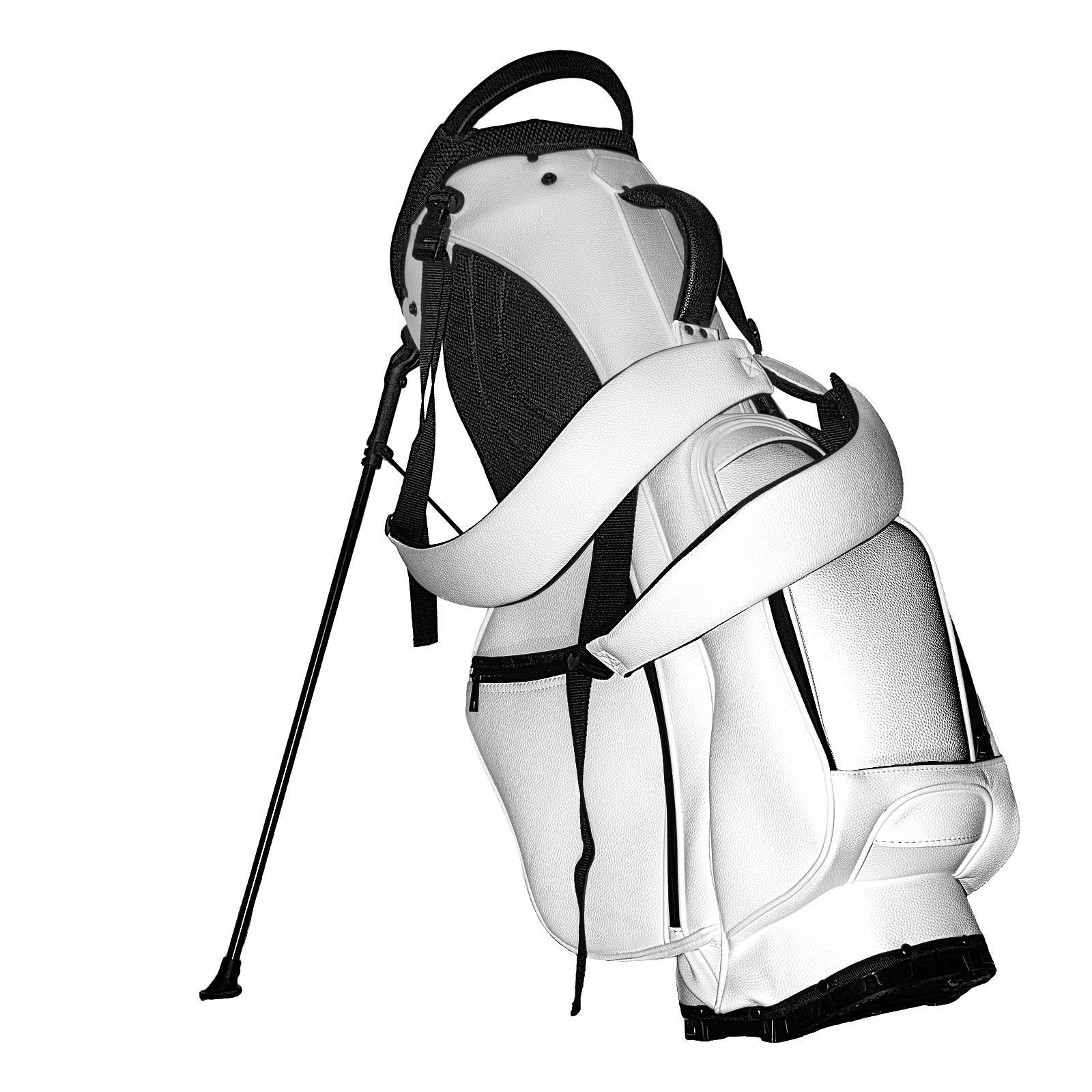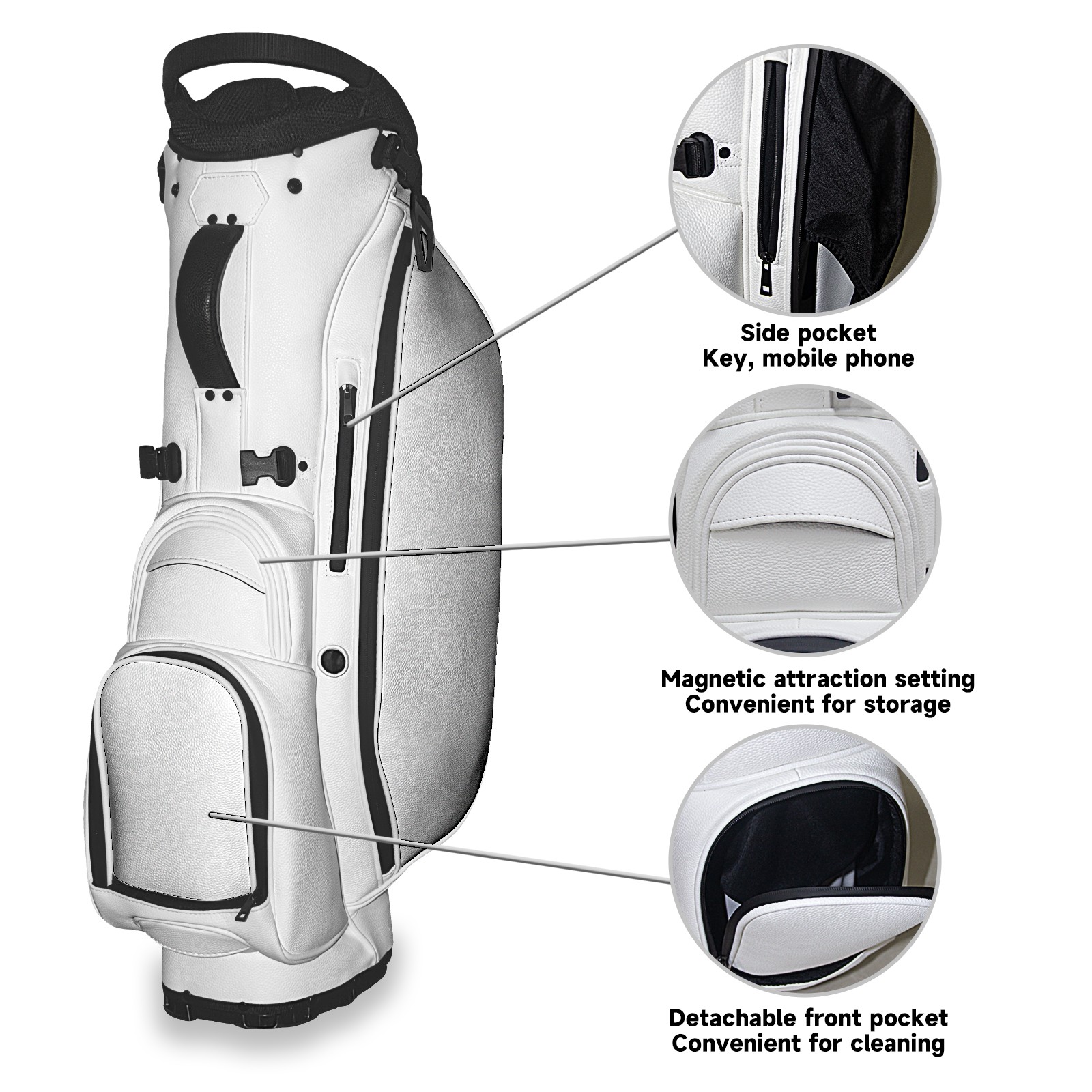 • <p>The Golf Stand Bag, designed specifically for golf enthusiasts, offers a choice of 5 - way and 14 - way top dividers. Its 5/14 - compartment design with independent full - size club compartments safeguards clubs from collisions. Equipped with a rain cover, waterproof zippered pockets (tested to resist moderate to heavy rain), and a high - performance cooler pouch that can keep drinks cold for hours, it ensures a convenient golfing experience. The bag features thickened, breathable neoprene shoulder straps and an adjustable chest buckle, reducing shoulder fatigue by 35% compared to regular bags, and its automatic aluminum alloy stand provides stable support on various terrains. Crafted from top - tier, water - resistant litchi - grain PU leather, with double - stitched edges, reliable zippers tested for over 15,000 cycles, and anti - abrasion bottom studs, it guarantees durability. You can personalize it with embroidery on the front pocket and rain cover side (15*15cm area), and it comes in classic black and white, with a matte finish and litchi - grain texture that combines business and leisure styles. Measuring 130 cm in height, 37 cm in width, and 31 cm in depth (including rain cover) and 90 cm x 31 cm x 37 cm (excluding rain cover), it strikes a balance between storage and portability, capable of holding 14 standard - sized clubs and other essentials, and it also includes a dust cover. It's truly the perfect choice for golfers.<br></p>