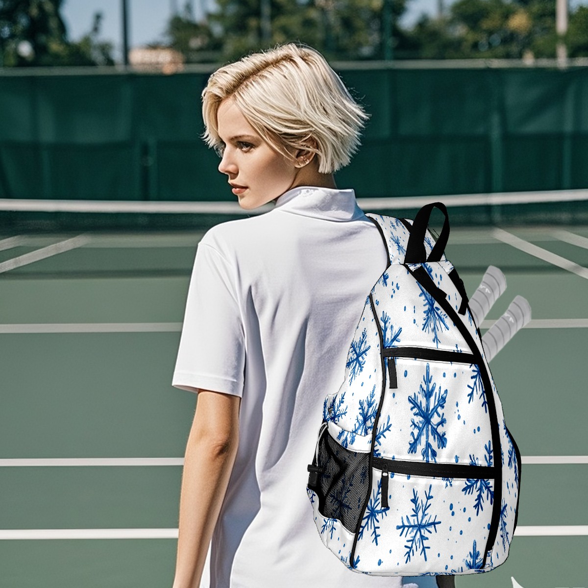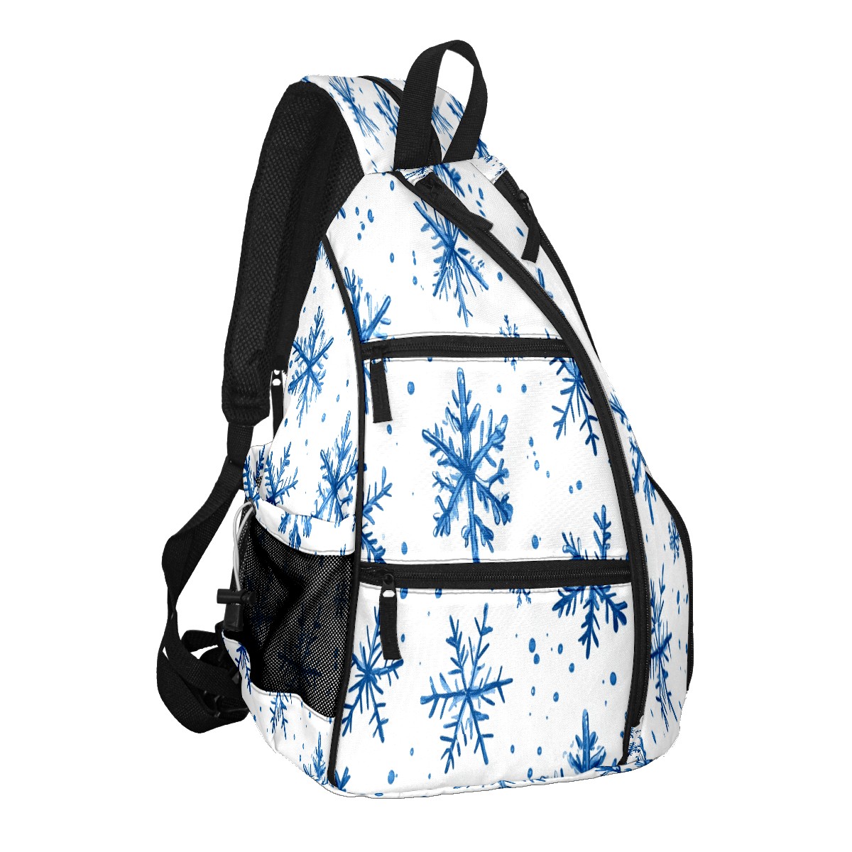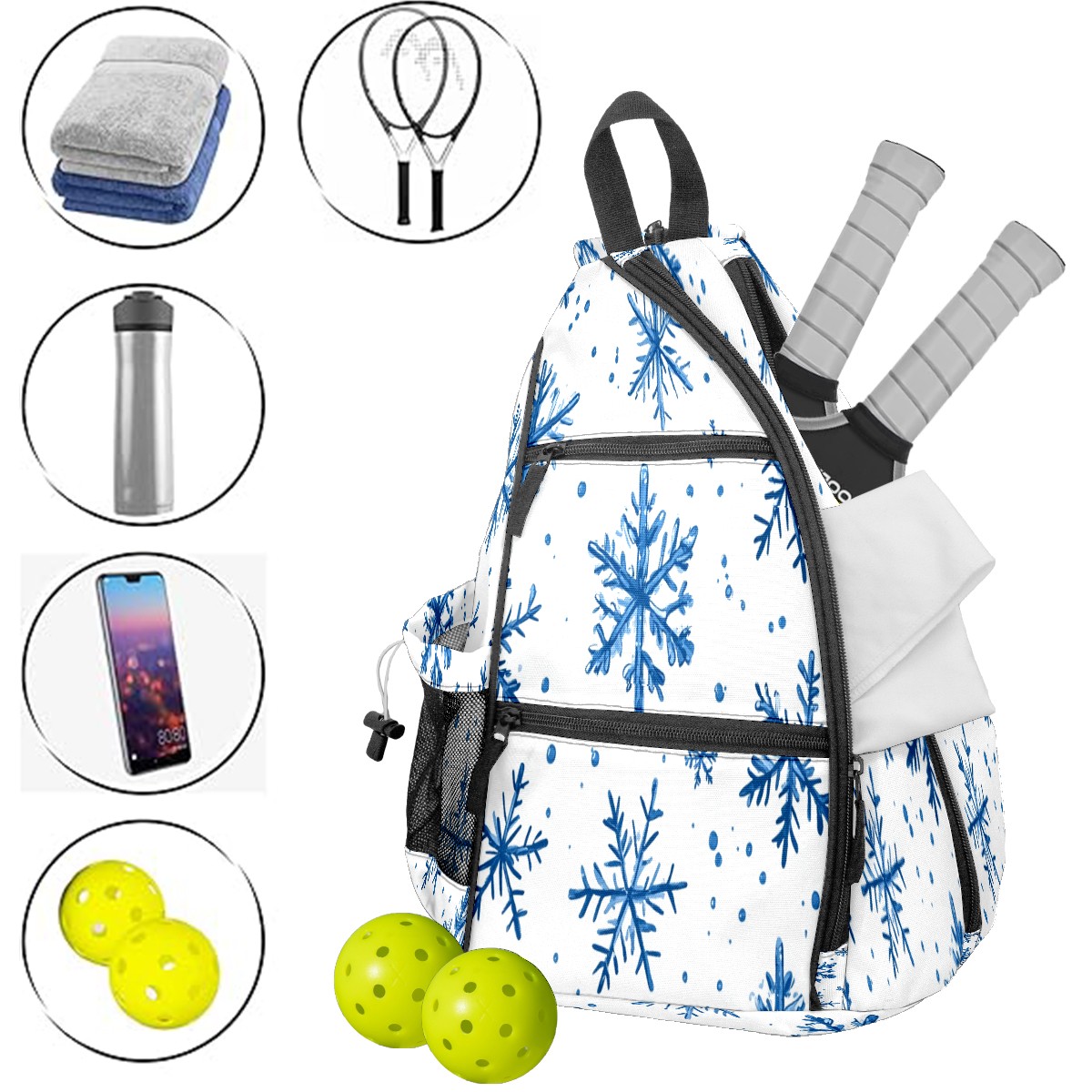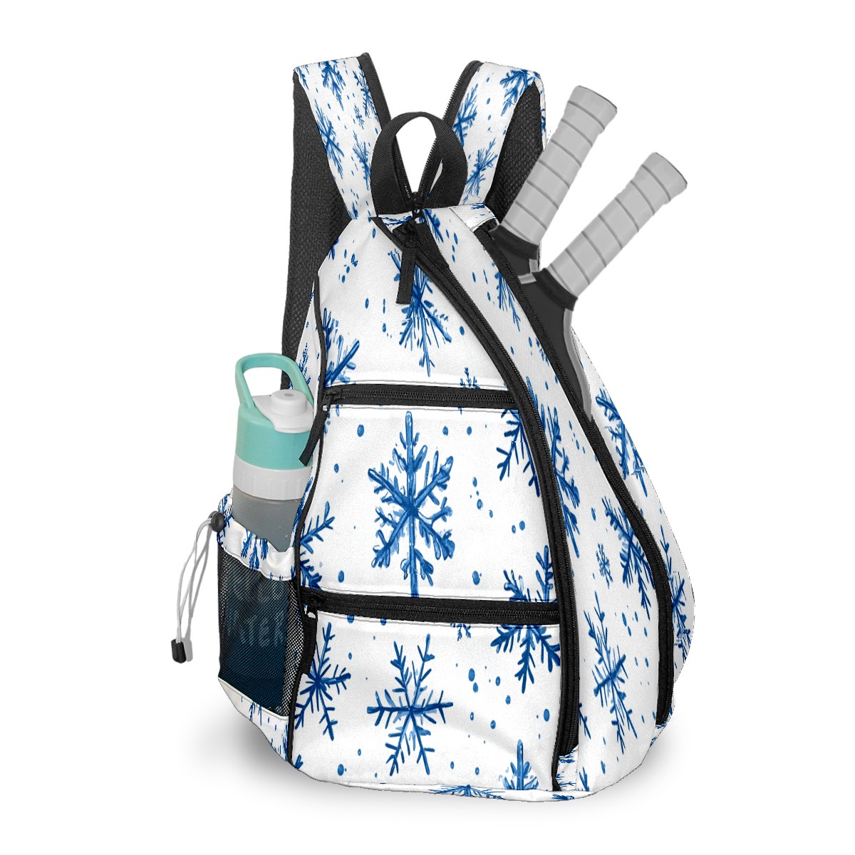 Pickleball Shoulder Bag for Men and Women - Fence Hook - Crossbody Backpack with Water Bottle Holder Blue Snowflake
