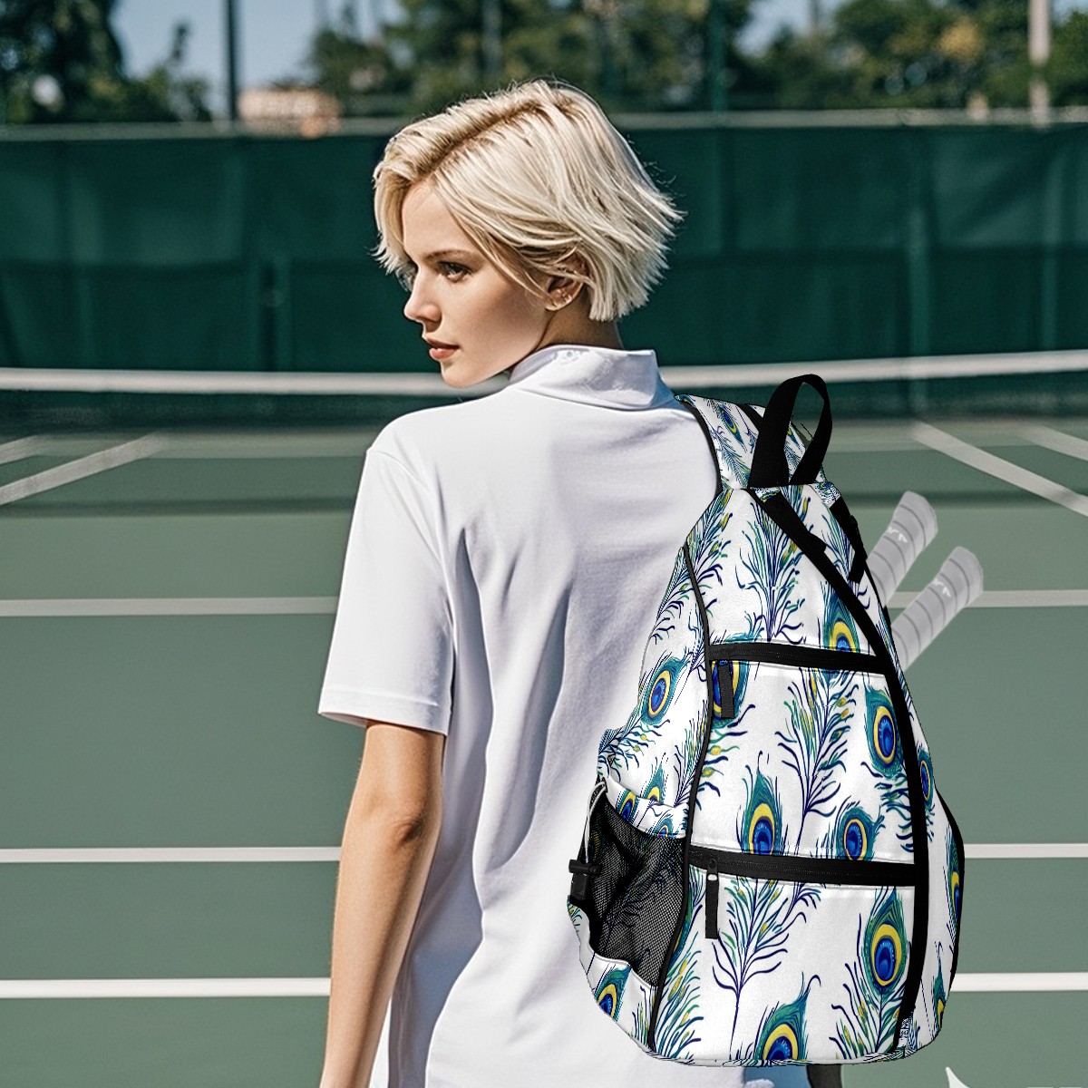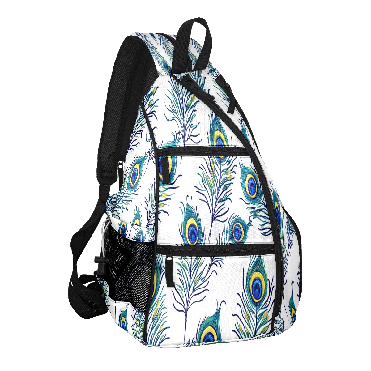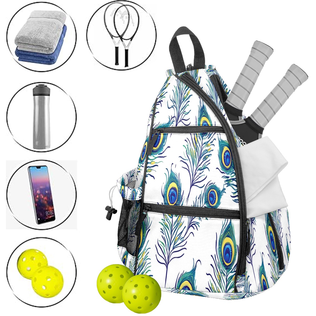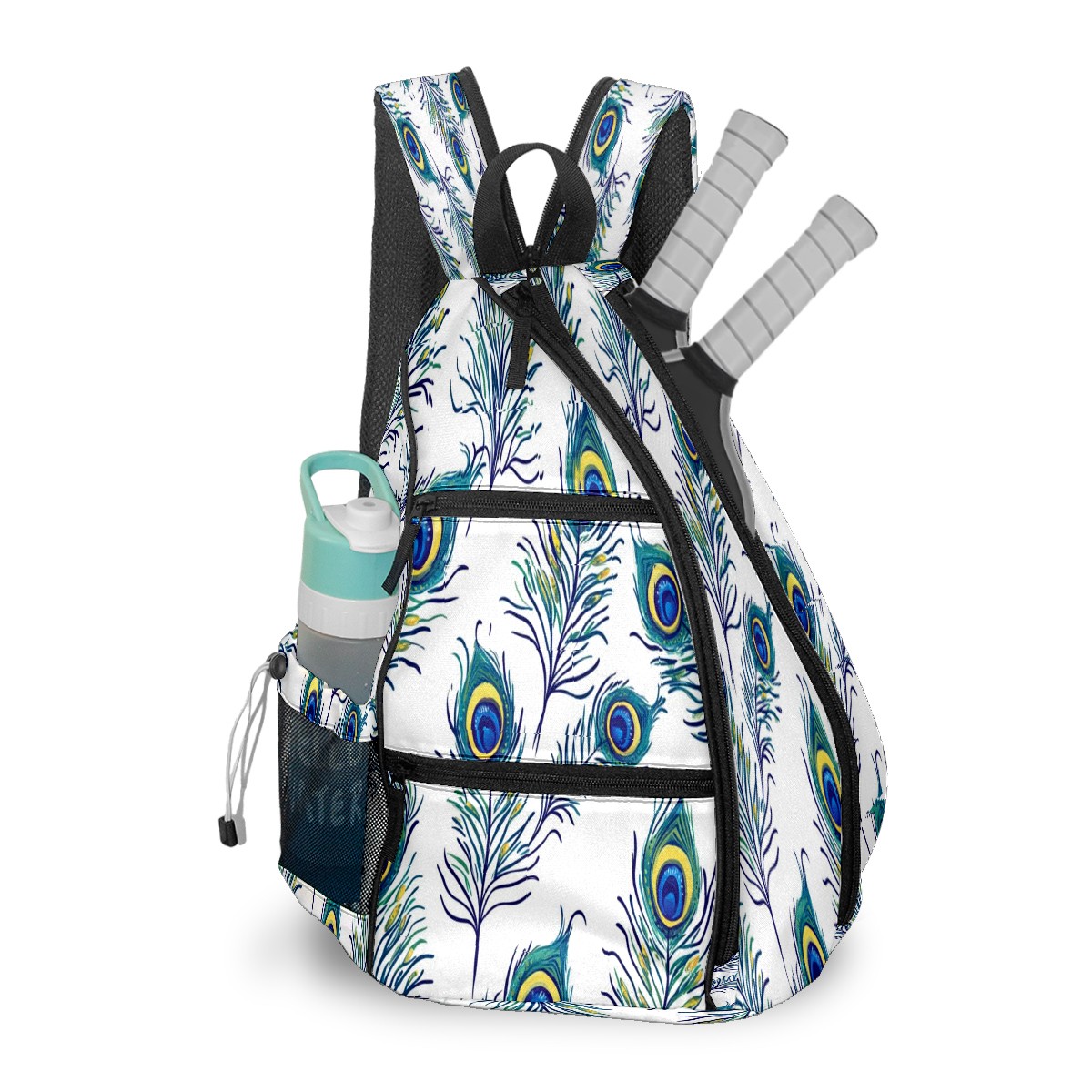 Pickleball Shoulder Bag for Men and Women - Fence Hook - Crossbody Backpack with Water Bottle Holder Peacock Feather Pattern