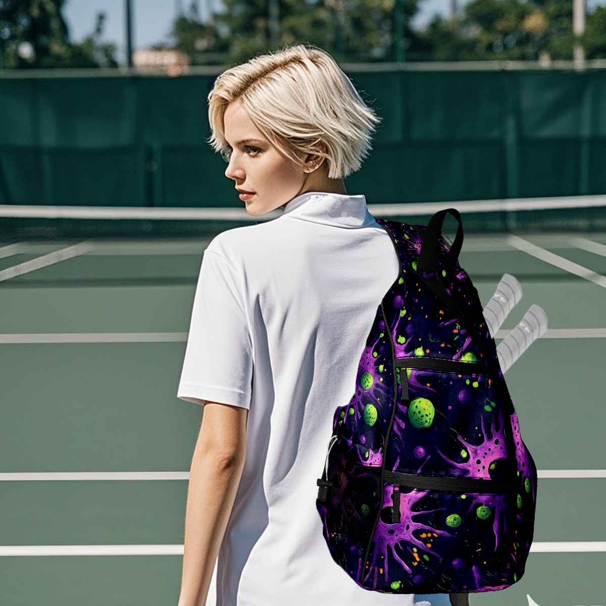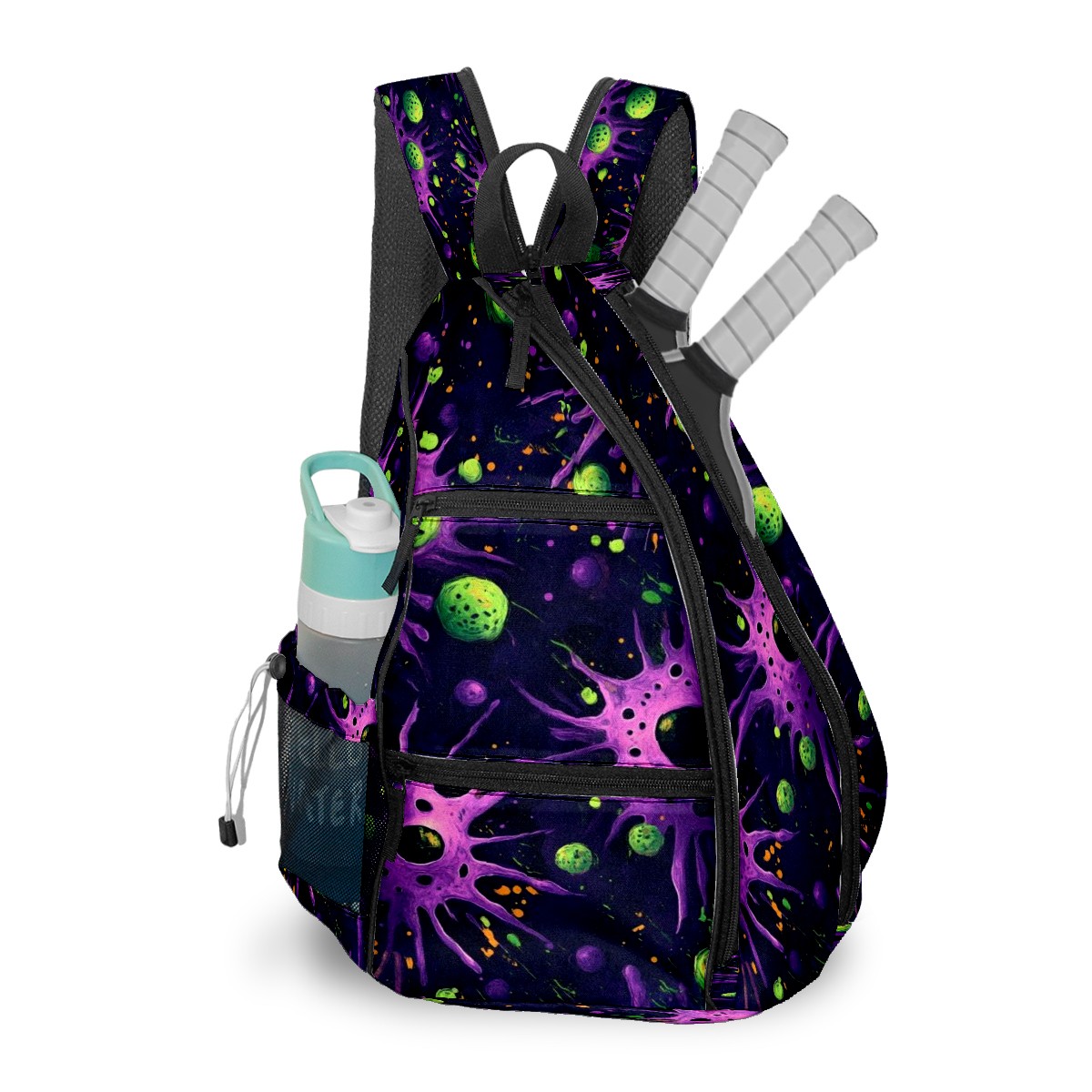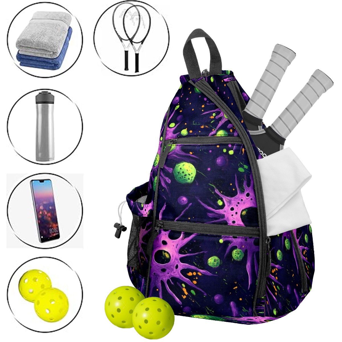 Pickleball Shoulder Bag for Men and Women - Fence Hook - Crossbody Backpack with Water Bottle Holder Purple Planet