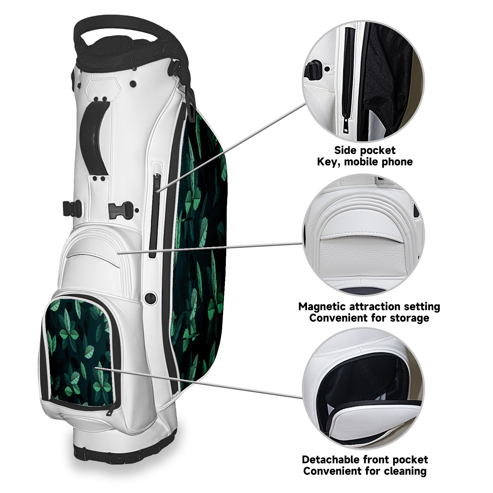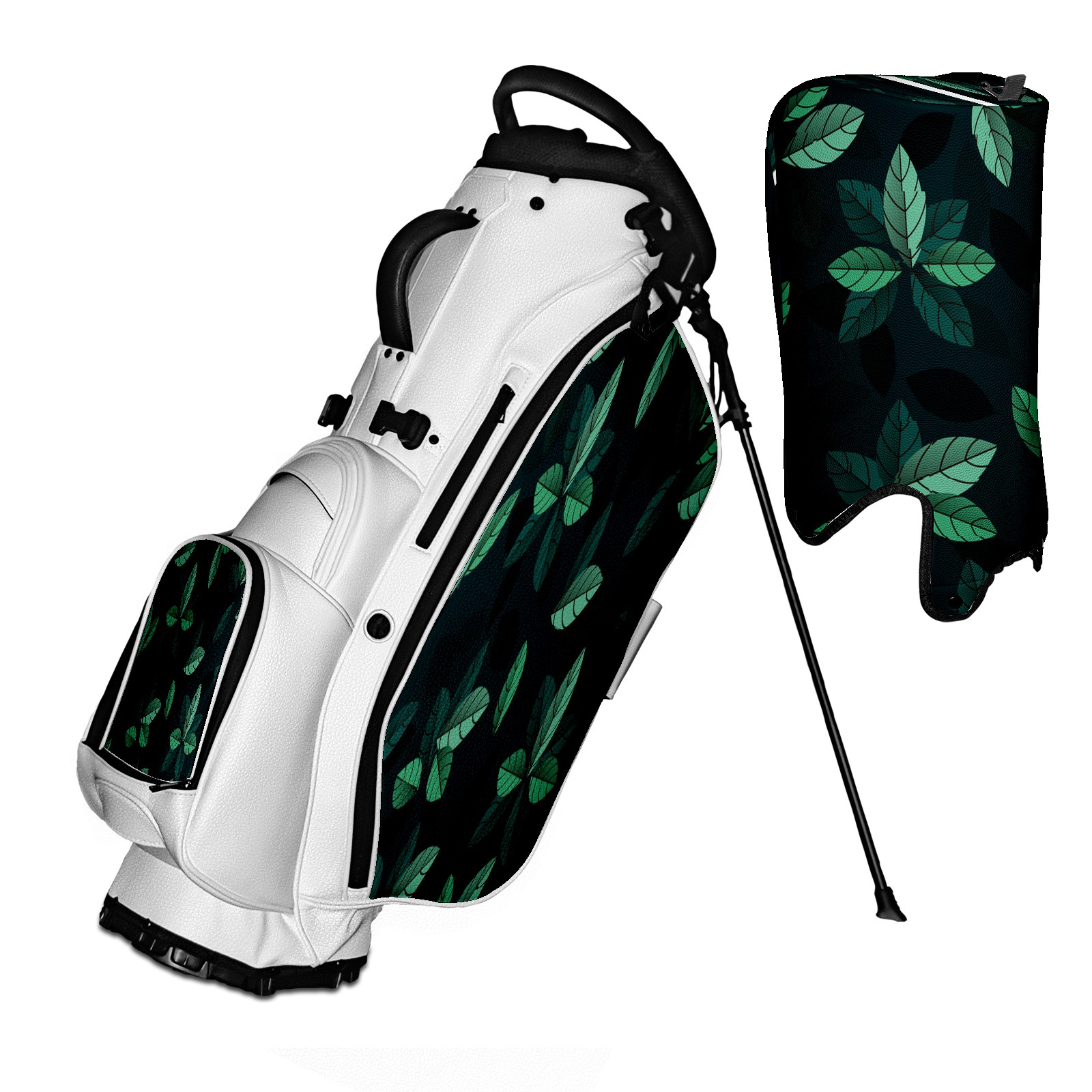 <p>The Golf Stand Bag, designed specifically for golf enthusiasts, offers a choice of 5 - way and 14 - way top dividers. Its 5/14 - compartment design with independent full - size club compartments safeguards clubs from collisions. Equipped with a rain cover, waterproof zippered pockets (tested to resist moderate to heavy rain), and a high - performance cooler pouch that can keep drinks cold for hours, it ensures a convenient golfing experience. The bag features thickened, breathable neoprene shoulder straps and an adjustable chest buckle, reducing shoulder fatigue by 35% compared to regular bags, and its automatic aluminum alloy stand provides stable support on various terrains. Crafted from top - tier, water - resistant litchi - grain PU leather, with double - stitched edges, reliable zippers tested for over 15,000 cycles, and anti - abrasion bottom studs, it guarantees durability. You can personalize it with embroidery on the front pocket and rain cover side (15*15cm area), and it comes in classic black and white, with a matte finish and litchi - grain texture that combines business and leisure styles. Measuring 130 cm in height, 37 cm in width, and 31 cm in depth (including rain cover) and 90 cm x 31 cm x 37 cm (excluding rain cover), it strikes a balance between storage and portability, capable of holding 14 standard - sized clubs and other essentials, and it also includes a dust cover. It's truly the perfect choice for golfers.<br></p>