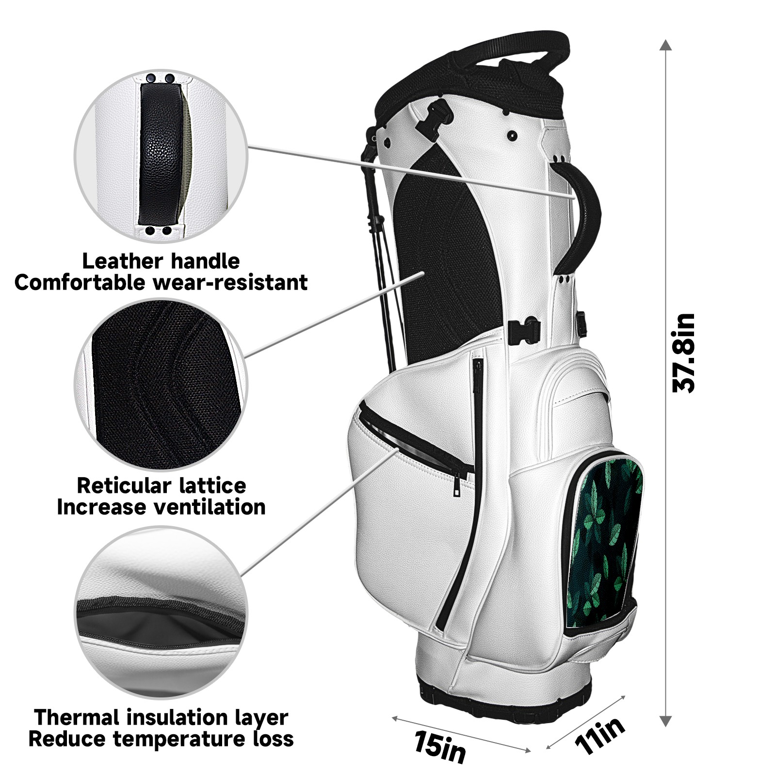 • <p>The Golf Stand Bag, designed specifically for golf enthusiasts, offers a choice of 5 - way and 14 - way top dividers. Its 5/14 - compartment design with independent full - size club compartments safeguards clubs from collisions. Equipped with a rain cover, waterproof zippered pockets (tested to resist moderate to heavy rain), and a high - performance cooler pouch that can keep drinks cold for hours, it ensures a convenient golfing experience. The bag features thickened, breathable neoprene shoulder straps and an adjustable chest buckle, reducing shoulder fatigue by 35% compared to regular bags, and its automatic aluminum alloy stand provides stable support on various terrains. Crafted from top - tier, water - resistant litchi - grain PU leather, with double - stitched edges, reliable zippers tested for over 15,000 cycles, and anti - abrasion bottom studs, it guarantees durability. You can personalize it with embroidery on the front pocket and rain cover side (15*15cm area), and it comes in classic black and white, with a matte finish and litchi - grain texture that combines business and leisure styles. Measuring 130 cm in height, 37 cm in width, and 31 cm in depth (including rain cover) and 90 cm x 31 cm x 37 cm (excluding rain cover), it strikes a balance between storage and portability, capable of holding 14 standard - sized clubs and other essentials, and it also includes a dust cover. It's truly the perfect choice for golfers.<br></p>