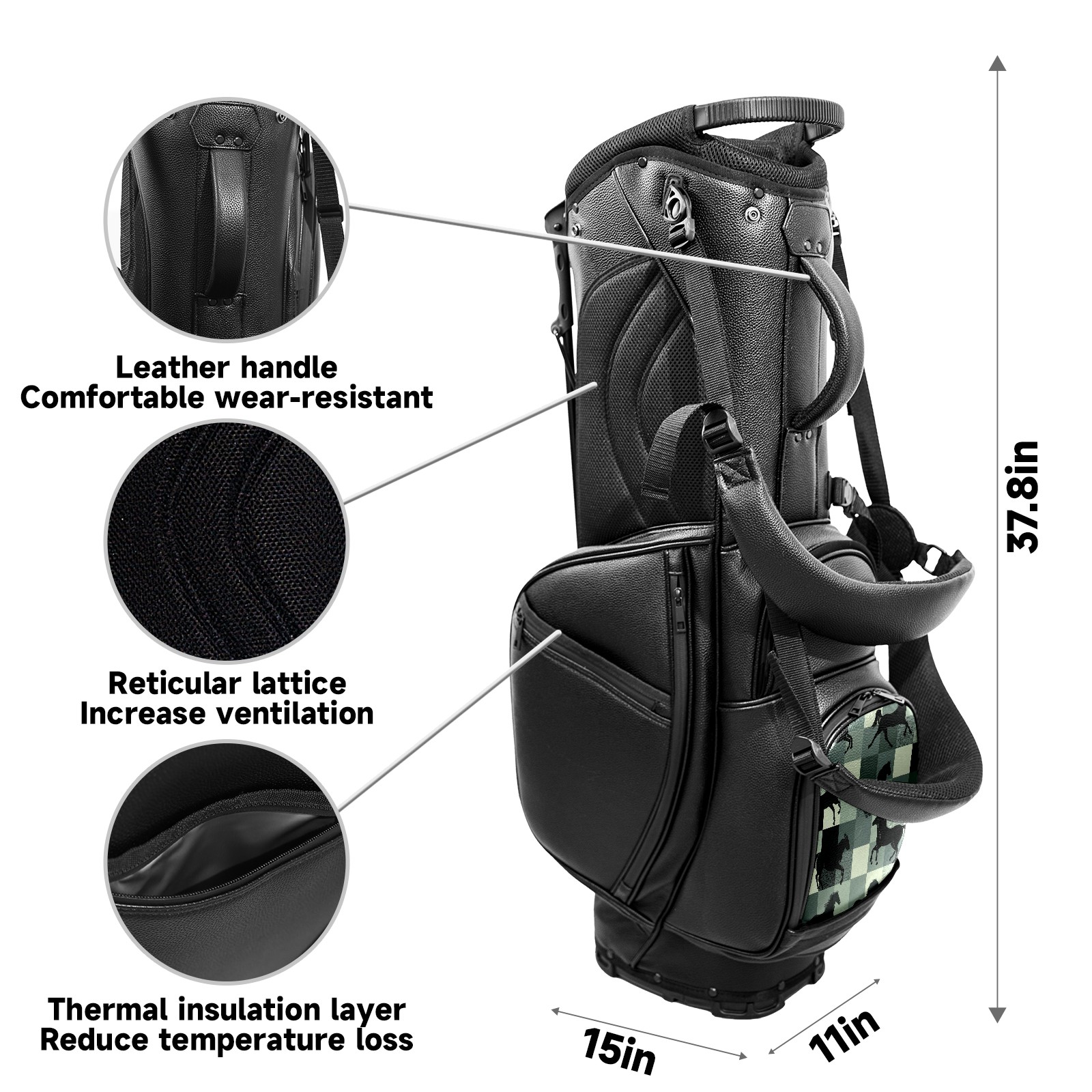 • <p>This golf bag combines versatility, durability, and quality, providing comprehensive protection and easy access for your golf clubs. Its precise dimensions of 130 x 37 x 31 cm (with rain cover) and 90 x 31 x 37 cm (without rain cover) strike the perfect balance between portability and storage capacity.The five-way head frame (with five-way top compartments) allows for strategic compartmentalization, allowing you to neatly organize your various clubs and separate them to protect them from bumps, scratches, and scuffs. Its versatile compartmental design features a spacious five-compartment structure, including a separate, full-size club compartment, to fully accommodate your clubs while protecting their integrity.This bag features a versatile storage system with multiple waterproof zippered pockets for securely storing golf accessories, as well as a dedicated insulated cooler pocket with excellent insulation to keep your drinks cold. The built-in rain cover effectively repels moisture, ensuring your clubs remain dry and protected even in wet weather. For enhanced carrying comfort, this bag features ergonomically designed, padded, breathable, adjustable shoulder straps and an adjustable chest strap to distribute shoulder pressure for easier and more comfortable carrying. A portable rear handle makes lifting and carrying easier.Quality is evident in every detail: double-stitched reinforced edges enhance structural stability, smooth and durable zippers ensure long-lasting reliability, and wear-resistant bottom rivets ensure secure placement on all terrains, effectively preventing wear and tear. Crafted from classic pebbled matte PU fabric, it perfectly complements both business and casual occasions. Available in black and white, it exudes understated elegance and sophistication.This golf bag, with its sturdy plastic base, combines premium quality and durability, making it the ideal companion for every golfer, whether heading to the course for a casual round or attending a business golf event.</p>