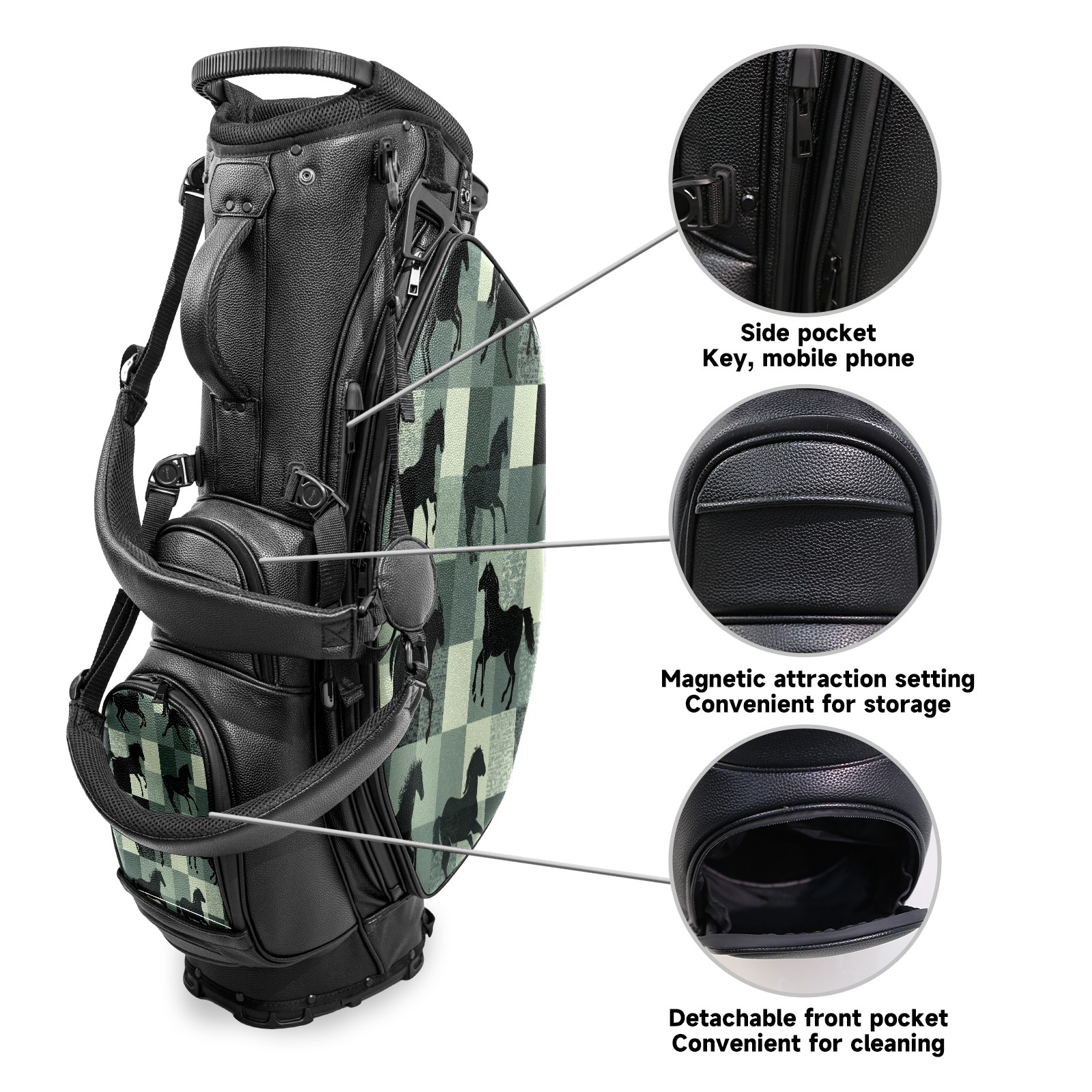 <p>This golf bag combines versatility, durability, and quality, providing comprehensive protection and easy access for your golf clubs. Its precise dimensions of 130 x 37 x 31 cm (with rain cover) and 90 x 31 x 37 cm (without rain cover) strike the perfect balance between portability and storage capacity.The five-way head frame (with five-way top compartments) allows for strategic compartmentalization, allowing you to neatly organize your various clubs and separate them to protect them from bumps, scratches, and scuffs. Its versatile compartmental design features a spacious five-compartment structure, including a separate, full-size club compartment, to fully accommodate your clubs while protecting their integrity.This bag features a versatile storage system with multiple waterproof zippered pockets for securely storing golf accessories, as well as a dedicated insulated cooler pocket with excellent insulation to keep your drinks cold. The built-in rain cover effectively repels moisture, ensuring your clubs remain dry and protected even in wet weather. For enhanced carrying comfort, this bag features ergonomically designed, padded, breathable, adjustable shoulder straps and an adjustable chest strap to distribute shoulder pressure for easier and more comfortable carrying. A portable rear handle makes lifting and carrying easier.Quality is evident in every detail: double-stitched reinforced edges enhance structural stability, smooth and durable zippers ensure long-lasting reliability, and wear-resistant bottom rivets ensure secure placement on all terrains, effectively preventing wear and tear. Crafted from classic pebbled matte PU fabric, it perfectly complements both business and casual occasions. Available in black and white, it exudes understated elegance and sophistication.This golf bag, with its sturdy plastic base, combines premium quality and durability, making it the ideal companion for every golfer, whether heading to the course for a casual round or attending a business golf event.</p>