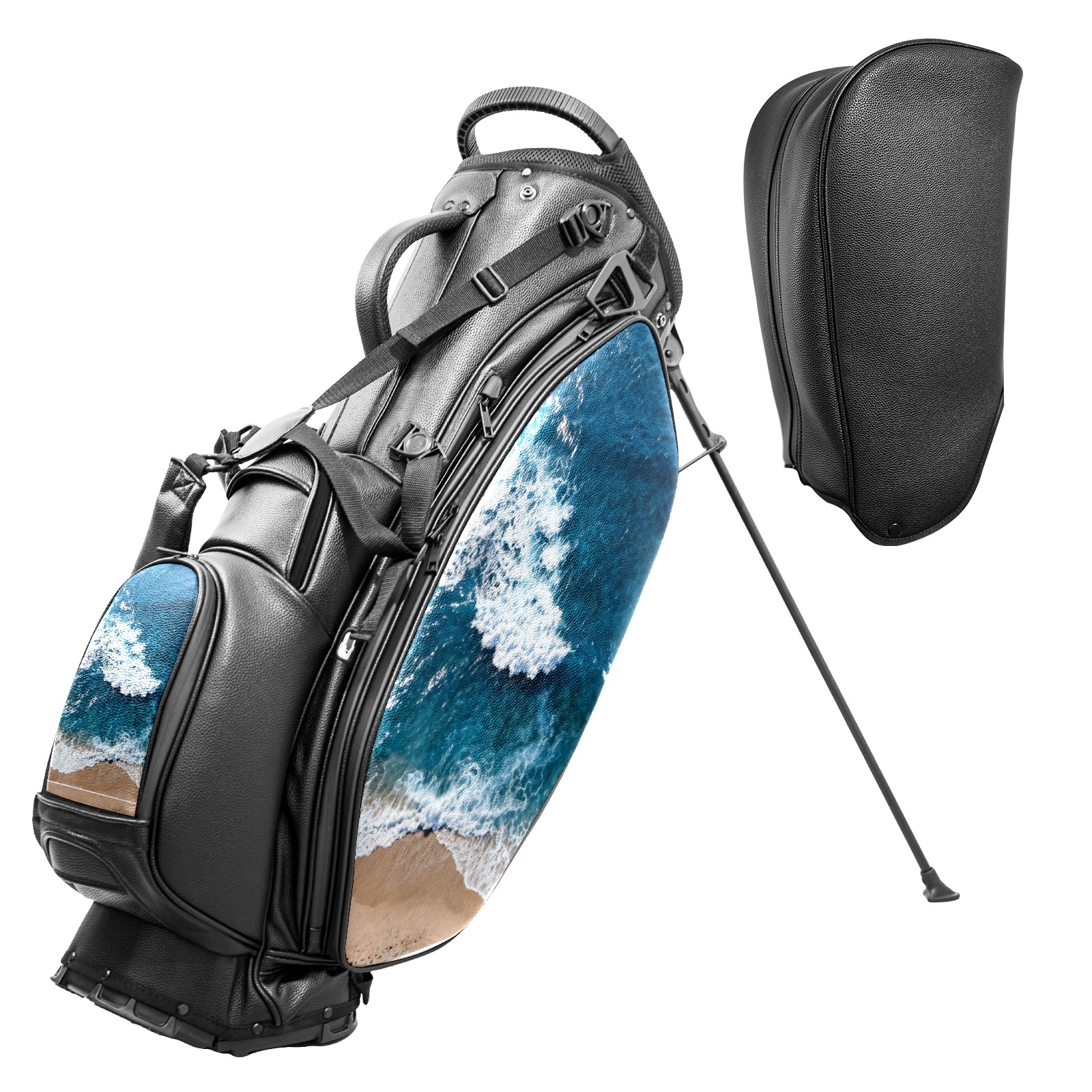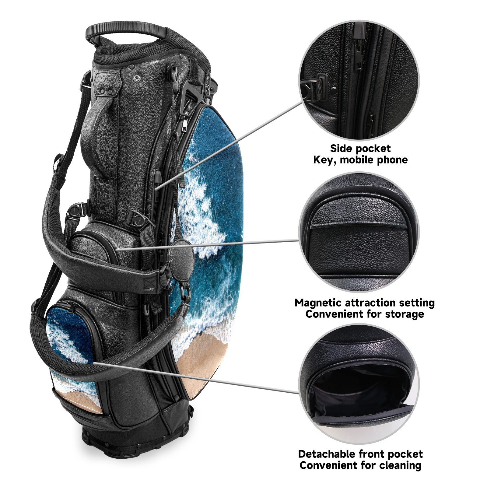 • <p>This golf bag combines versatility, durability, and quality, providing comprehensive protection and easy access for your golf clubs. Its precise dimensions of 130 x 37 x 31 cm (with rain cover) and 90 x 31 x 37 cm (without rain cover) strike the perfect balance between portability and storage capacity.The five-way head frame (with five-way top compartments) allows for strategic compartmentalization, allowing you to neatly organize your various clubs and separate them to protect them from bumps, scratches, and scuffs. Its versatile compartmental design features a spacious five-compartment structure, including a separate, full-size club compartment, to fully accommodate your clubs while protecting their integrity.This bag features a versatile storage system with multiple waterproof zippered pockets for securely storing golf accessories, as well as a dedicated insulated cooler pocket with excellent insulation to keep your drinks cold. The built-in rain cover effectively repels moisture, ensuring your clubs remain dry and protected even in wet weather. For enhanced carrying comfort, this bag features ergonomically designed, padded, breathable, adjustable shoulder straps and an adjustable chest strap to distribute shoulder pressure for easier and more comfortable carrying. A portable rear handle makes lifting and carrying easier.Quality is evident in every detail: double-stitched reinforced edges enhance structural stability, smooth and durable zippers ensure long-lasting reliability, and wear-resistant bottom rivets ensure secure placement on all terrains, effectively preventing wear and tear. Crafted from classic pebbled matte PU fabric, it perfectly complements both business and casual occasions. Available in black and white, it exudes understated elegance and sophistication.This golf bag, with its sturdy plastic base, combines premium quality and durability, making it the ideal companion for every golfer, whether heading to the course for a casual round or attending a business golf event.</p>