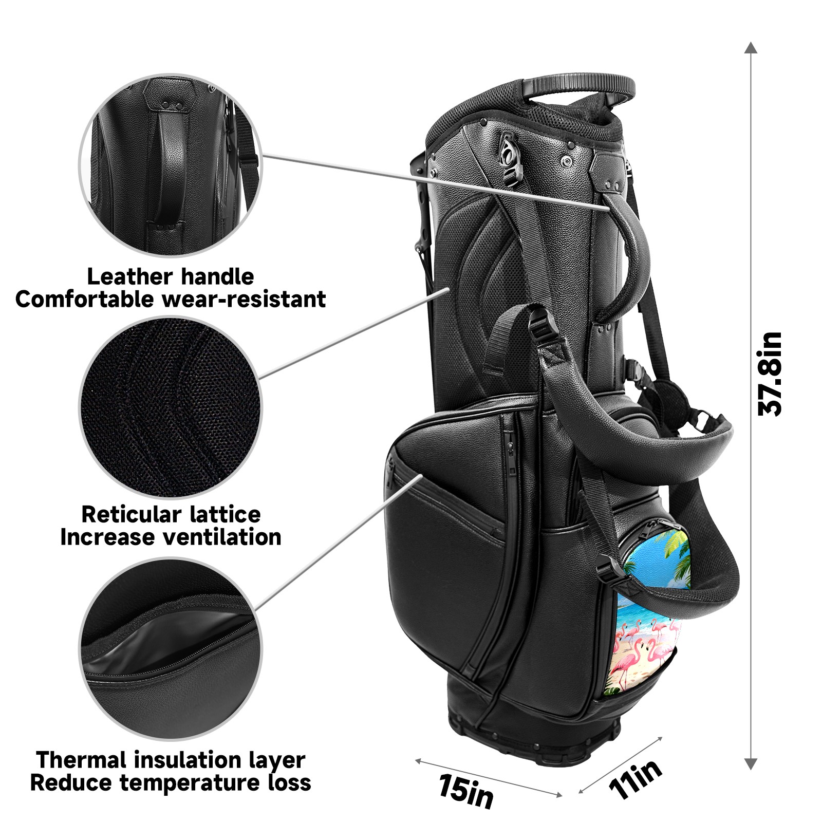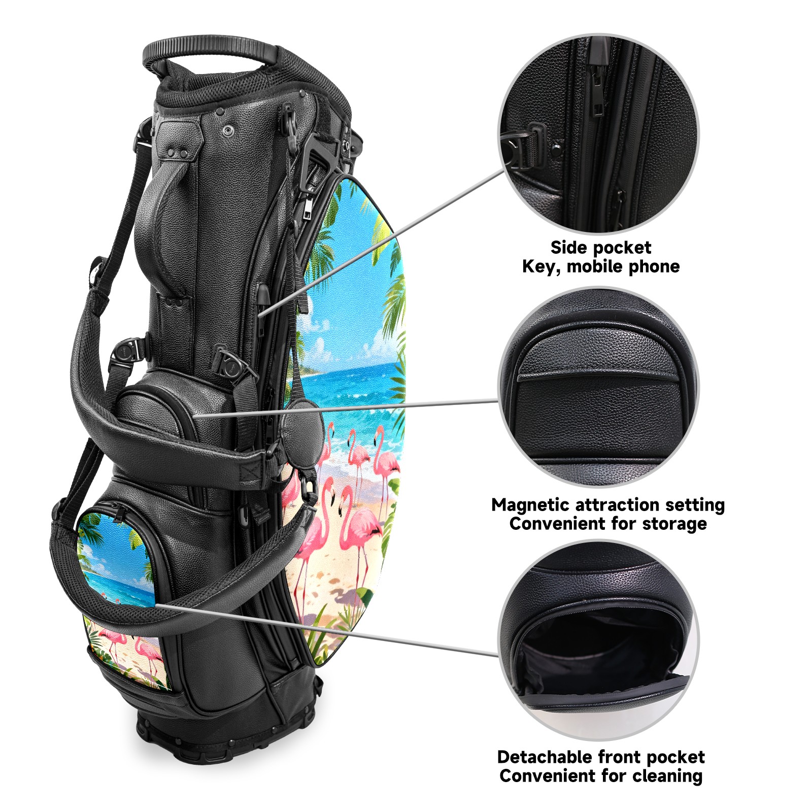 • <p>This golf bag combines versatility, durability, and quality, providing comprehensive protection and easy access for your golf clubs. Its precise dimensions of 130 x 37 x 31 cm (with rain cover) and 90 x 31 x 37 cm (without rain cover) strike the perfect balance between portability and storage capacity.The five-way head frame (with five-way top compartments) allows for strategic compartmentalization, allowing you to neatly organize your various clubs and separate them to protect them from bumps, scratches, and scuffs. Its versatile compartmental design features a spacious five-compartment structure, including a separate, full-size club compartment, to fully accommodate your clubs while protecting their integrity.This bag features a versatile storage system with multiple waterproof zippered pockets for securely storing golf accessories, as well as a dedicated insulated cooler pocket with excellent insulation to keep your drinks cold. The built-in rain cover effectively repels moisture, ensuring your clubs remain dry and protected even in wet weather. For enhanced carrying comfort, this bag features ergonomically designed, padded, breathable, adjustable shoulder straps and an adjustable chest strap to distribute shoulder pressure for easier and more comfortable carrying. A portable rear handle makes lifting and carrying easier.Quality is evident in every detail: double-stitched reinforced edges enhance structural stability, smooth and durable zippers ensure long-lasting reliability, and wear-resistant bottom rivets ensure secure placement on all terrains, effectively preventing wear and tear. Crafted from classic pebbled matte PU fabric, it perfectly complements both business and casual occasions. Available in black and white, it exudes understated elegance and sophistication.This golf bag, with its sturdy plastic base, combines premium quality and durability, making it the ideal companion for every golfer, whether heading to the course for a casual round or attending a business golf event.</p>