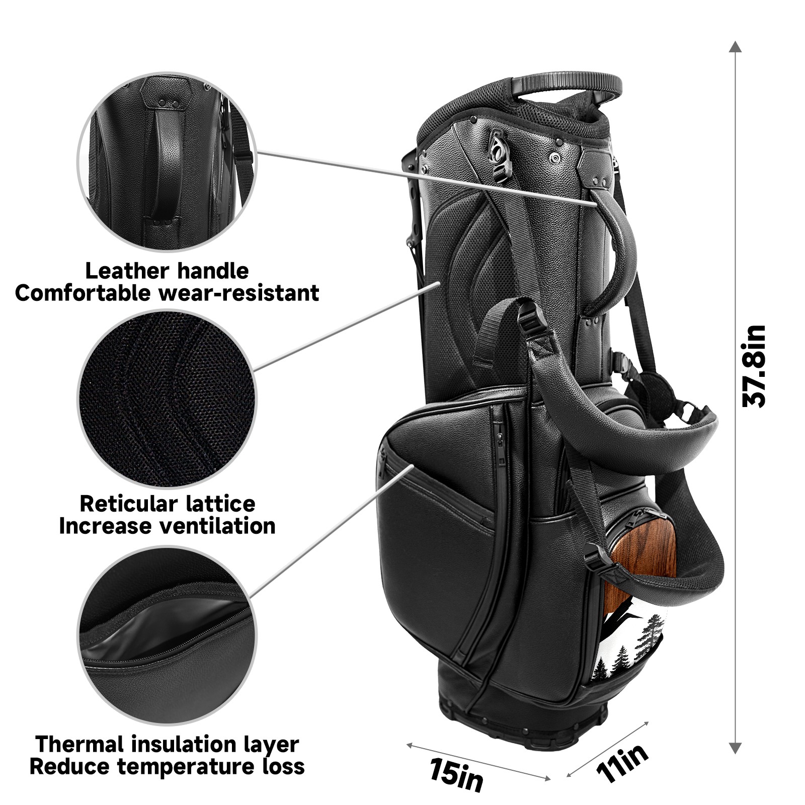 <p>This golf bag combines versatility, durability, and quality, providing comprehensive protection and easy access for your golf clubs. Its precise dimensions of 130 x 37 x 31 cm (with rain cover) and 90 x 31 x 37 cm (without rain cover) strike the perfect balance between portability and storage capacity.The five-way head frame (with five-way top compartments) allows for strategic compartmentalization, allowing you to neatly organize your various clubs and separate them to protect them from bumps, scratches, and scuffs. Its versatile compartmental design features a spacious five-compartment structure, including a separate, full-size club compartment, to fully accommodate your clubs while protecting their integrity.This bag features a versatile storage system with multiple waterproof zippered pockets for securely storing golf accessories, as well as a dedicated insulated cooler pocket with excellent insulation to keep your drinks cold. The built-in rain cover effectively repels moisture, ensuring your clubs remain dry and protected even in wet weather. For enhanced carrying comfort, this bag features ergonomically designed, padded, breathable, adjustable shoulder straps and an adjustable chest strap to distribute shoulder pressure for easier and more comfortable carrying. A portable rear handle makes lifting and carrying easier.Quality is evident in every detail: double-stitched reinforced edges enhance structural stability, smooth and durable zippers ensure long-lasting reliability, and wear-resistant bottom rivets ensure secure placement on all terrains, effectively preventing wear and tear. Crafted from classic pebbled matte PU fabric, it perfectly complements both business and casual occasions. Available in black and white, it exudes understated elegance and sophistication.This golf bag, with its sturdy plastic base, combines premium quality and durability, making it the ideal companion for every golfer, whether heading to the course for a casual round or attending a business golf event.</p>