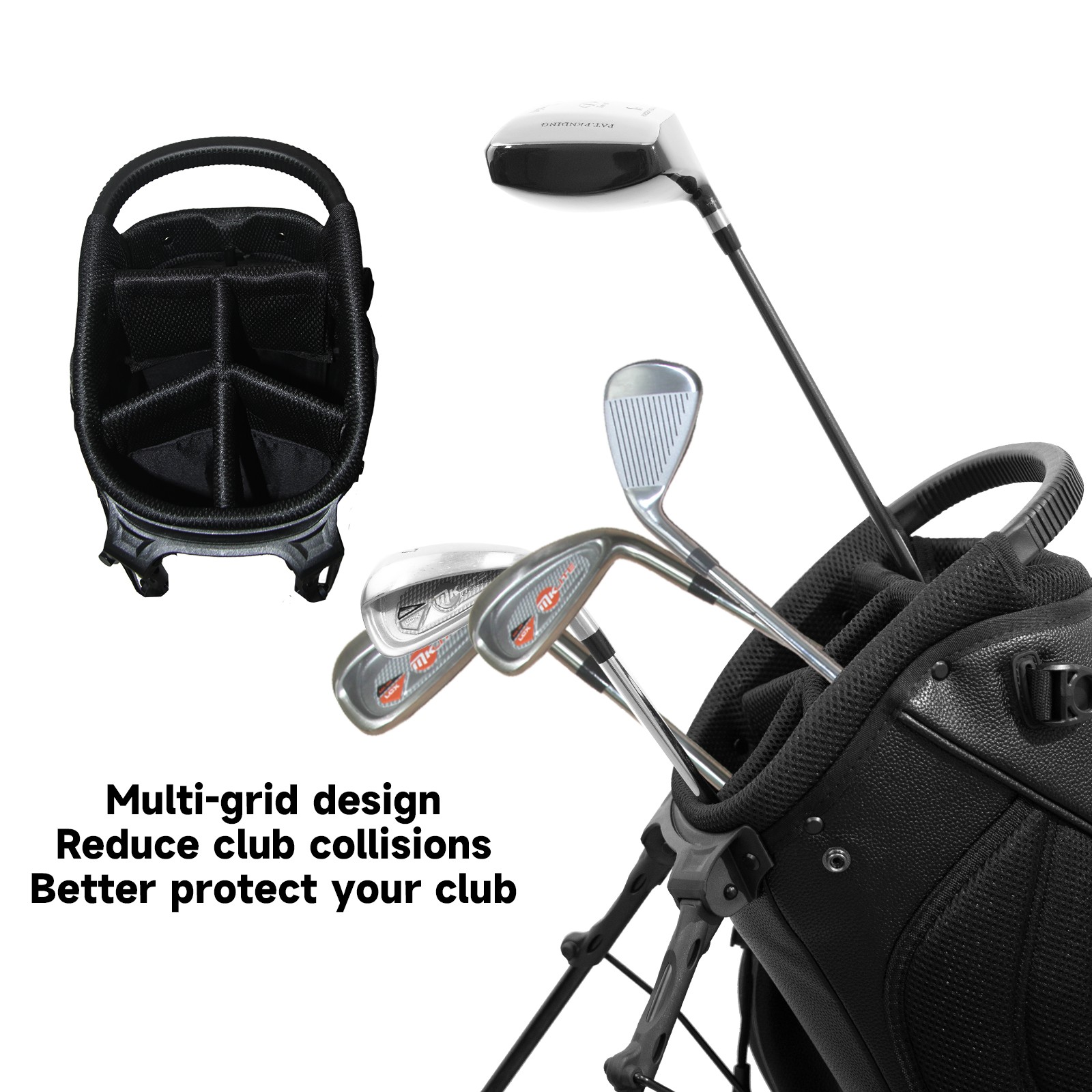 <p>This golf bag combines versatility, durability, and quality, providing comprehensive protection and easy access for your golf clubs. Its precise dimensions of 130 x 37 x 31 cm (with rain cover) and 90 x 31 x 37 cm (without rain cover) strike the perfect balance between portability and storage capacity.The five-way head frame (with five-way top compartments) allows for strategic compartmentalization, allowing you to neatly organize your various clubs and separate them to protect them from bumps, scratches, and scuffs. Its versatile compartmental design features a spacious five-compartment structure, including a separate, full-size club compartment, to fully accommodate your clubs while protecting their integrity.This bag features a versatile storage system with multiple waterproof zippered pockets for securely storing golf accessories, as well as a dedicated insulated cooler pocket with excellent insulation to keep your drinks cold. The built-in rain cover effectively repels moisture, ensuring your clubs remain dry and protected even in wet weather. For enhanced carrying comfort, this bag features ergonomically designed, padded, breathable, adjustable shoulder straps and an adjustable chest strap to distribute shoulder pressure for easier and more comfortable carrying. A portable rear handle makes lifting and carrying easier.Quality is evident in every detail: double-stitched reinforced edges enhance structural stability, smooth and durable zippers ensure long-lasting reliability, and wear-resistant bottom rivets ensure secure placement on all terrains, effectively preventing wear and tear. Crafted from classic pebbled matte PU fabric, it perfectly complements both business and casual occasions. Available in black and white, it exudes understated elegance and sophistication.This golf bag, with its sturdy plastic base, combines premium quality and durability, making it the ideal companion for every golfer, whether heading to the course for a casual round or attending a business golf event.</p>