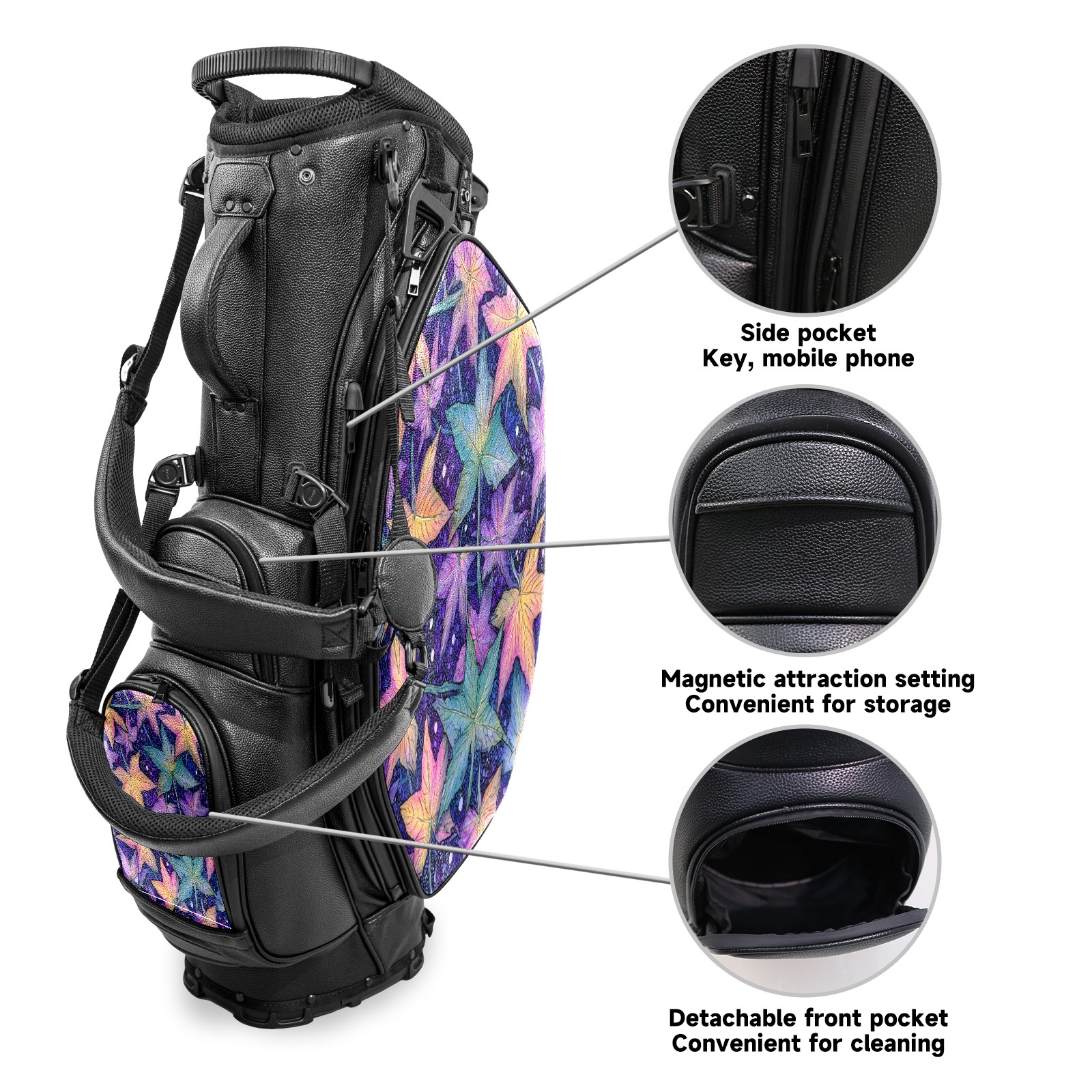 • <p>This golf bag combines versatility, durability, and quality, providing comprehensive protection and easy access for your golf clubs. Its precise dimensions of 130 x 37 x 31 cm (with rain cover) and 90 x 31 x 37 cm (without rain cover) strike the perfect balance between portability and storage capacity.The five-way head frame (with five-way top compartments) allows for strategic compartmentalization, allowing you to neatly organize your various clubs and separate them to protect them from bumps, scratches, and scuffs. Its versatile compartmental design features a spacious five-compartment structure, including a separate, full-size club compartment, to fully accommodate your clubs while protecting their integrity.This bag features a versatile storage system with multiple waterproof zippered pockets for securely storing golf accessories, as well as a dedicated insulated cooler pocket with excellent insulation to keep your drinks cold. The built-in rain cover effectively repels moisture, ensuring your clubs remain dry and protected even in wet weather. For enhanced carrying comfort, this bag features ergonomically designed, padded, breathable, adjustable shoulder straps and an adjustable chest strap to distribute shoulder pressure for easier and more comfortable carrying. A portable rear handle makes lifting and carrying easier.Quality is evident in every detail: double-stitched reinforced edges enhance structural stability, smooth and durable zippers ensure long-lasting reliability, and wear-resistant bottom rivets ensure secure placement on all terrains, effectively preventing wear and tear. Crafted from classic pebbled matte PU fabric, it perfectly complements both business and casual occasions. Available in black and white, it exudes understated elegance and sophistication.This golf bag, with its sturdy plastic base, combines premium quality and durability, making it the ideal companion for every golfer, whether heading to the course for a casual round or attending a business golf event.</p>