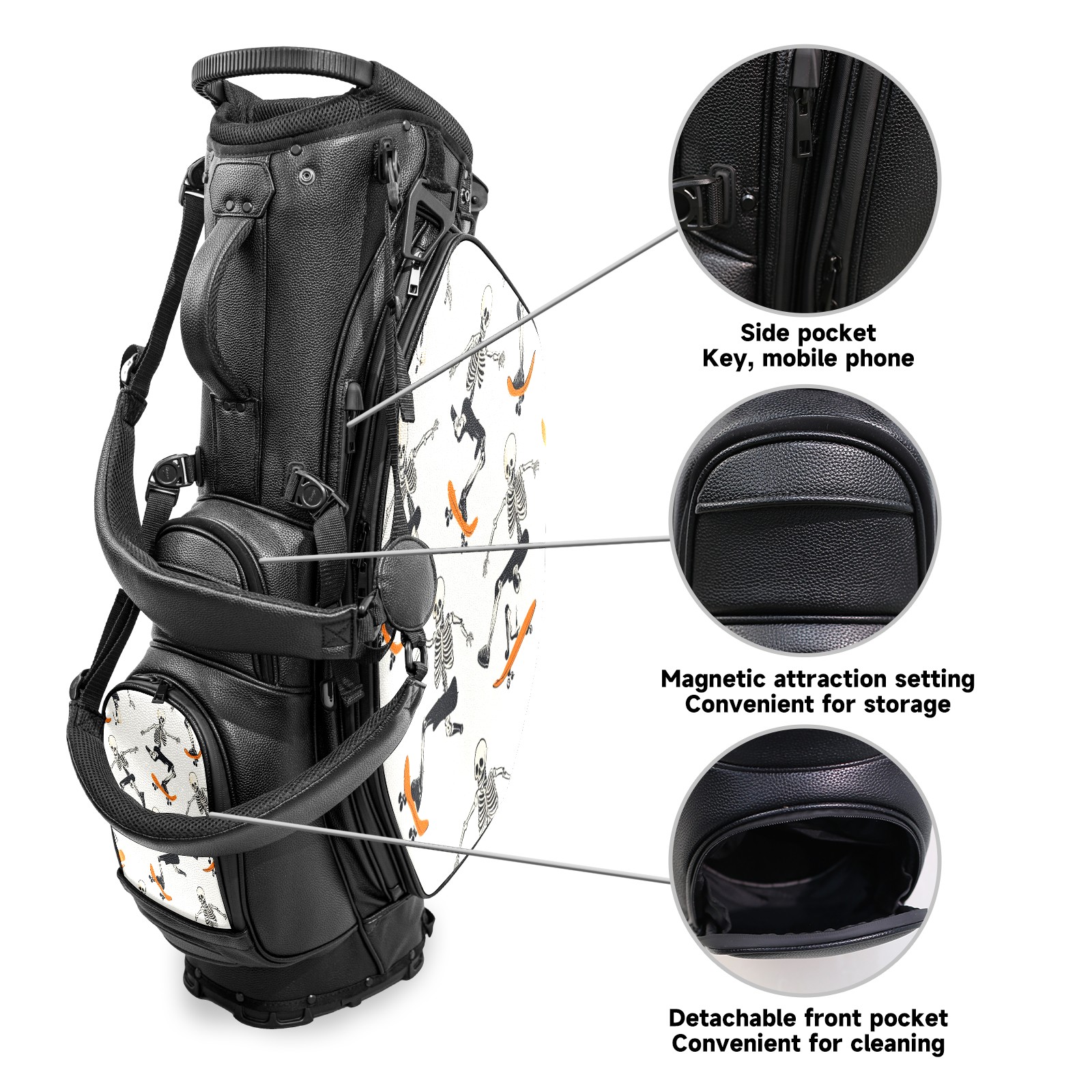 • <p>This golf bag combines versatility, durability, and quality, providing comprehensive protection and easy access for your golf clubs. Its precise dimensions of 130 x 37 x 31 cm (with rain cover) and 90 x 31 x 37 cm (without rain cover) strike the perfect balance between portability and storage capacity.The five-way head frame (with five-way top compartments) allows for strategic compartmentalization, allowing you to neatly organize your various clubs and separate them to protect them from bumps, scratches, and scuffs. Its versatile compartmental design features a spacious five-compartment structure, including a separate, full-size club compartment, to fully accommodate your clubs while protecting their integrity.This bag features a versatile storage system with multiple waterproof zippered pockets for securely storing golf accessories, as well as a dedicated insulated cooler pocket with excellent insulation to keep your drinks cold. The built-in rain cover effectively repels moisture, ensuring your clubs remain dry and protected even in wet weather. For enhanced carrying comfort, this bag features ergonomically designed, padded, breathable, adjustable shoulder straps and an adjustable chest strap to distribute shoulder pressure for easier and more comfortable carrying. A portable rear handle makes lifting and carrying easier.Quality is evident in every detail: double-stitched reinforced edges enhance structural stability, smooth and durable zippers ensure long-lasting reliability, and wear-resistant bottom rivets ensure secure placement on all terrains, effectively preventing wear and tear. Crafted from classic pebbled matte PU fabric, it perfectly complements both business and casual occasions. Available in black and white, it exudes understated elegance and sophistication.This golf bag, with its sturdy plastic base, combines premium quality and durability, making it the ideal companion for every golfer, whether heading to the course for a casual round or attending a business golf event.</p>
