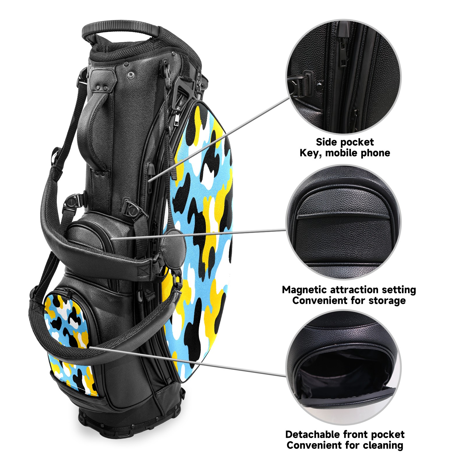 • <p>This golf bag combines versatility, durability, and quality, providing comprehensive protection and easy access for your golf clubs. Its precise dimensions of 130 x 37 x 31 cm (with rain cover) and 90 x 31 x 37 cm (without rain cover) strike the perfect balance between portability and storage capacity.The five-way head frame (with five-way top compartments) allows for strategic compartmentalization, allowing you to neatly organize your various clubs and separate them to protect them from bumps, scratches, and scuffs. Its versatile compartmental design features a spacious five-compartment structure, including a separate, full-size club compartment, to fully accommodate your clubs while protecting their integrity.This bag features a versatile storage system with multiple waterproof zippered pockets for securely storing golf accessories, as well as a dedicated insulated cooler pocket with excellent insulation to keep your drinks cold. The built-in rain cover effectively repels moisture, ensuring your clubs remain dry and protected even in wet weather. For enhanced carrying comfort, this bag features ergonomically designed, padded, breathable, adjustable shoulder straps and an adjustable chest strap to distribute shoulder pressure for easier and more comfortable carrying. A portable rear handle makes lifting and carrying easier.Quality is evident in every detail: double-stitched reinforced edges enhance structural stability, smooth and durable zippers ensure long-lasting reliability, and wear-resistant bottom rivets ensure secure placement on all terrains, effectively preventing wear and tear. Crafted from classic pebbled matte PU fabric, it perfectly complements both business and casual occasions. Available in black and white, it exudes understated elegance and sophistication.This golf bag, with its sturdy plastic base, combines premium quality and durability, making it the ideal companion for every golfer, whether heading to the course for a casual round or attending a business golf event.</p>