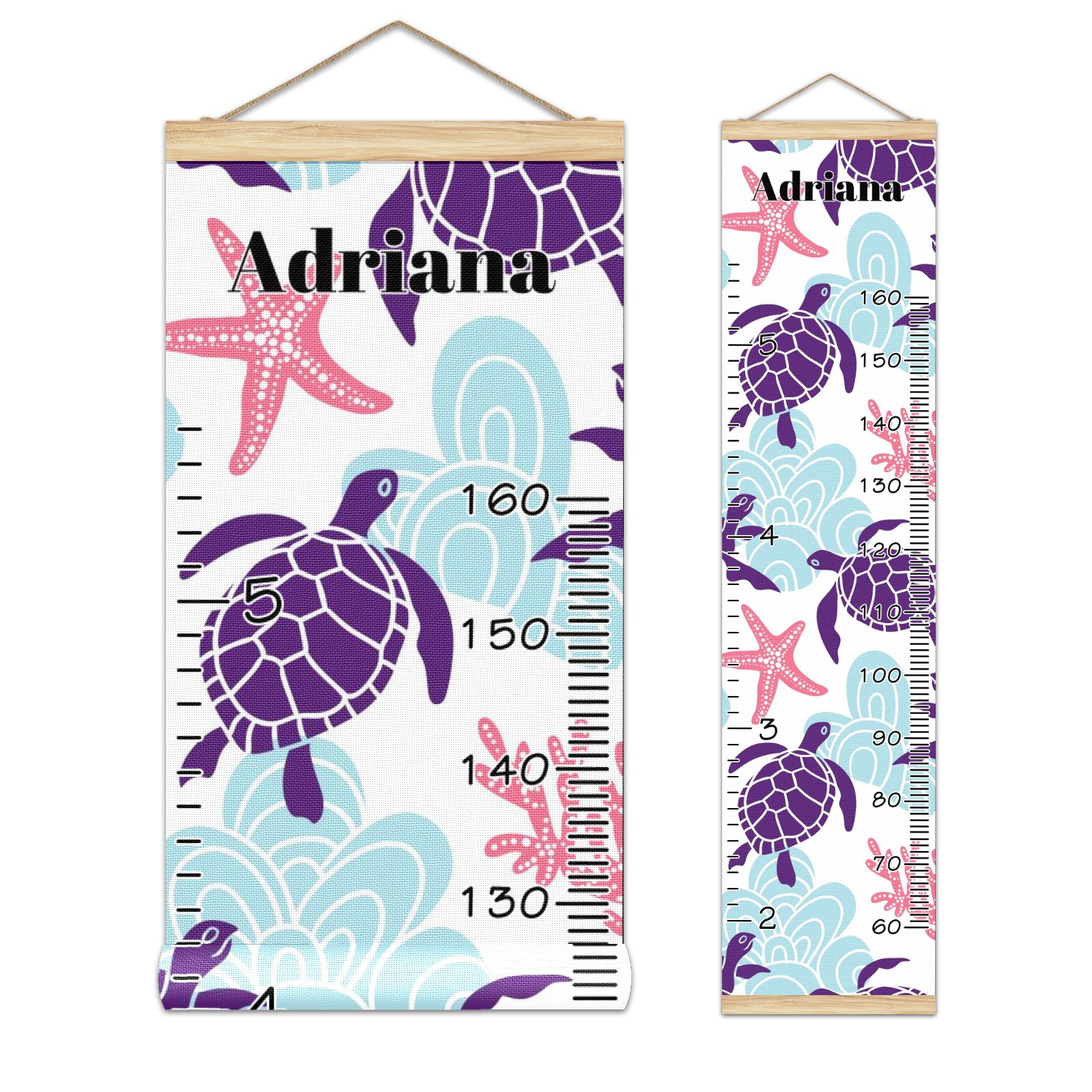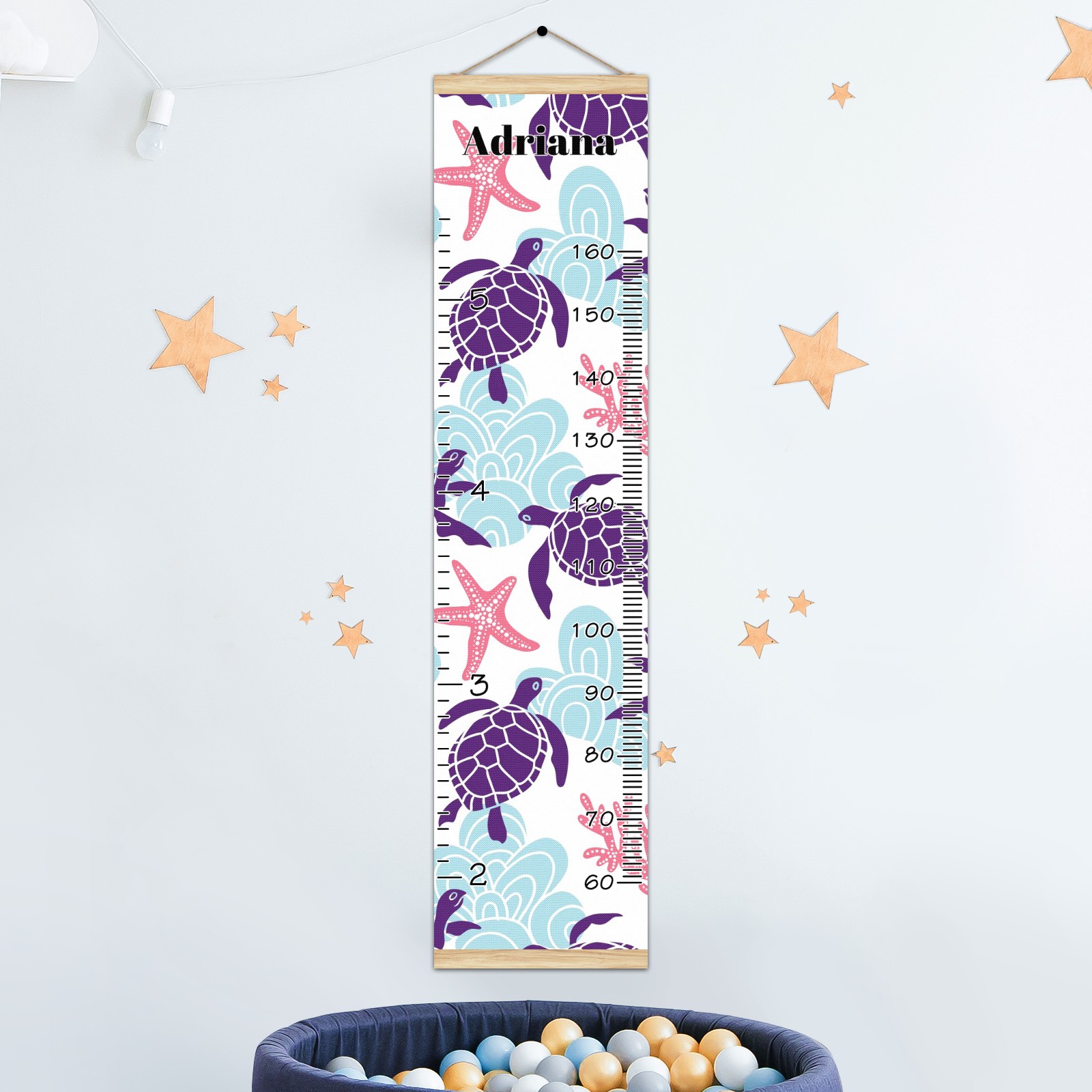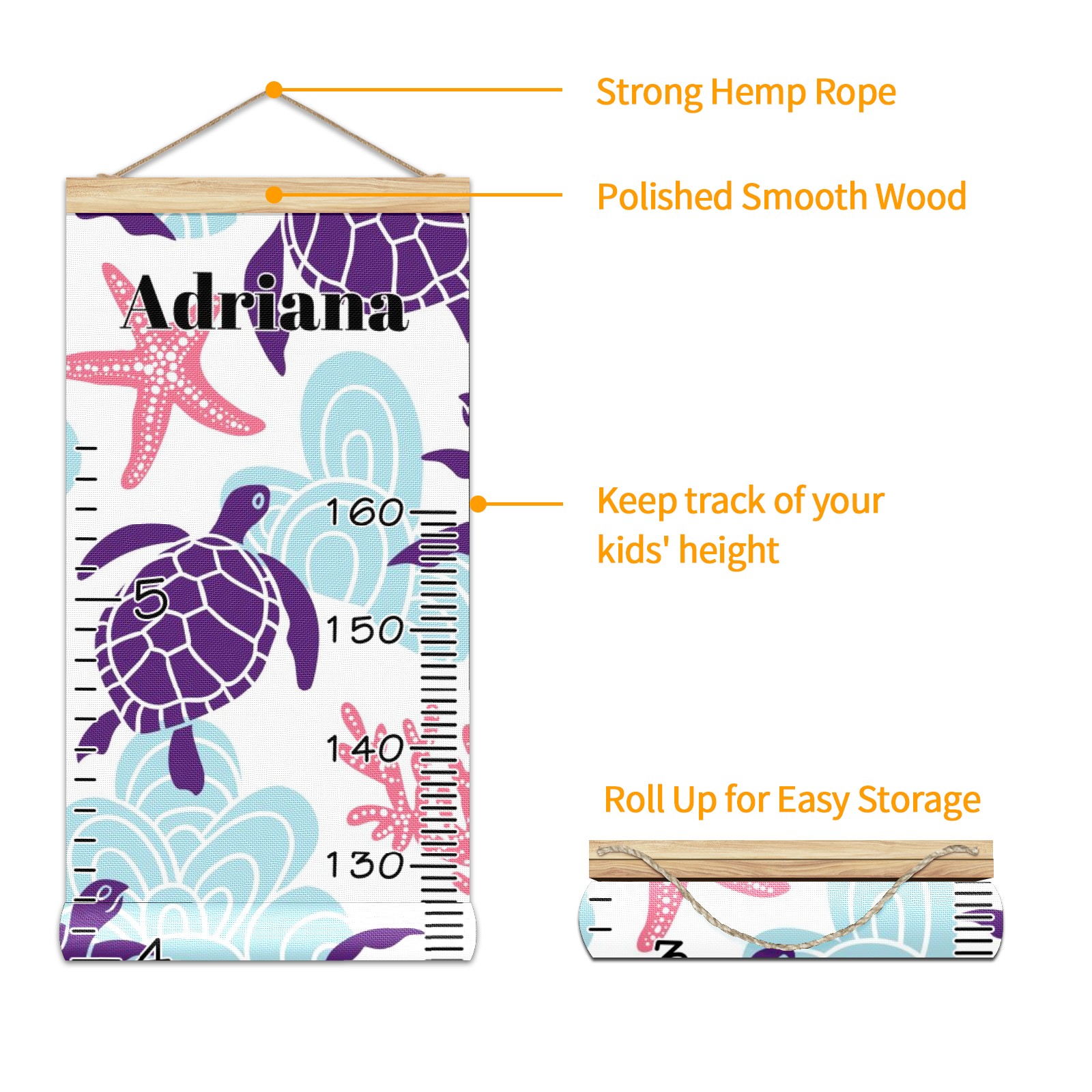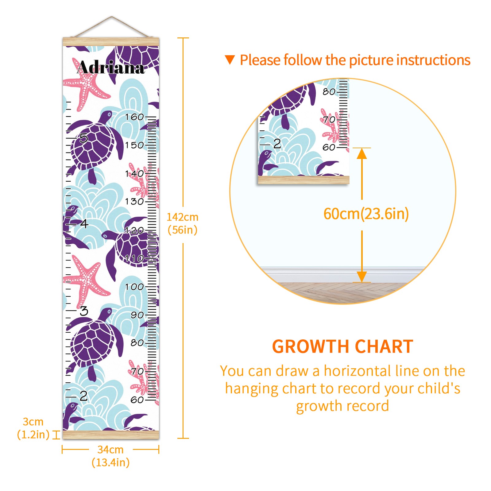 Personalized Kids Name Growth Chart Ruler for Wall Wood Frame Canvas Height Measure Chart 13.4x56 in Hanging Growth Chart Sea Turtle Starfish Coral12.3 Boys Girls Room Decor