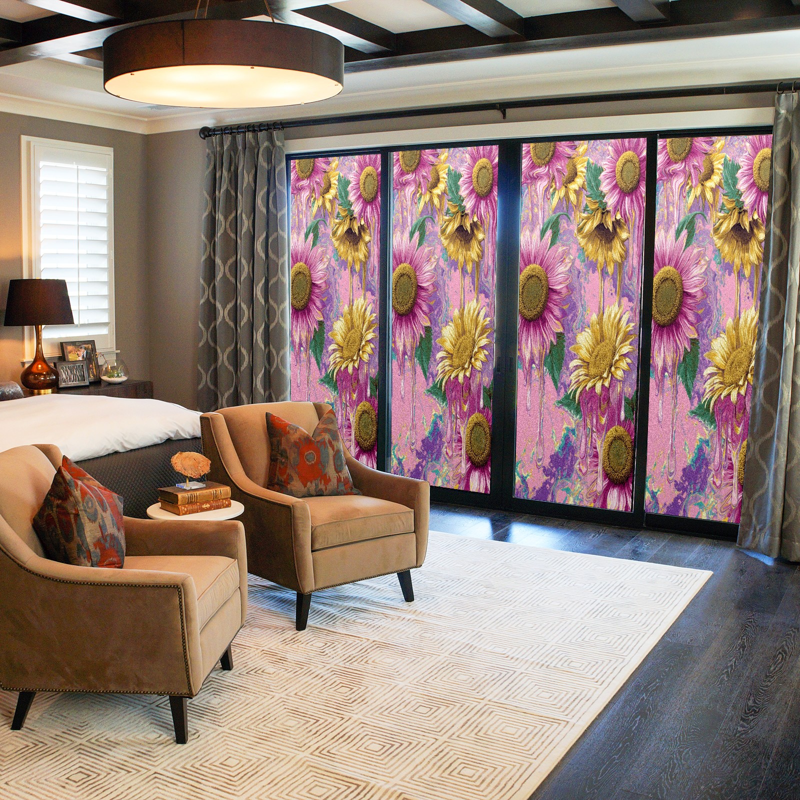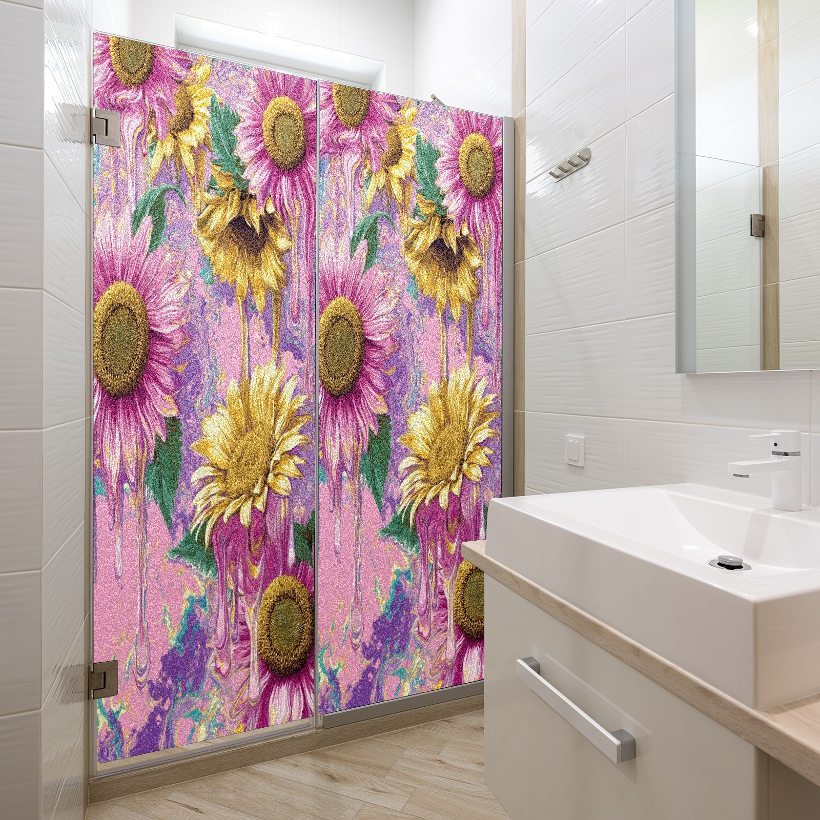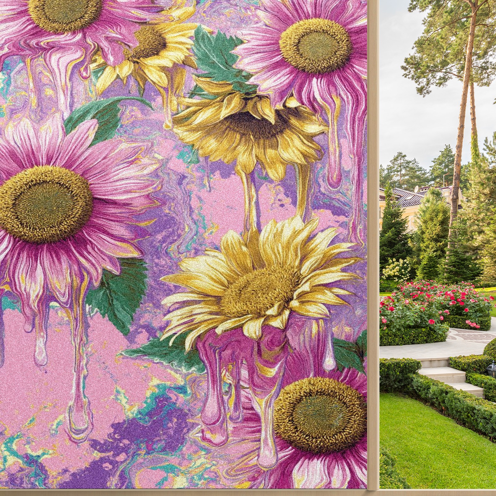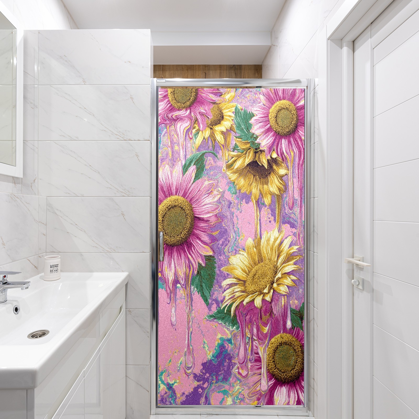 Window Privacy Film Frosted Stained Glass Film Decorative Static Cling for Bathroom Home Office Peel and Stick Window Film Oil Painting Art - Pink Sunflowers(17.7x23.6in)