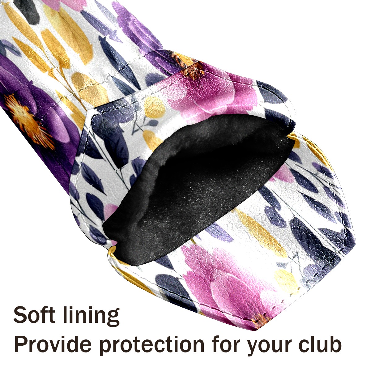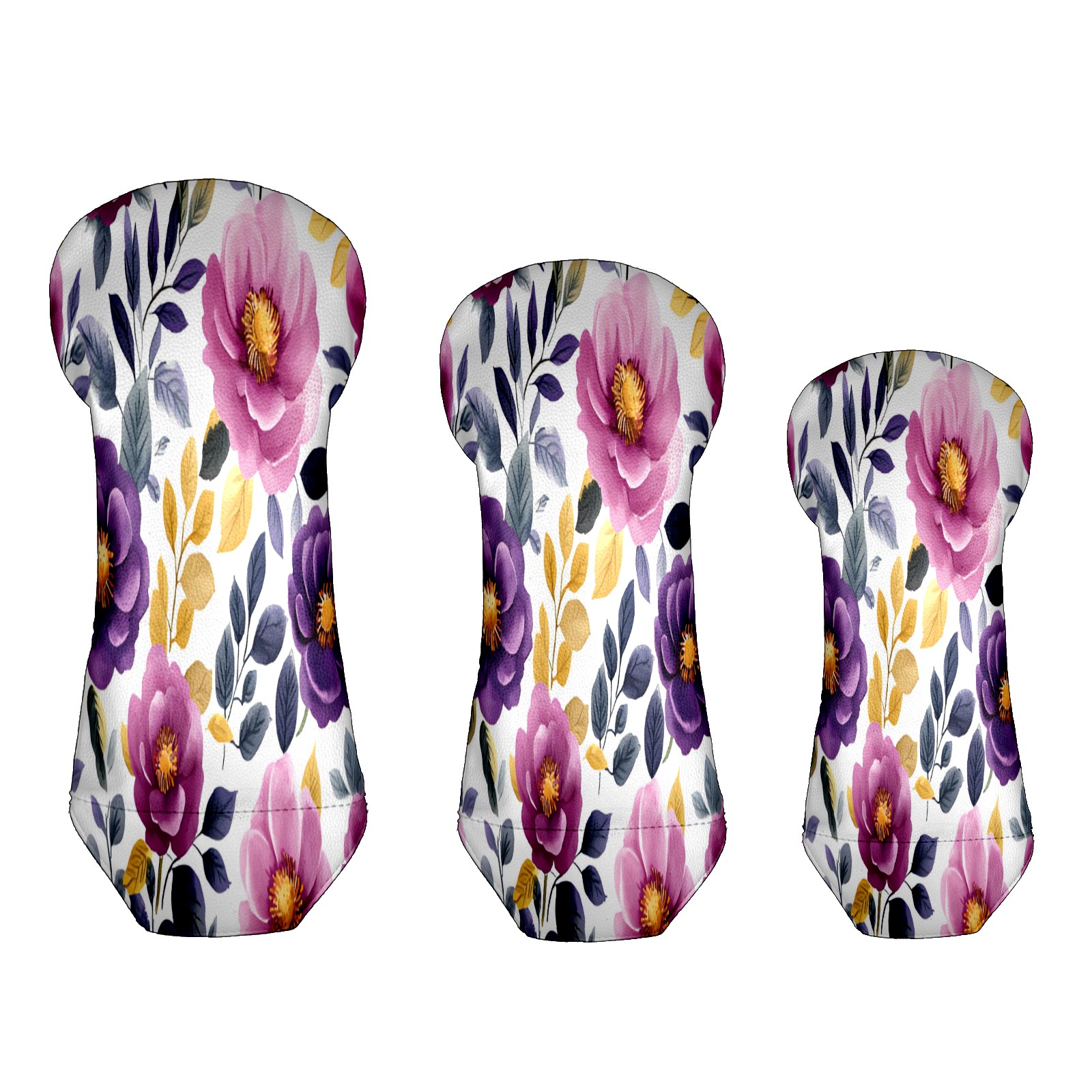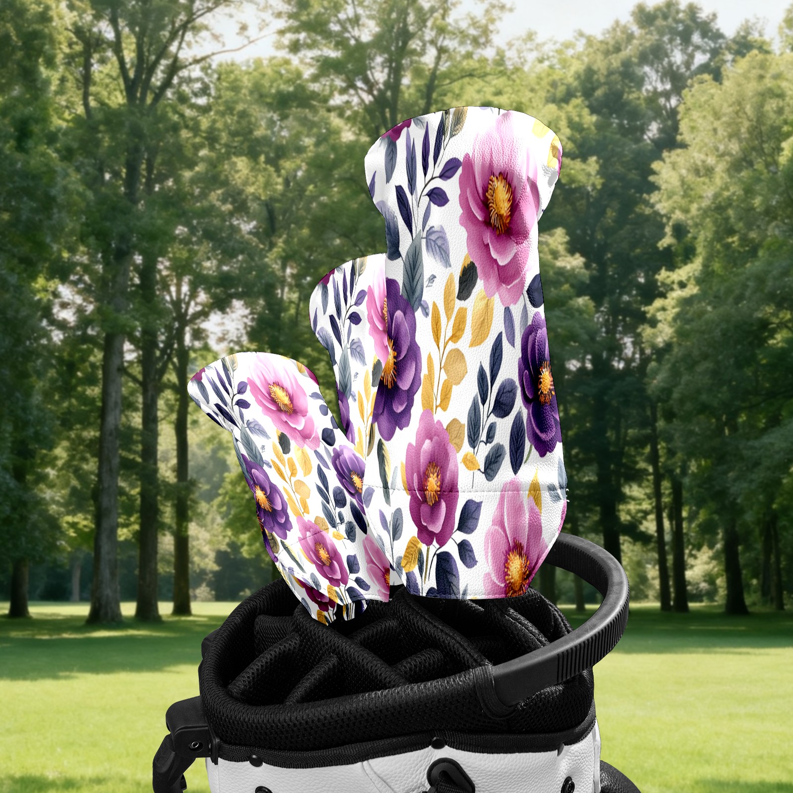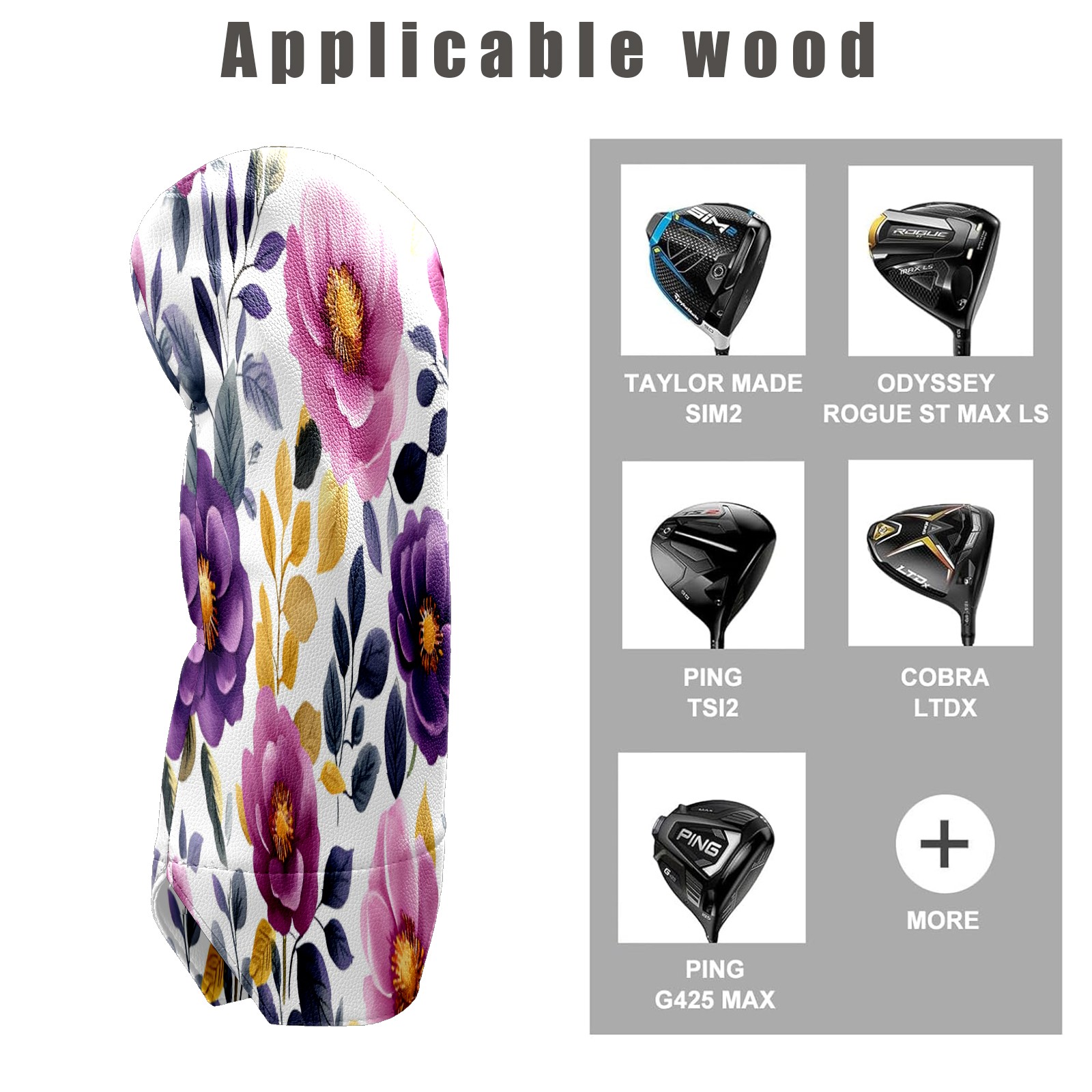 Funny Purple Flowers Golf Head Covers for Driver, Fairway, Hybrid & 3 Wood Premium PU Leather with Soft Velvet Lining Waterproof & Scratch-Resistant Unique Golf Gift for Men & Women