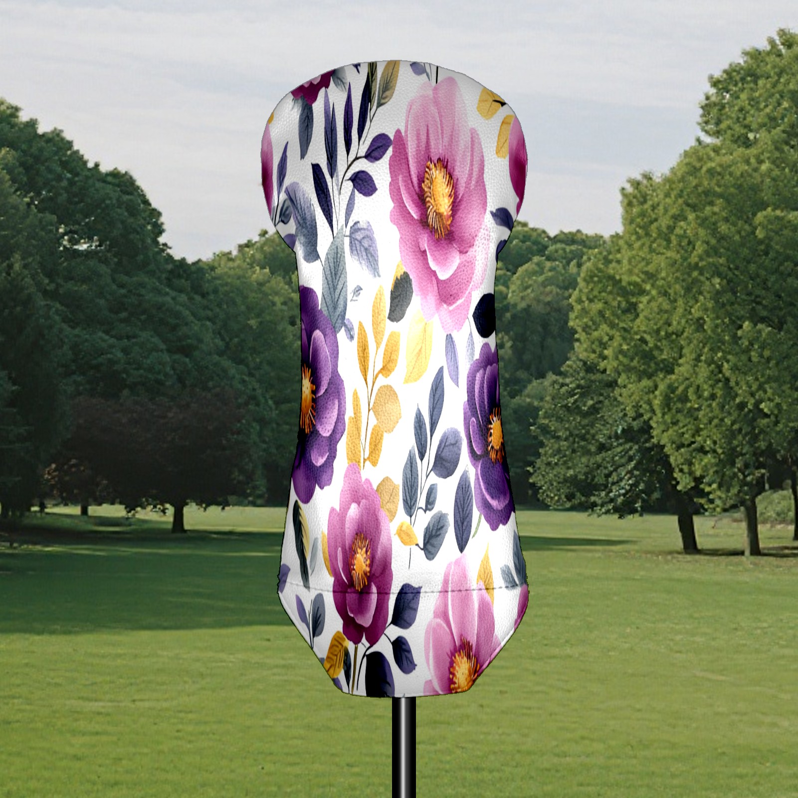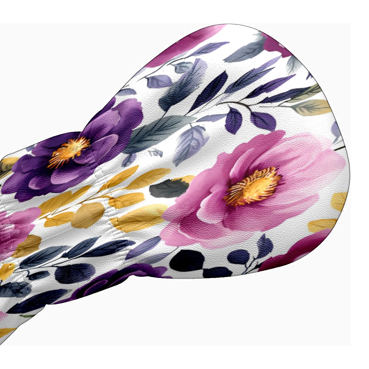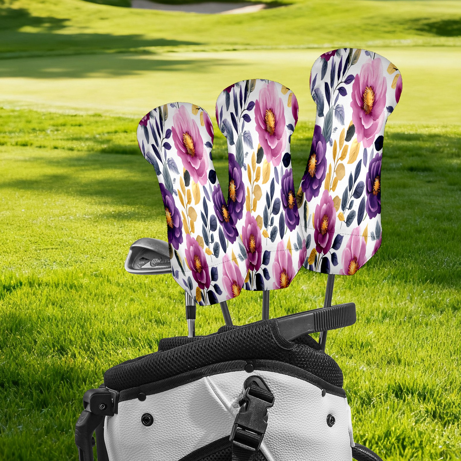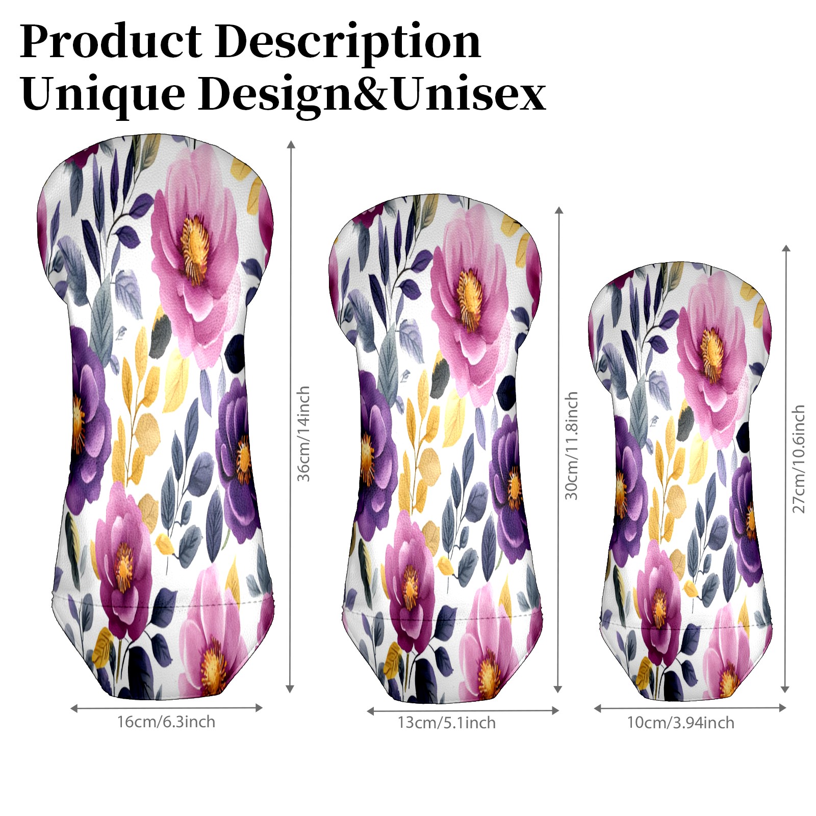 Funny Purple Flowers Golf Head Covers for Driver, Fairway, Hybrid & 3 Wood Premium PU Leather with Soft Velvet Lining Waterproof & Scratch-Resistant Unique Golf Gift for Men & Women