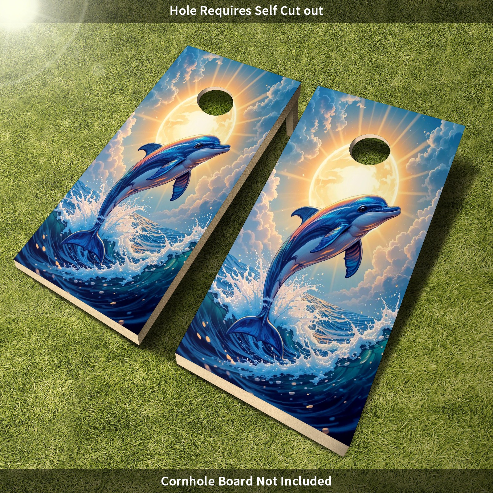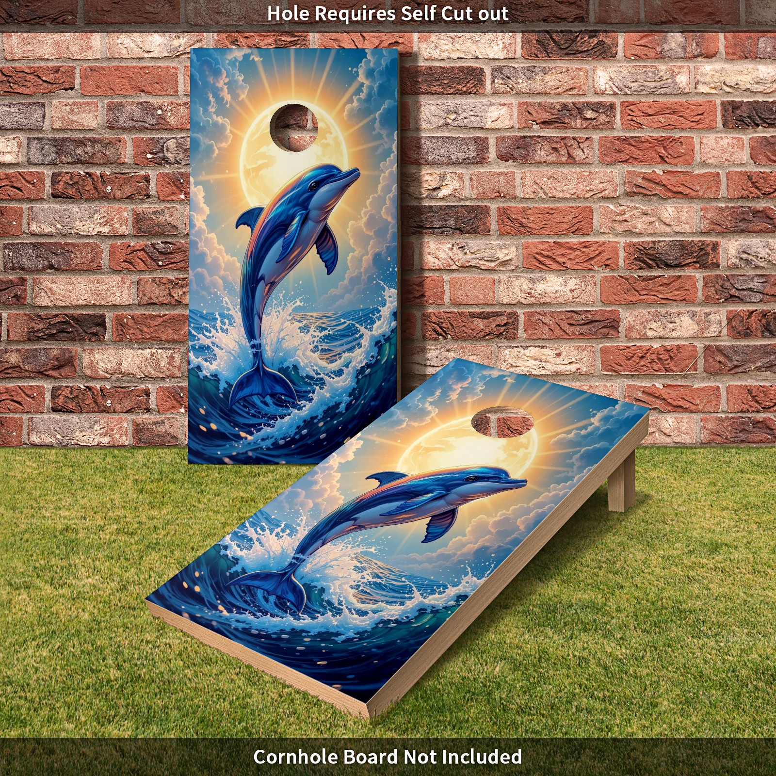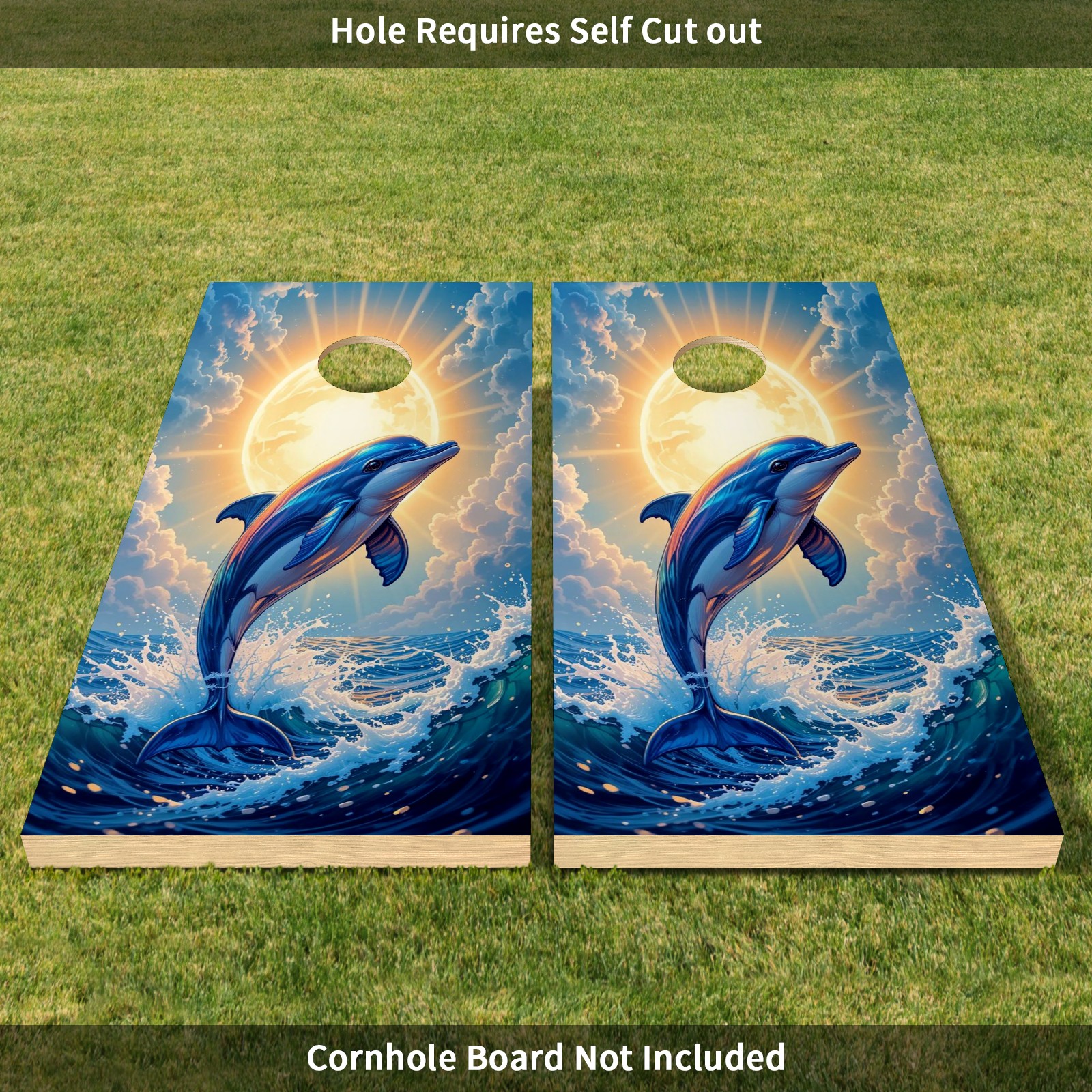 Cornhole Game Stickers For Boards Funny Cornhole Board Decals 24x48Inch Cornhole Board Wraps Weatherproof Vinyl Decal Easy Bubble Free Bean Toss Christmas Games Blue Dolphin Shining Sun