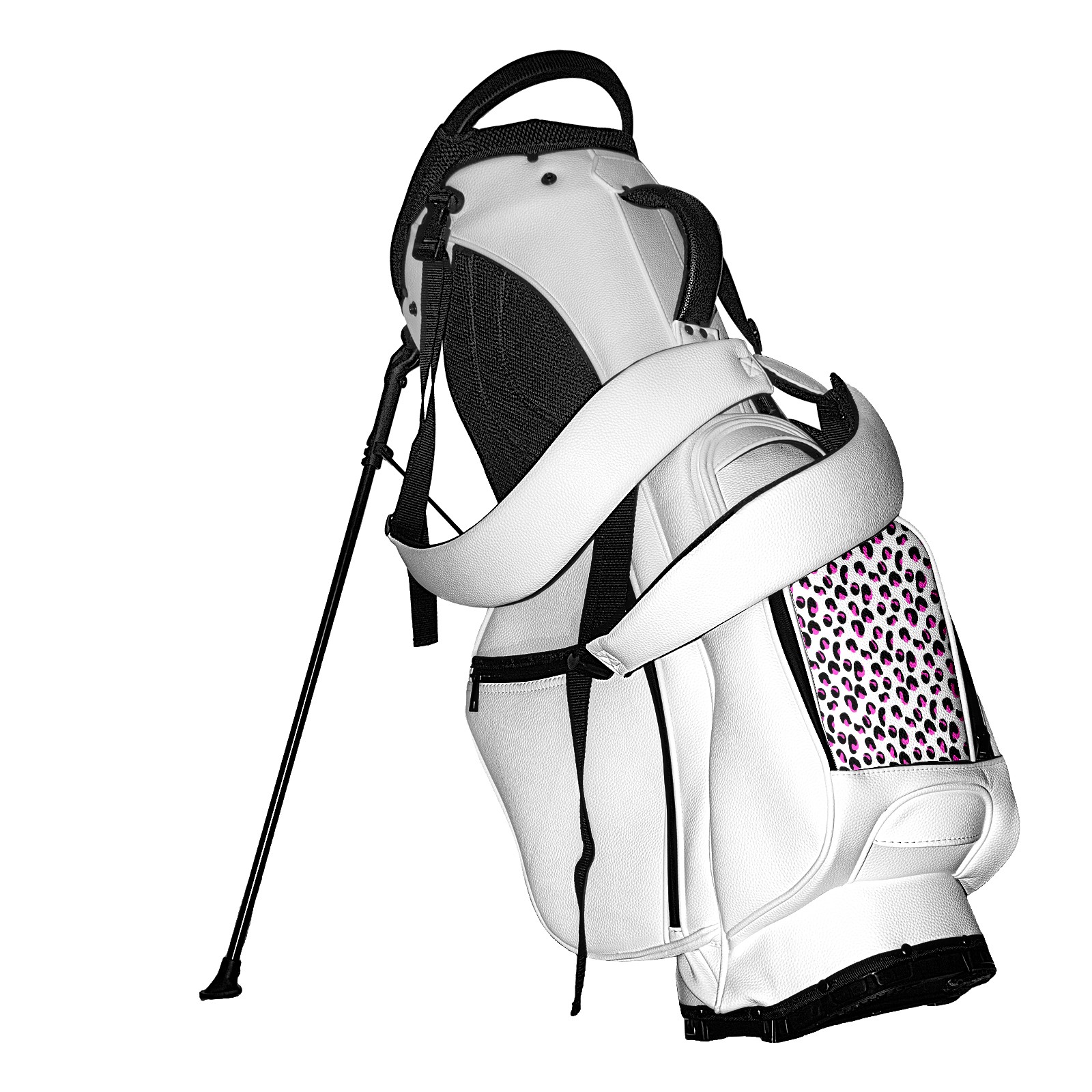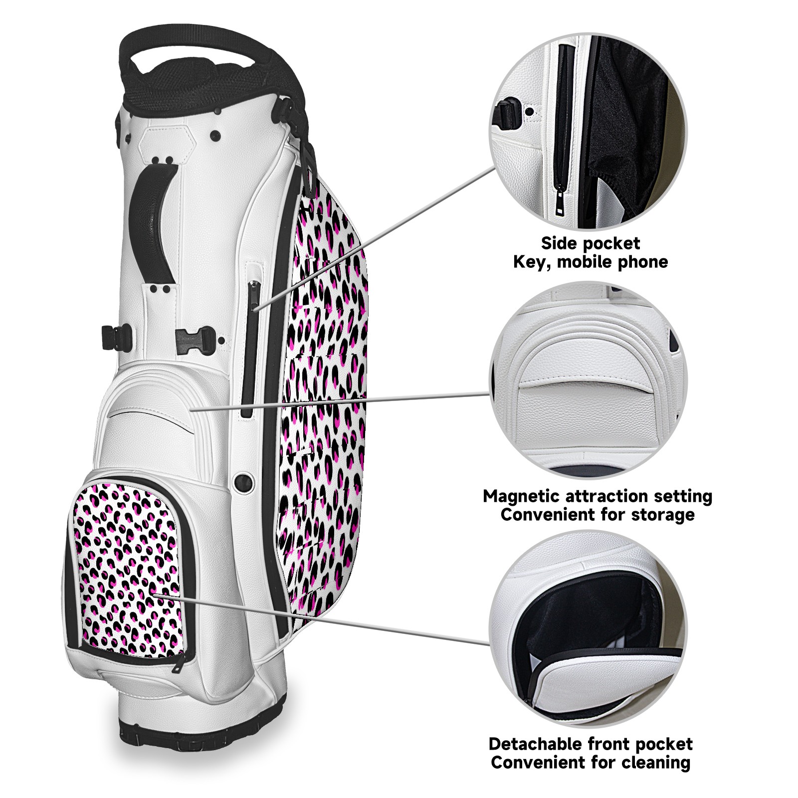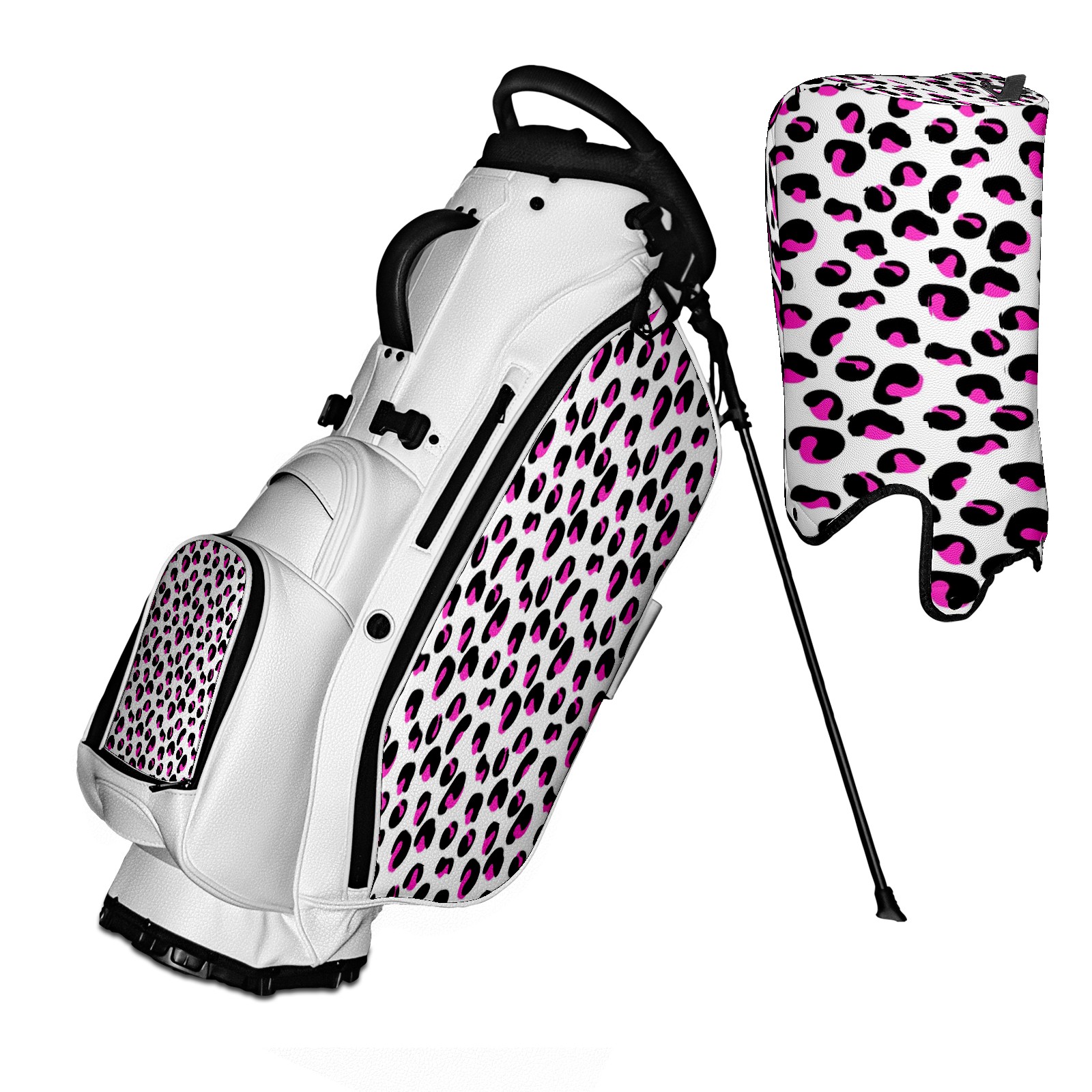 • <p>The Golf Stand Bag, designed specifically for golf enthusiasts, offers a choice of 5 - way and 14 - way top dividers. Its 5/14 - compartment design with independent full - size club compartments safeguards clubs from collisions. Equipped with a rain cover, waterproof zippered pockets (tested to resist moderate to heavy rain), and a high - performance cooler pouch that can keep drinks cold for hours, it ensures a convenient golfing experience. The bag features thickened, breathable neoprene shoulder straps and an adjustable chest buckle, reducing shoulder fatigue by 35% compared to regular bags, and its automatic aluminum alloy stand provides stable support on various terrains. Crafted from top - tier, water - resistant litchi - grain PU leather, with double - stitched edges, reliable zippers tested for over 15,000 cycles, and anti - abrasion bottom studs, it guarantees durability. You can personalize it with embroidery on the front pocket and rain cover side (15*15cm area), and it comes in classic black and white, with a matte finish and litchi - grain texture that combines business and leisure styles. Measuring 130 cm in height, 37 cm in width, and 31 cm in depth (including rain cover) and 90 cm x 31 cm x 37 cm (excluding rain cover), it strikes a balance between storage and portability, capable of holding 14 standard - sized clubs and other essentials, and it also includes a dust cover. It's truly the perfect choice for golfers.<br></p>