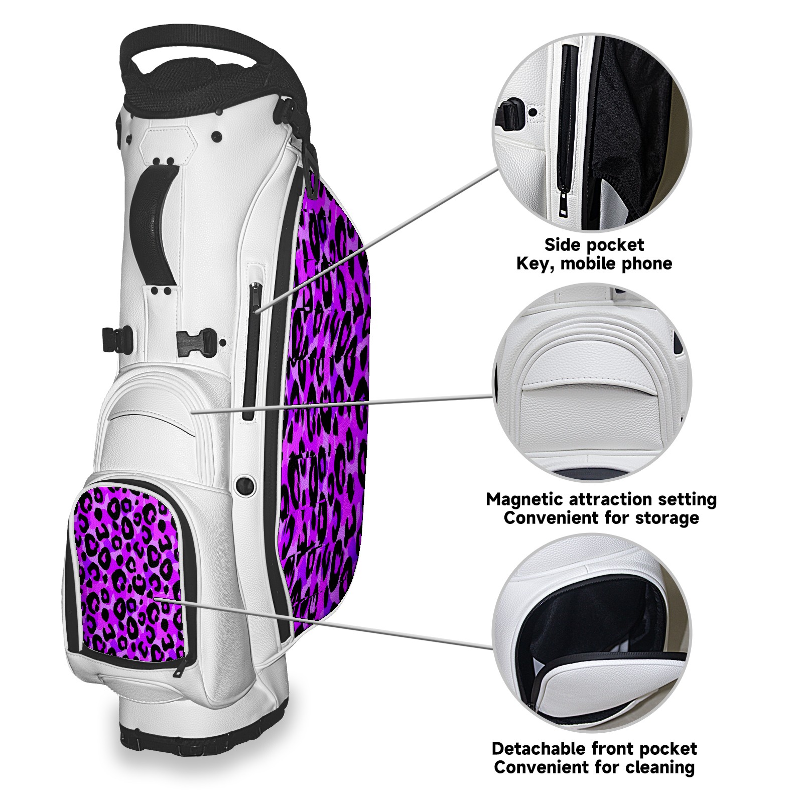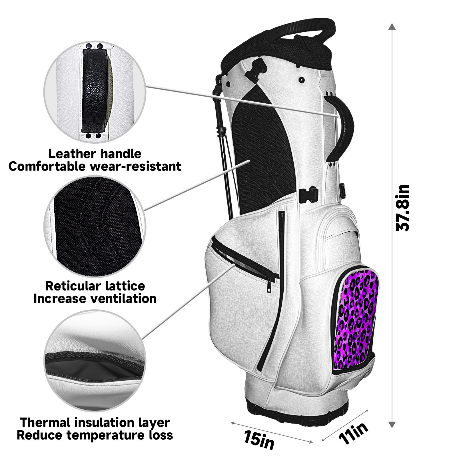 • <p>The Golf Stand Bag, designed specifically for golf enthusiasts, offers a choice of 5 - way and 14 - way top dividers. Its 5/14 - compartment design with independent full - size club compartments safeguards clubs from collisions. Equipped with a rain cover, waterproof zippered pockets (tested to resist moderate to heavy rain), and a high - performance cooler pouch that can keep drinks cold for hours, it ensures a convenient golfing experience. The bag features thickened, breathable neoprene shoulder straps and an adjustable chest buckle, reducing shoulder fatigue by 35% compared to regular bags, and its automatic aluminum alloy stand provides stable support on various terrains. Crafted from top - tier, water - resistant litchi - grain PU leather, with double - stitched edges, reliable zippers tested for over 15,000 cycles, and anti - abrasion bottom studs, it guarantees durability. You can personalize it with embroidery on the front pocket and rain cover side (15*15cm area), and it comes in classic black and white, with a matte finish and litchi - grain texture that combines business and leisure styles. Measuring 130 cm in height, 37 cm in width, and 31 cm in depth (including rain cover) and 90 cm x 31 cm x 37 cm (excluding rain cover), it strikes a balance between storage and portability, capable of holding 14 standard - sized clubs and other essentials, and it also includes a dust cover. It's truly the perfect choice for golfers.<br></p>