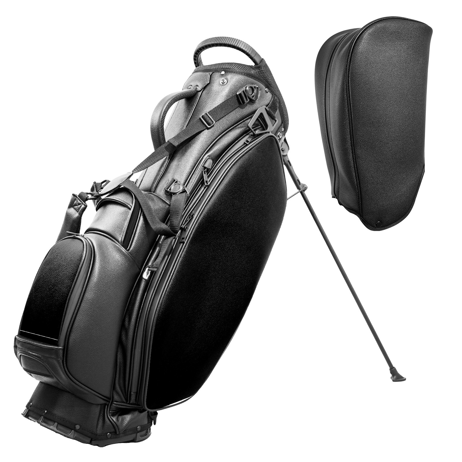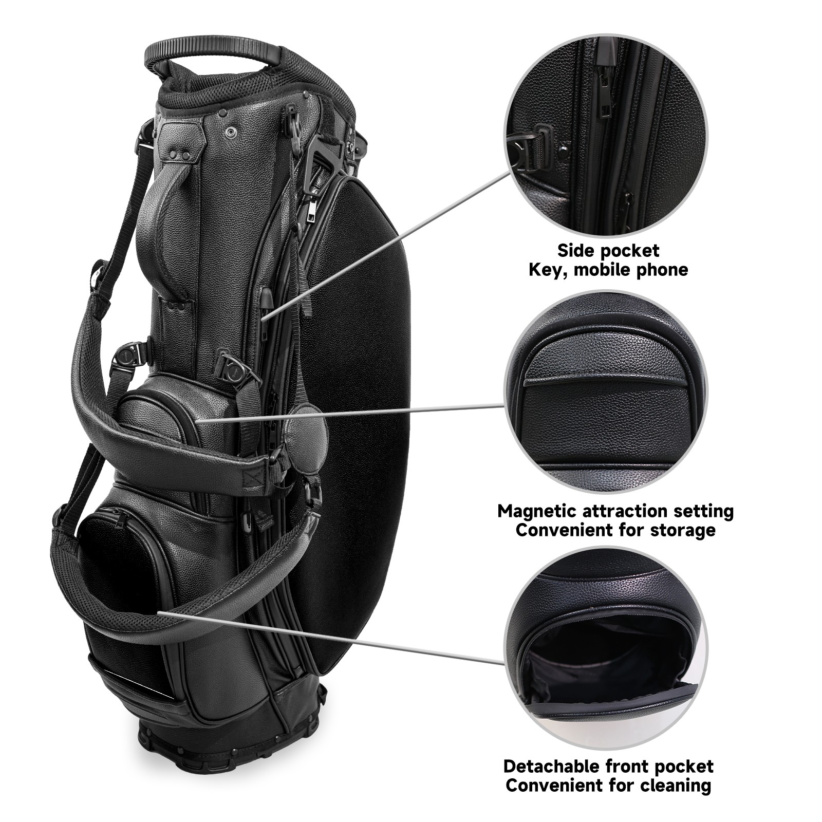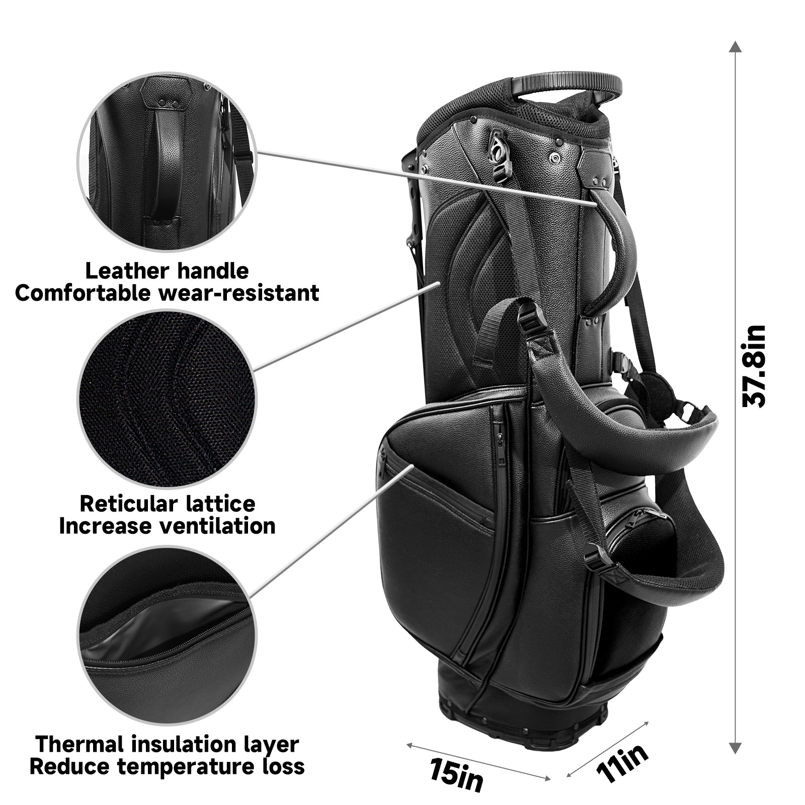"<p>This golf bag combines versatility, durability, and quality, providing comprehensive protection and easy access for your golf clubs. Its precise dimensions of 130 x 37 x 31 cm (with rain cover) and 90 x 31 x 37 cm (without rain cover) strike the perfect balance between portability and storage capacity. The five-way head frame (with five-way dividers on the top) allows for strategic compartmentalization, allowing you to neatly organize your various clubs and separate them to protect them from bumps, scratches, and scuffs. Its versatile compartmental design features a spacious five-compartment structure, including a separate, full-size club compartment. This versatile organization system features multiple waterproof zippered pockets for securely storing golf accessories, as well as a dedicated insulated cooler pocket with excellent insulation to keep your drinks cool and fresh. The built-in rain cover effectively repels moisture, ensuring your clubs stay dry and protected even in wet weather. For enhanced carrying comfort, this bag features ergonomically designed, breathable, padded, adjustable shoulder straps and an adjustable chest strap, effectively distributing shoulder pressure and making carrying easier and more comfortable. A portable rear handle makes lifting and carrying even easier, making it an ideal gift for every golfer.</p>"