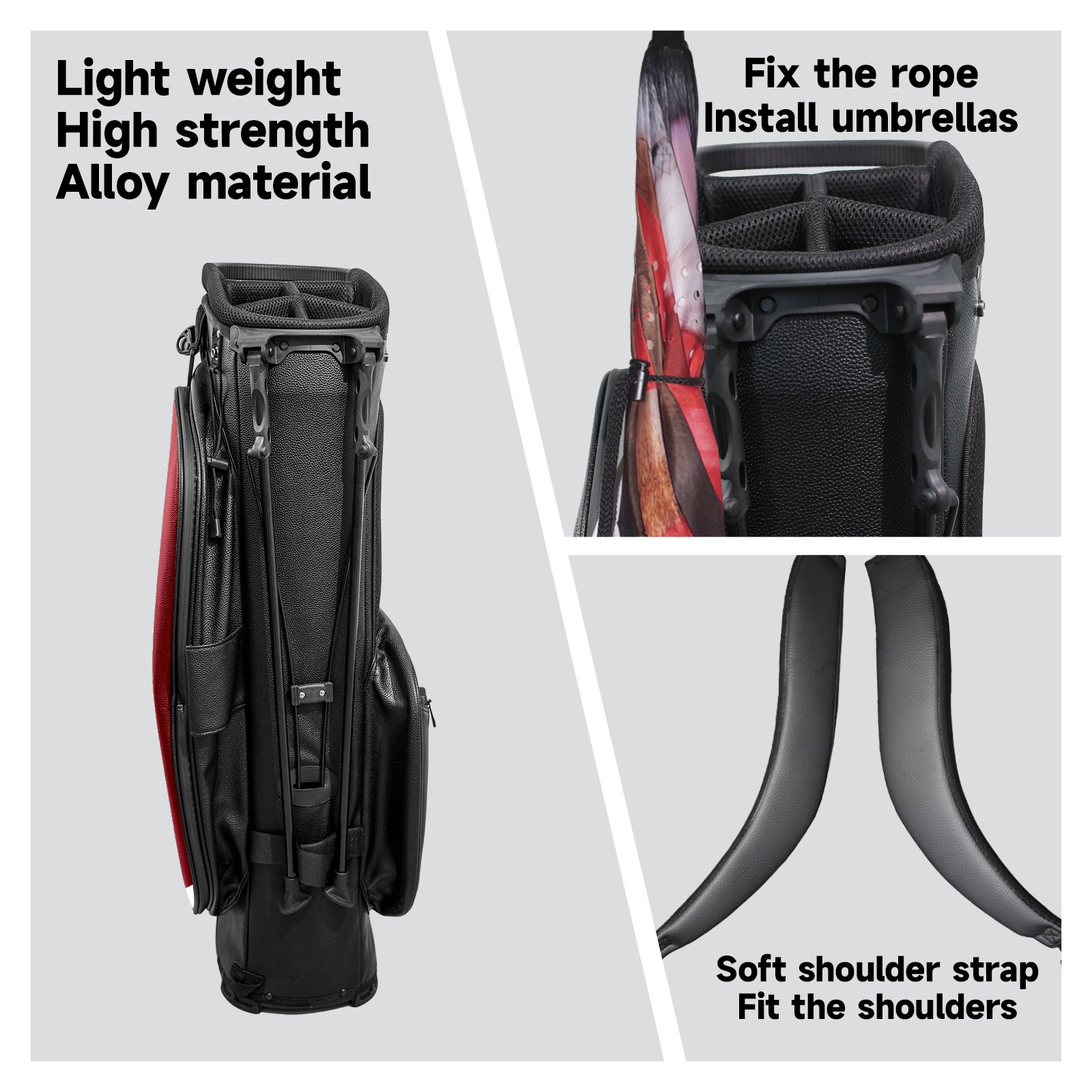 "<p>This golf bag combines versatility, durability, and quality, providing comprehensive protection and easy access for your golf clubs. Its precise dimensions of 130 x 37 x 31 cm (with rain cover) and 90 x 31 x 37 cm (without rain cover) strike the perfect balance between portability and storage capacity. The five-way head frame (with five-way dividers on the top) allows for strategic compartmentalization, allowing you to neatly organize your various clubs and separate them to protect them from bumps, scratches, and scuffs. Its versatile compartmental design features a spacious five-compartment structure, including a separate, full-size club compartment. This versatile organization system features multiple waterproof zippered pockets for securely storing golf accessories, as well as a dedicated insulated cooler pocket with excellent insulation to keep your drinks cool and fresh. The built-in rain cover effectively repels moisture, ensuring your clubs stay dry and protected even in wet weather. For enhanced carrying comfort, this bag features ergonomically designed, breathable, padded, adjustable shoulder straps and an adjustable chest strap, effectively distributing shoulder pressure and making carrying easier and more comfortable. A portable rear handle makes lifting and carrying even easier, making it an ideal gift for every golfer.</p>"