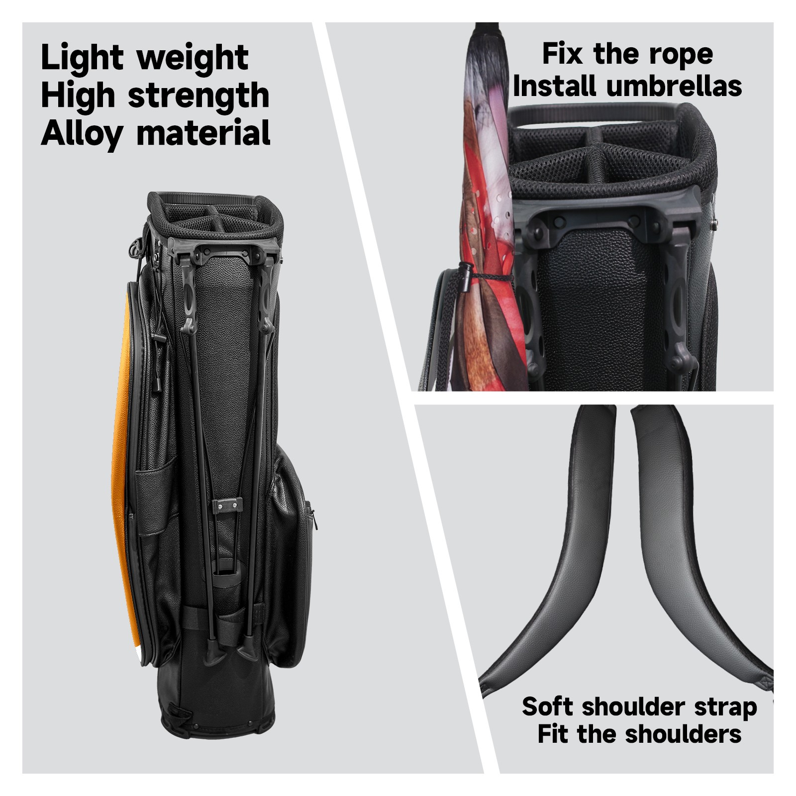 "<p>This golf bag combines versatility, durability, and quality, providing comprehensive protection and easy access for your golf clubs. Its precise dimensions of 130 x 37 x 31 cm (with rain cover) and 90 x 31 x 37 cm (without rain cover) strike the perfect balance between portability and storage capacity. The five-way head frame (with five-way dividers on the top) allows for strategic compartmentalization, allowing you to neatly organize your various clubs and separate them to protect them from bumps, scratches, and scuffs. Its versatile compartmental design features a spacious five-compartment structure, including a separate, full-size club compartment. This versatile organization system features multiple waterproof zippered pockets for securely storing golf accessories, as well as a dedicated insulated cooler pocket with excellent insulation to keep your drinks cool and fresh. The built-in rain cover effectively repels moisture, ensuring your clubs stay dry and protected even in wet weather. For enhanced carrying comfort, this bag features ergonomically designed, breathable, padded, adjustable shoulder straps and an adjustable chest strap, effectively distributing shoulder pressure and making carrying easier and more comfortable. A portable rear handle makes lifting and carrying even easier, making it an ideal gift for every golfer.</p>"