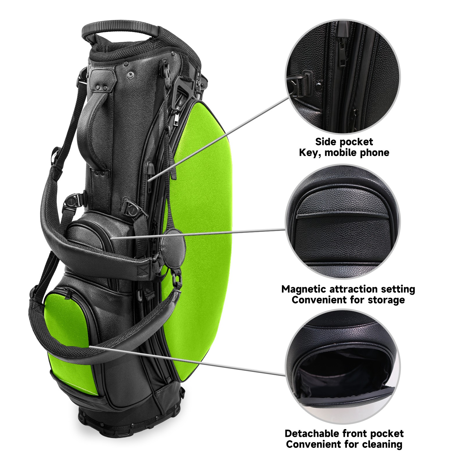 "<p>This golf bag combines versatility, durability, and quality, providing comprehensive protection and easy access for your golf clubs. Its precise dimensions of 130 x 37 x 31 cm (with rain cover) and 90 x 31 x 37 cm (without rain cover) strike the perfect balance between portability and storage capacity. The five-way head frame (with five-way dividers on the top) allows for strategic compartmentalization, allowing you to neatly organize your various clubs and separate them to protect them from bumps, scratches, and scuffs. Its versatile compartmental design features a spacious five-compartment structure, including a separate, full-size club compartment. This versatile organization system features multiple waterproof zippered pockets for securely storing golf accessories, as well as a dedicated insulated cooler pocket with excellent insulation to keep your drinks cool and fresh. The built-in rain cover effectively repels moisture, ensuring your clubs stay dry and protected even in wet weather. For enhanced carrying comfort, this bag features ergonomically designed, breathable, padded, adjustable shoulder straps and an adjustable chest strap, effectively distributing shoulder pressure and making carrying easier and more comfortable. A portable rear handle makes lifting and carrying even easier, making it an ideal gift for every golfer.</p>"