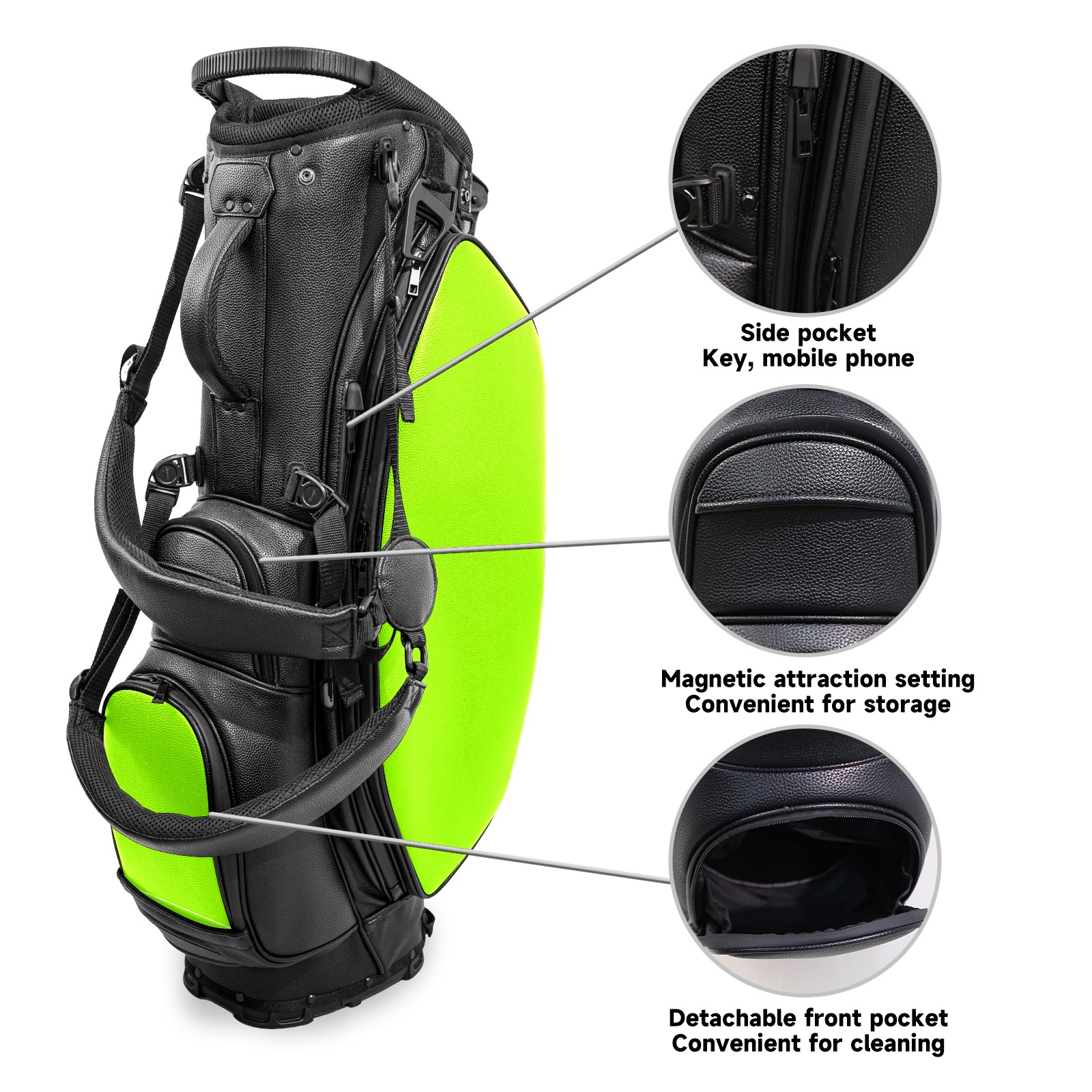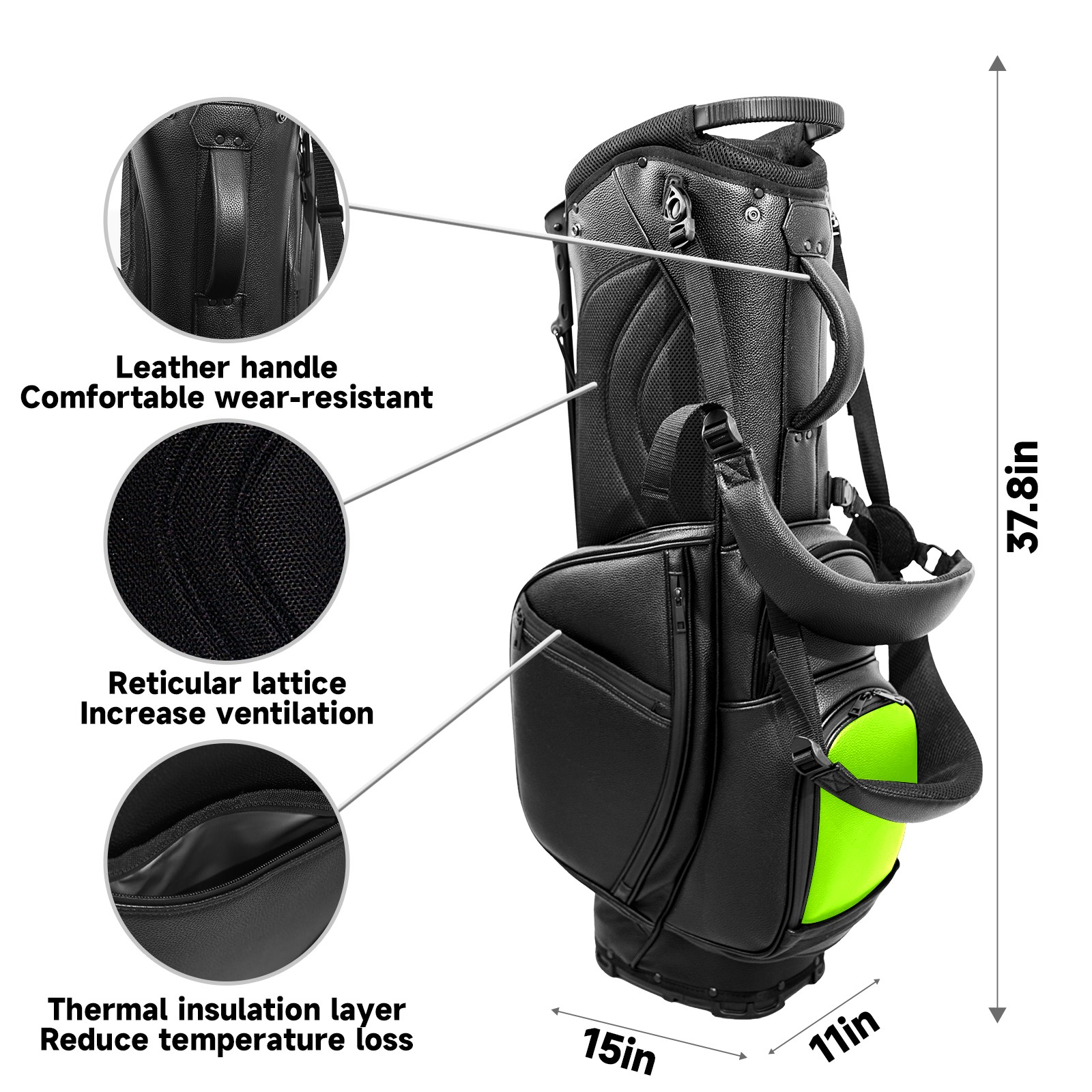 "<p>This golf bag combines versatility, durability, and quality, providing comprehensive protection and easy access for your golf clubs. Its precise dimensions of 130 x 37 x 31 cm (with rain cover) and 90 x 31 x 37 cm (without rain cover) strike the perfect balance between portability and storage capacity. The five-way head frame (with five-way dividers on the top) allows for strategic compartmentalization, allowing you to neatly organize your various clubs and separate them to protect them from bumps, scratches, and scuffs. Its versatile compartmental design features a spacious five-compartment structure, including a separate, full-size club compartment. This versatile organization system features multiple waterproof zippered pockets for securely storing golf accessories, as well as a dedicated insulated cooler pocket with excellent insulation to keep your drinks cool and fresh. The built-in rain cover effectively repels moisture, ensuring your clubs stay dry and protected even in wet weather. For enhanced carrying comfort, this bag features ergonomically designed, breathable, padded, adjustable shoulder straps and an adjustable chest strap, effectively distributing shoulder pressure and making carrying easier and more comfortable. A portable rear handle makes lifting and carrying even easier, making it an ideal gift for every golfer.</p>"