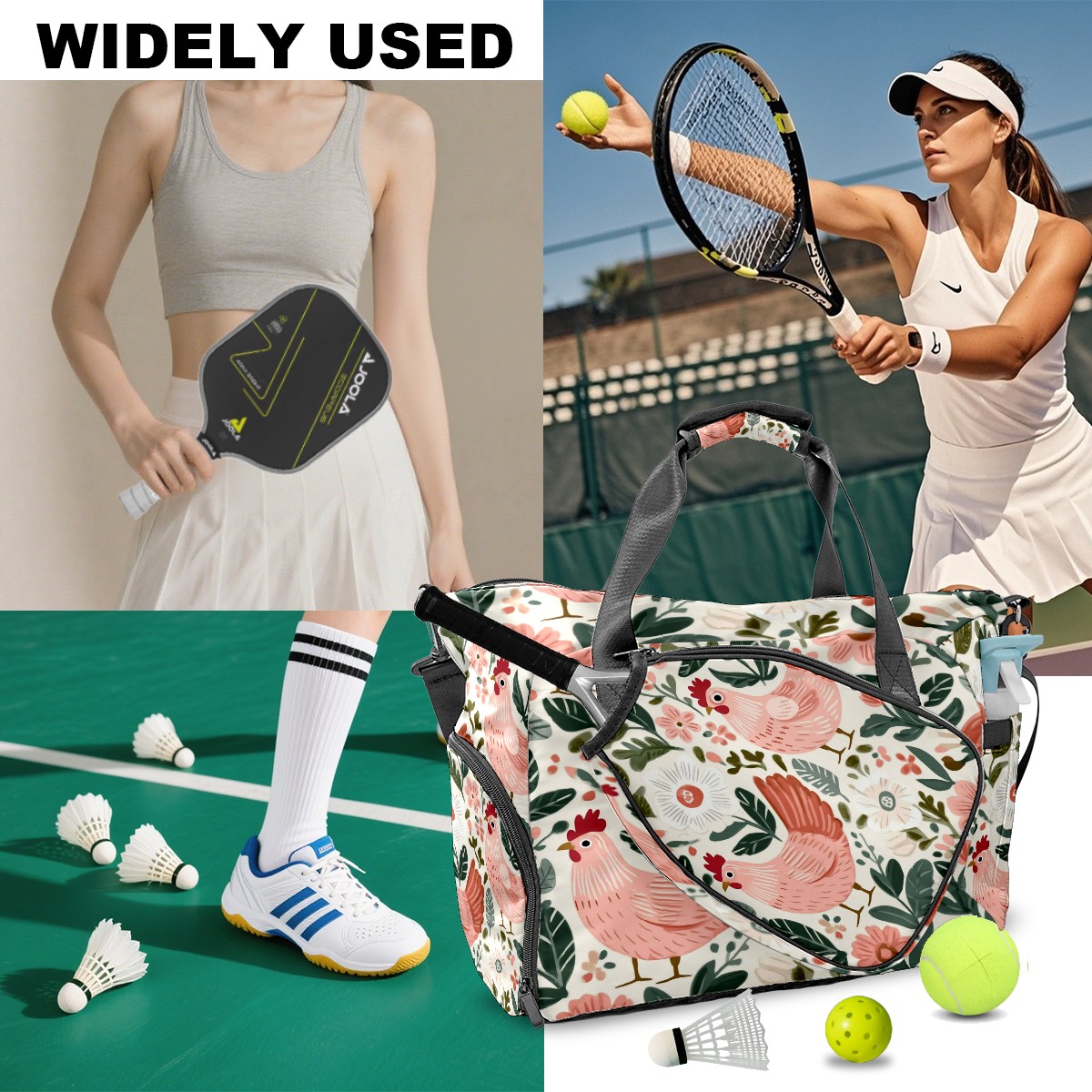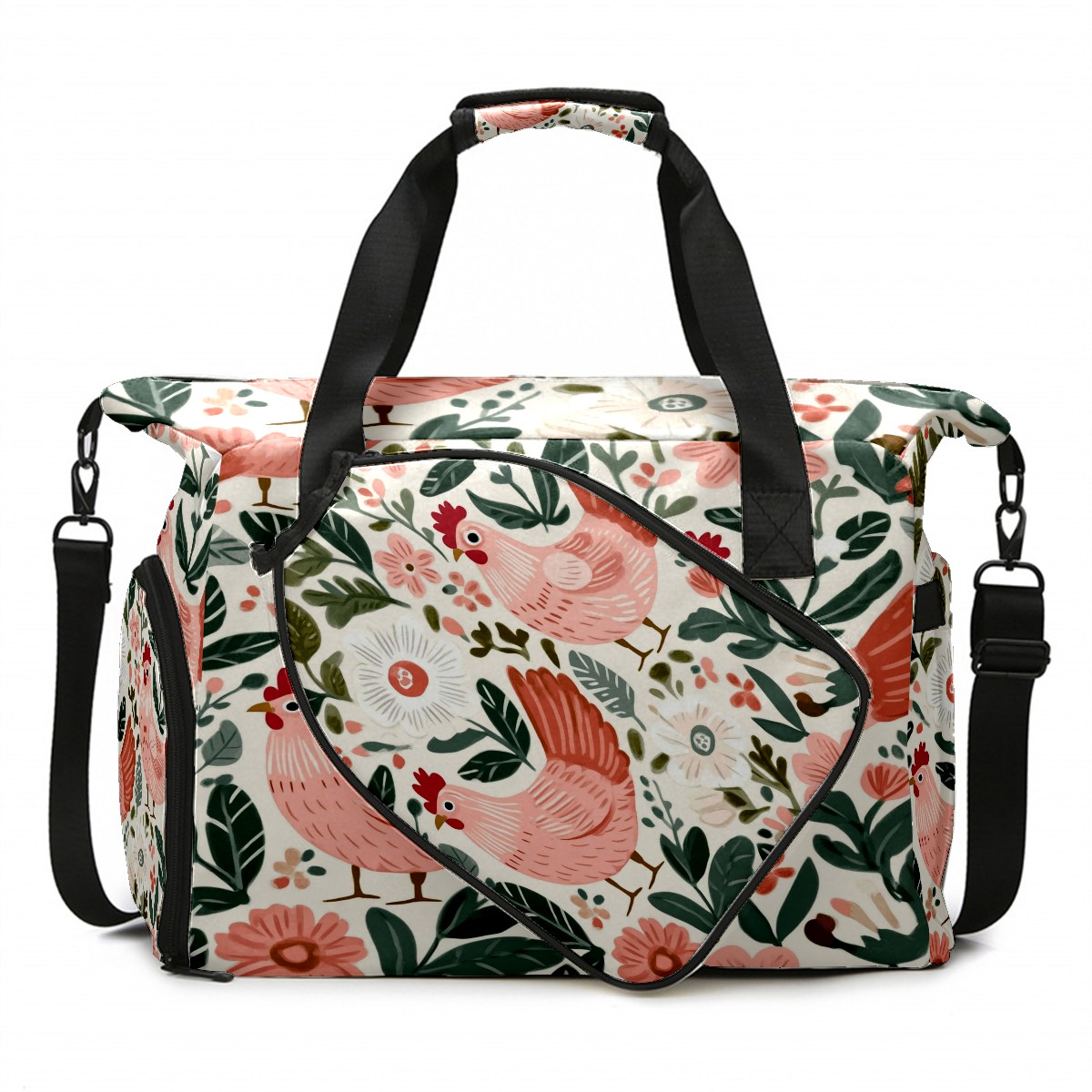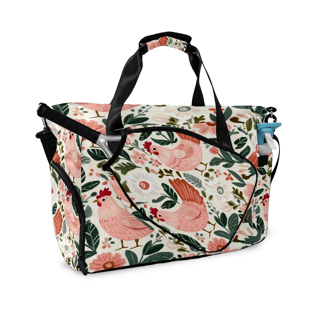 Pickleball Tote Bag Carryall for Paddles Balls and Accessories, Portable Lightweight Gear Bag for Players(Chickens And Flowers)