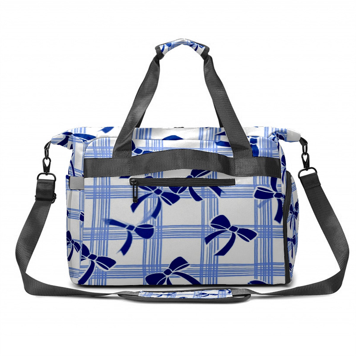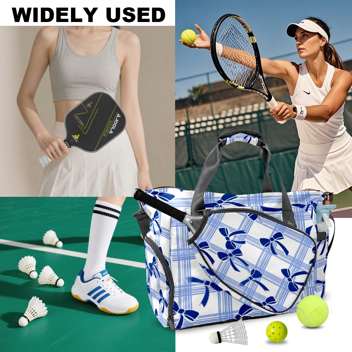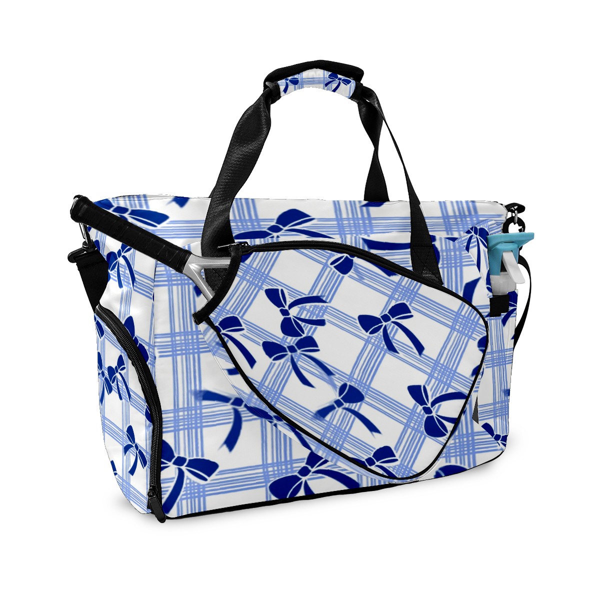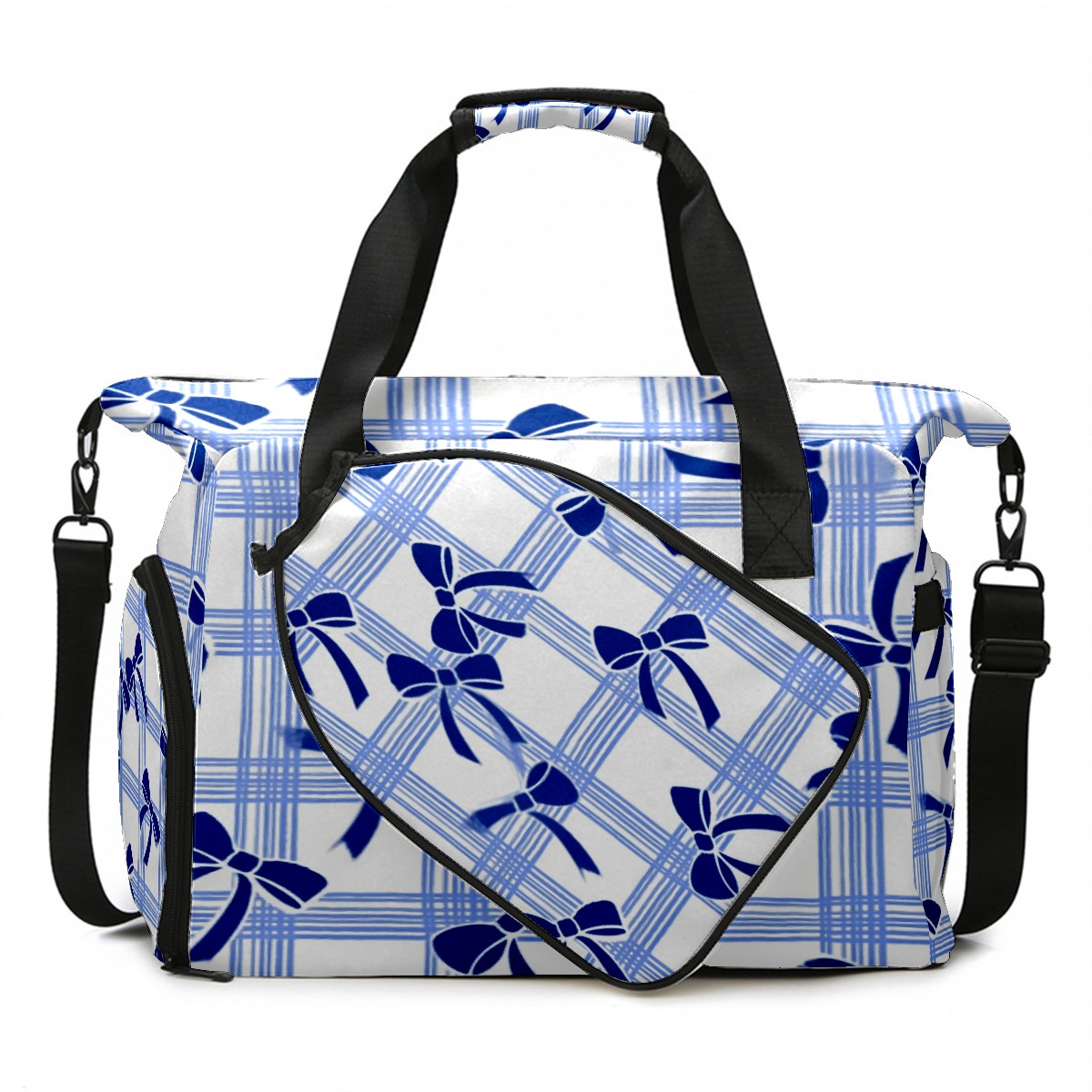 Pickleball Tote Bag Carryall for Paddles Balls and Accessories, Portable Lightweight Gear Bag for Players(Blue White Checkered And Bow)