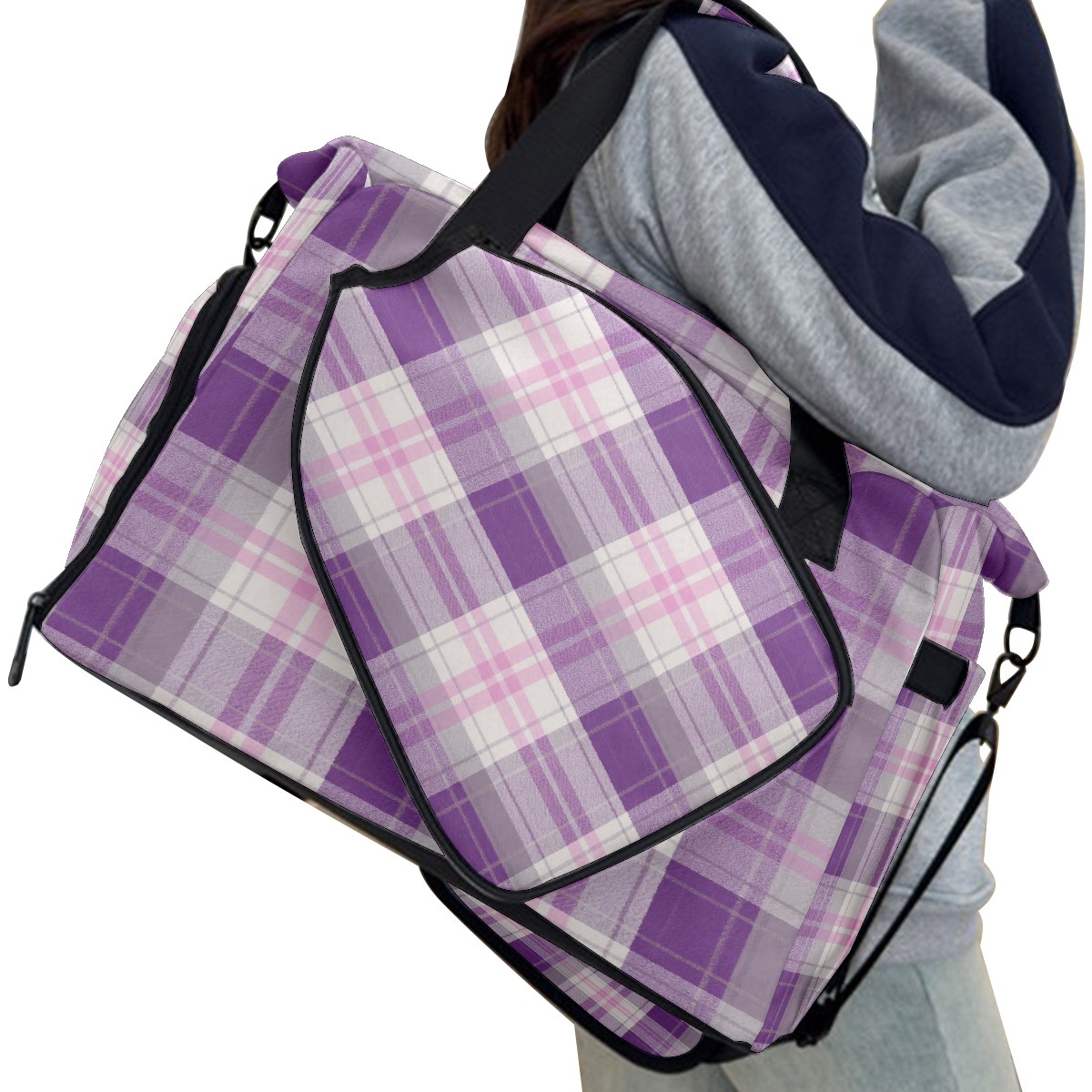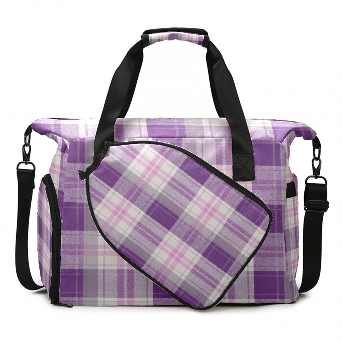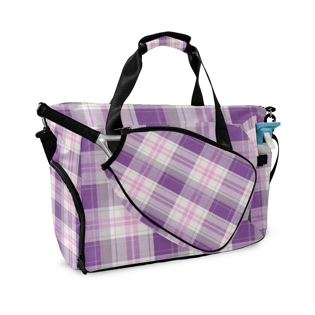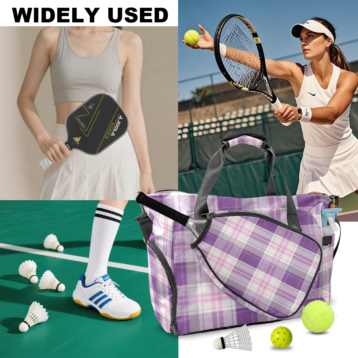 Pickleball Tote Bag Carryall for Paddles Balls and Accessories, Portable Lightweight Gear Bag for Players(Purple And White Checkered)