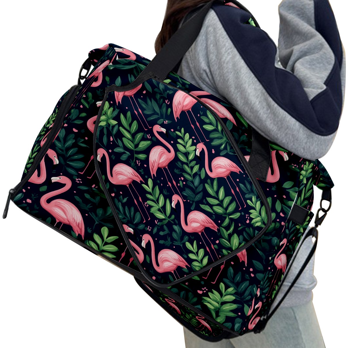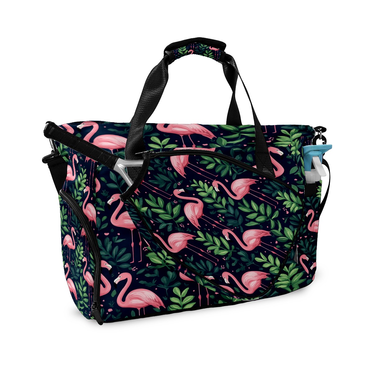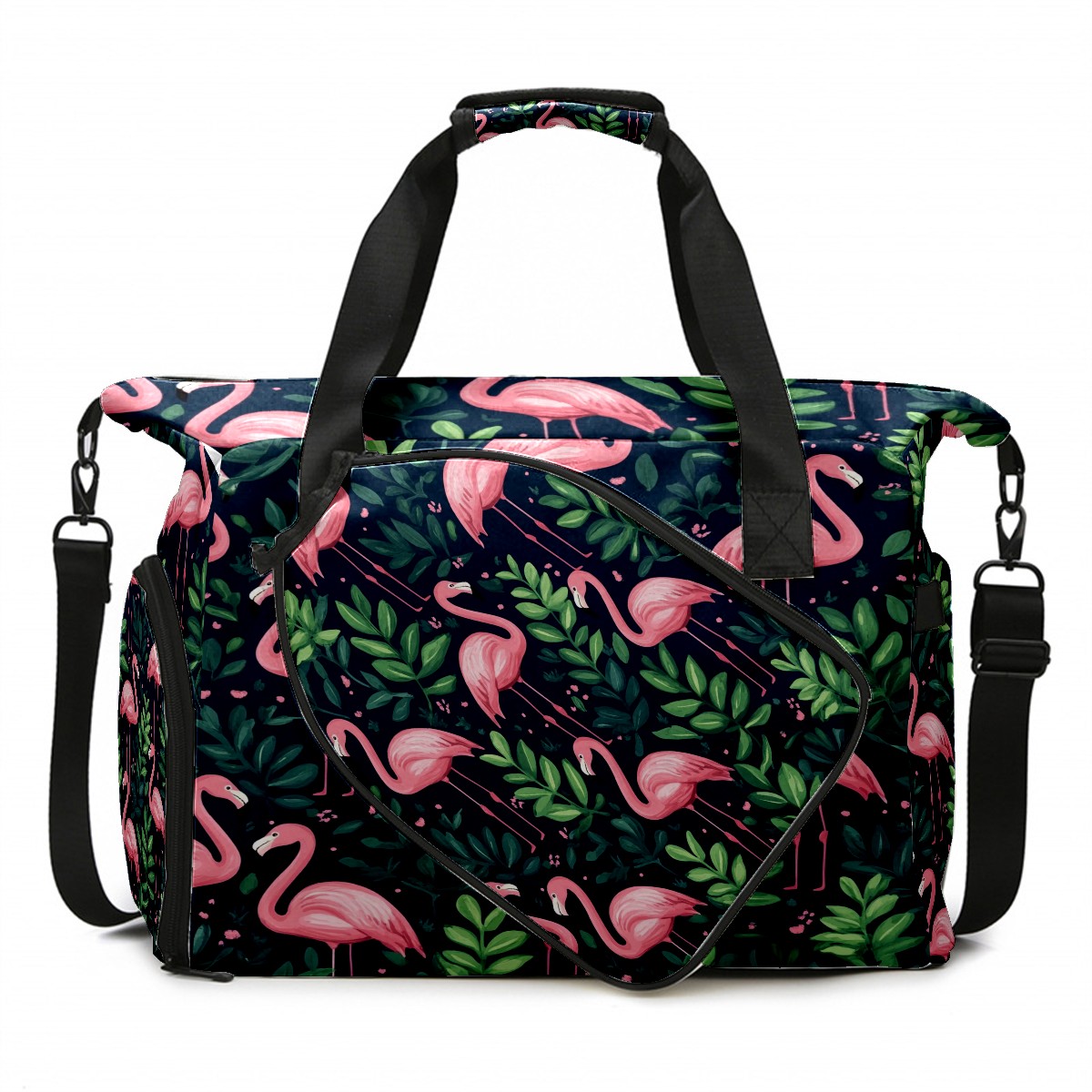 Pickleball Tote Bag Carryall for Paddles Balls and Accessories, Portable Lightweight Gear Bag for Players(Pink Flamingos And Green Leaves)