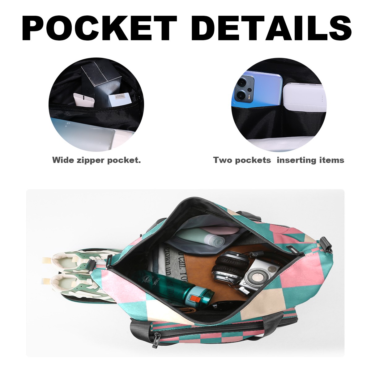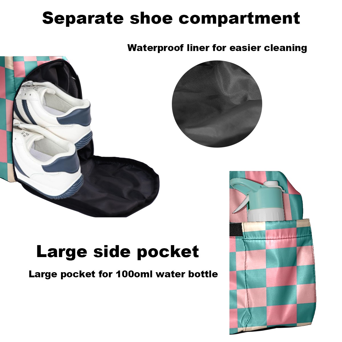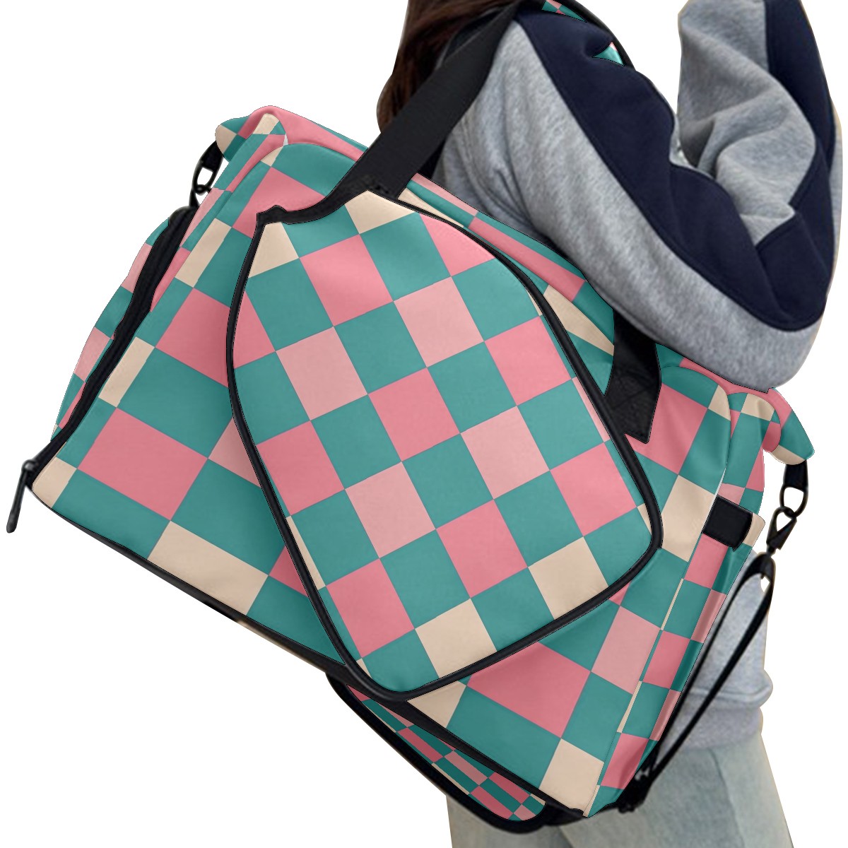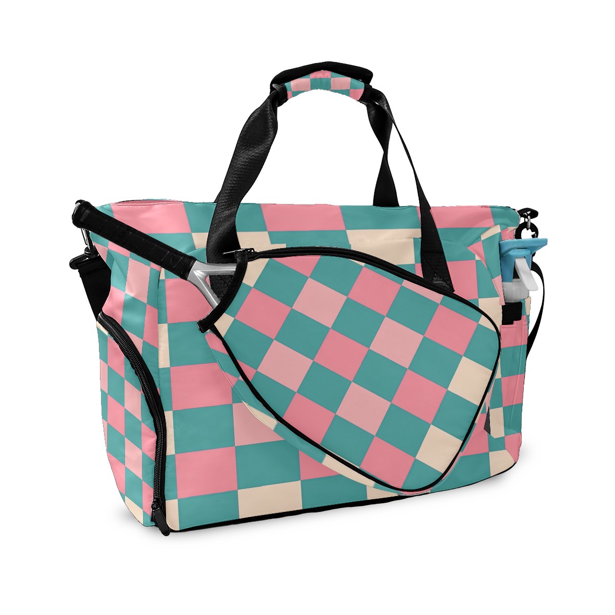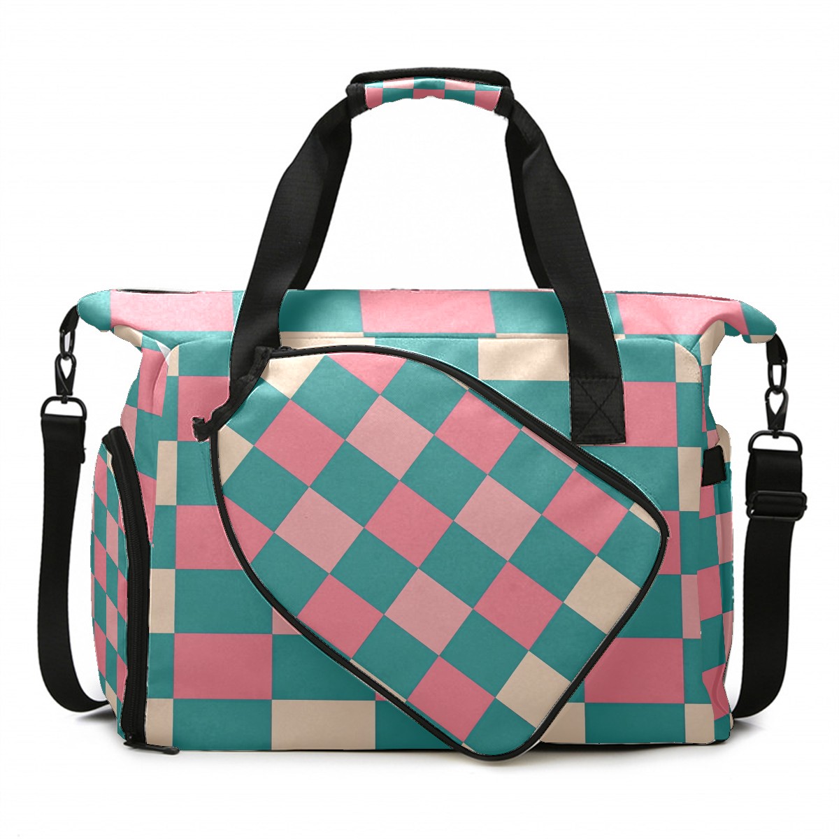 Pickleball Tote Bag Carryall for Paddles Balls and Accessories, Portable Lightweight Gear Bag for Players(Pink And Teal Checkered)