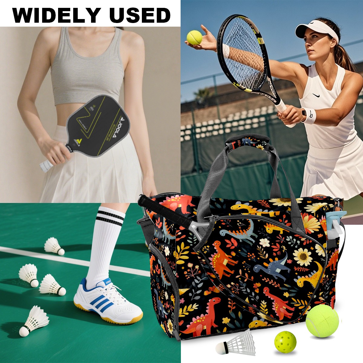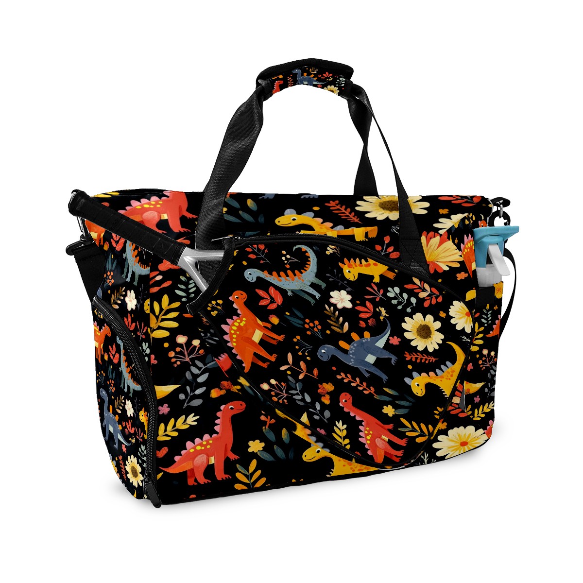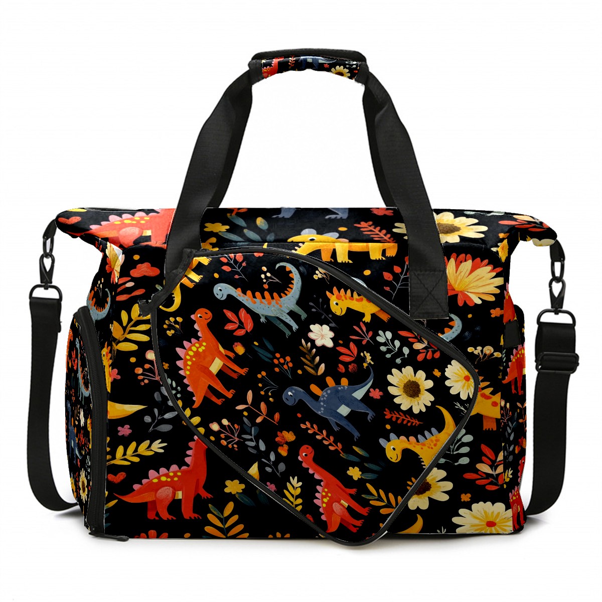 Pickleball Tote Bag Carryall for Paddles Balls and Accessories, Portable Lightweight Gear Bag for Players(Playful Dinosaurs Pattern)