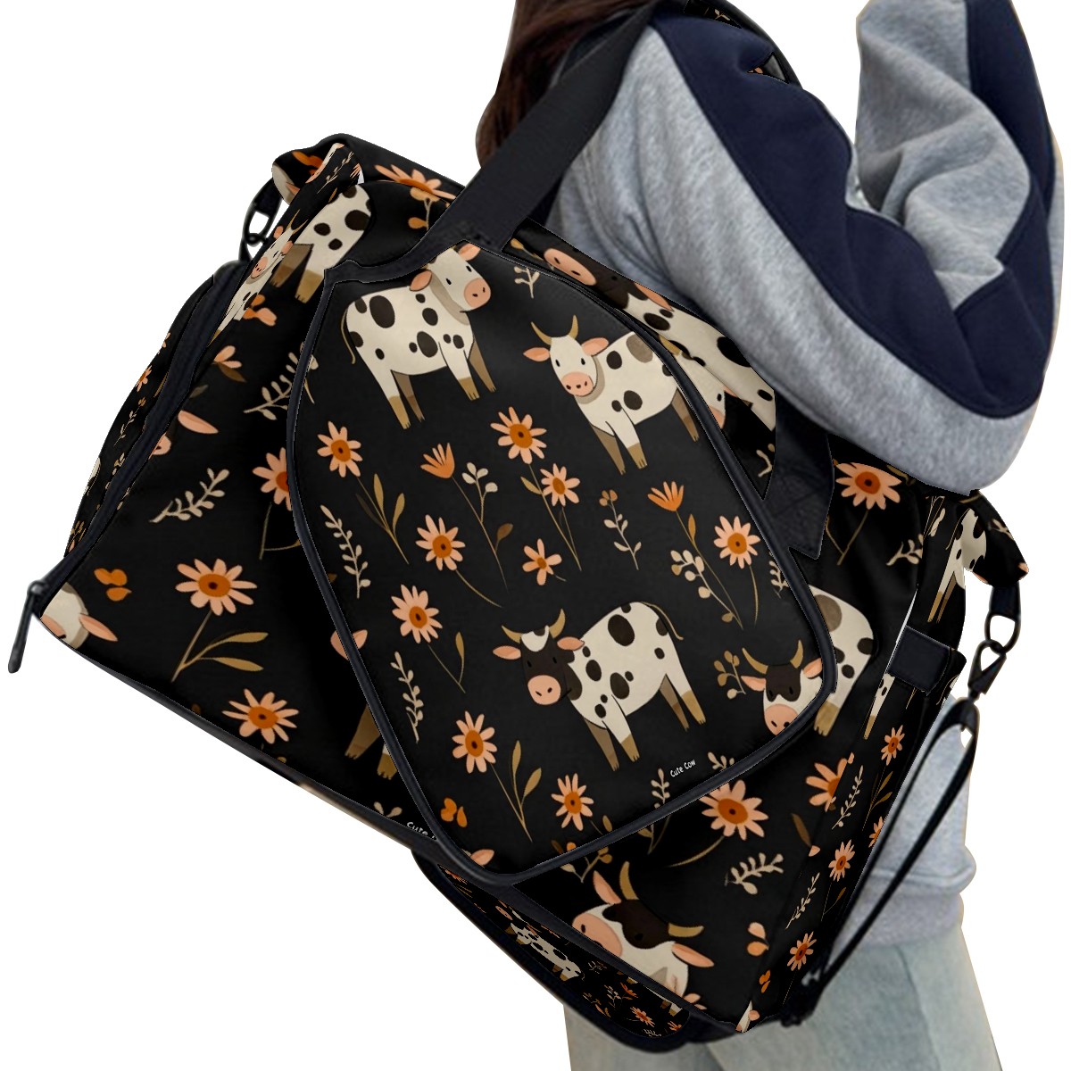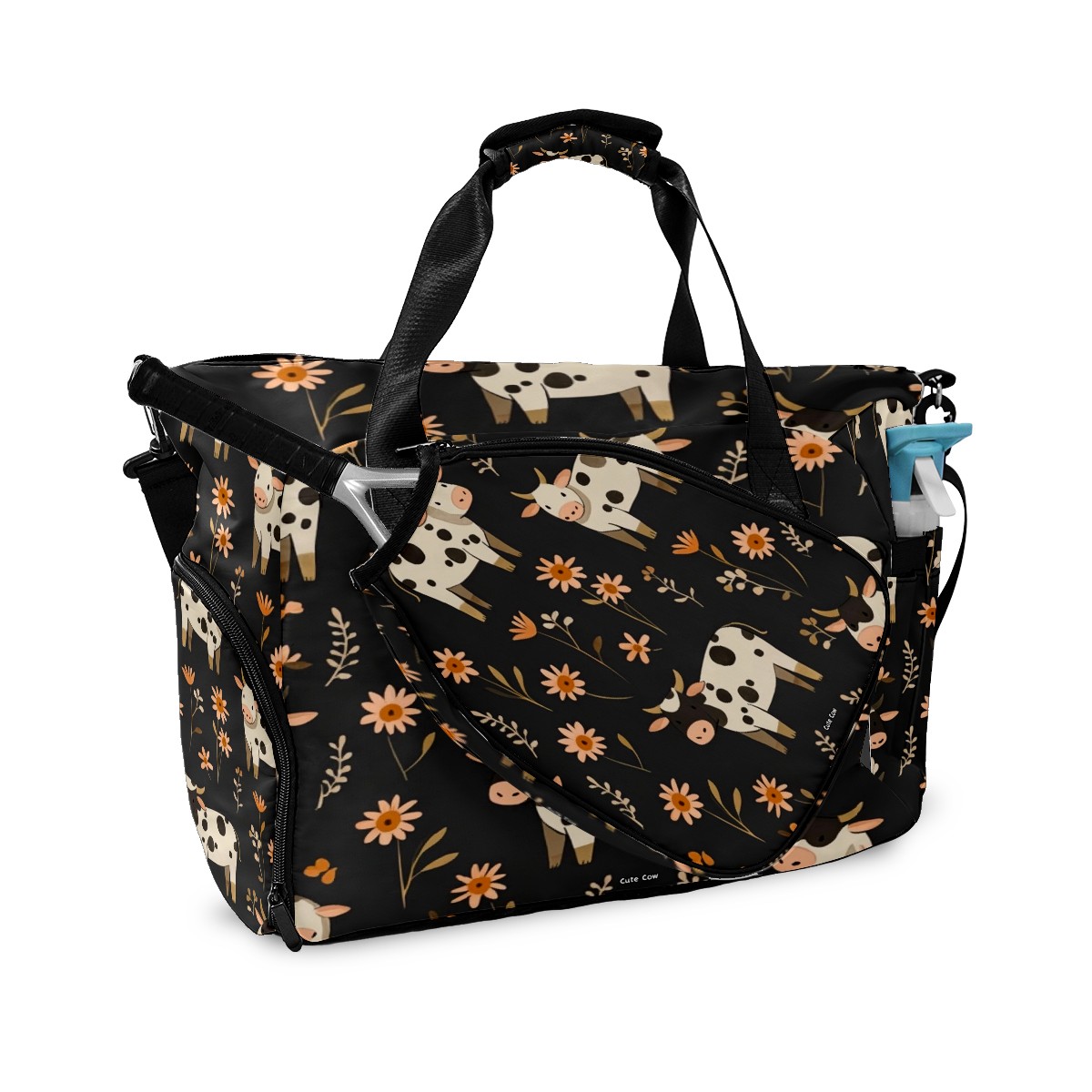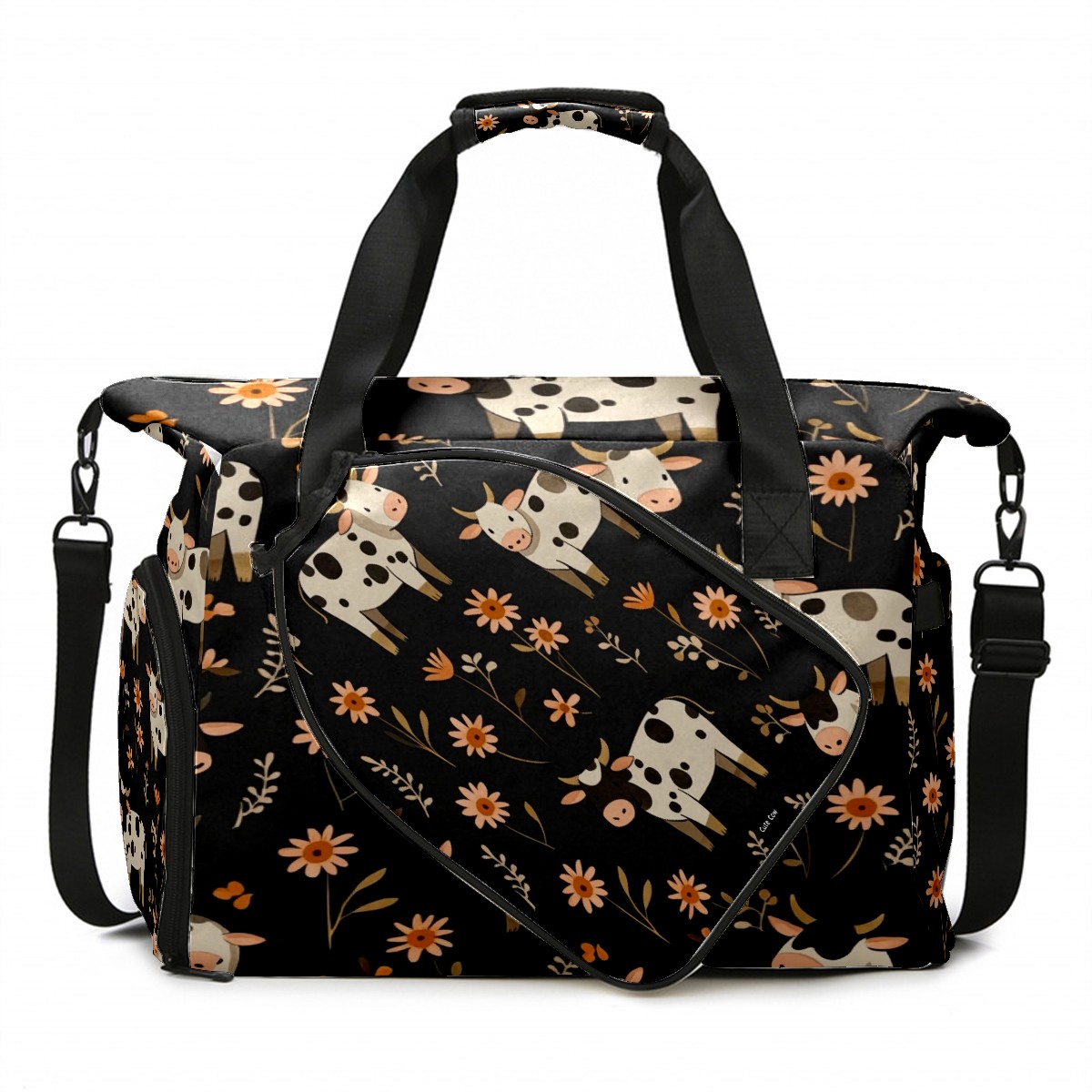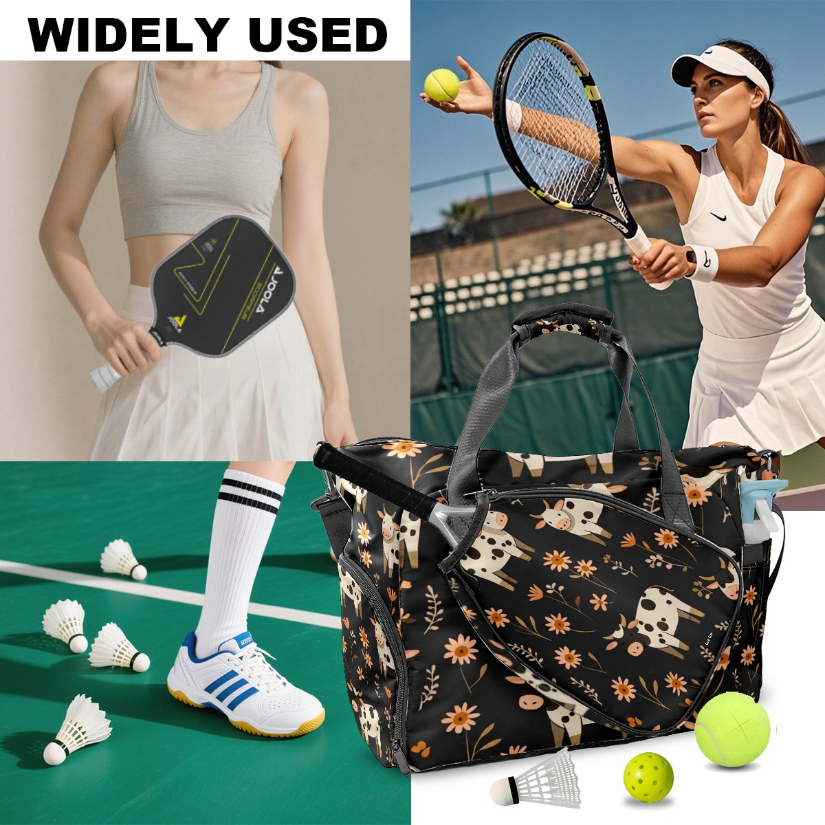 Pickleball Tote Bag Carryall for Paddles Balls and Accessories, Portable Lightweight Gear Bag for Players(Cows And Flowers)
