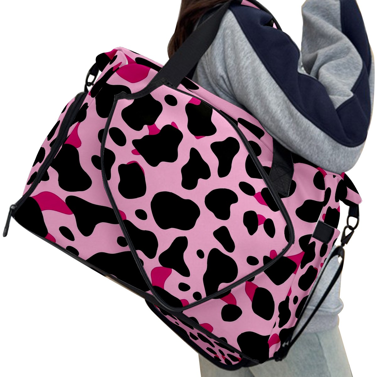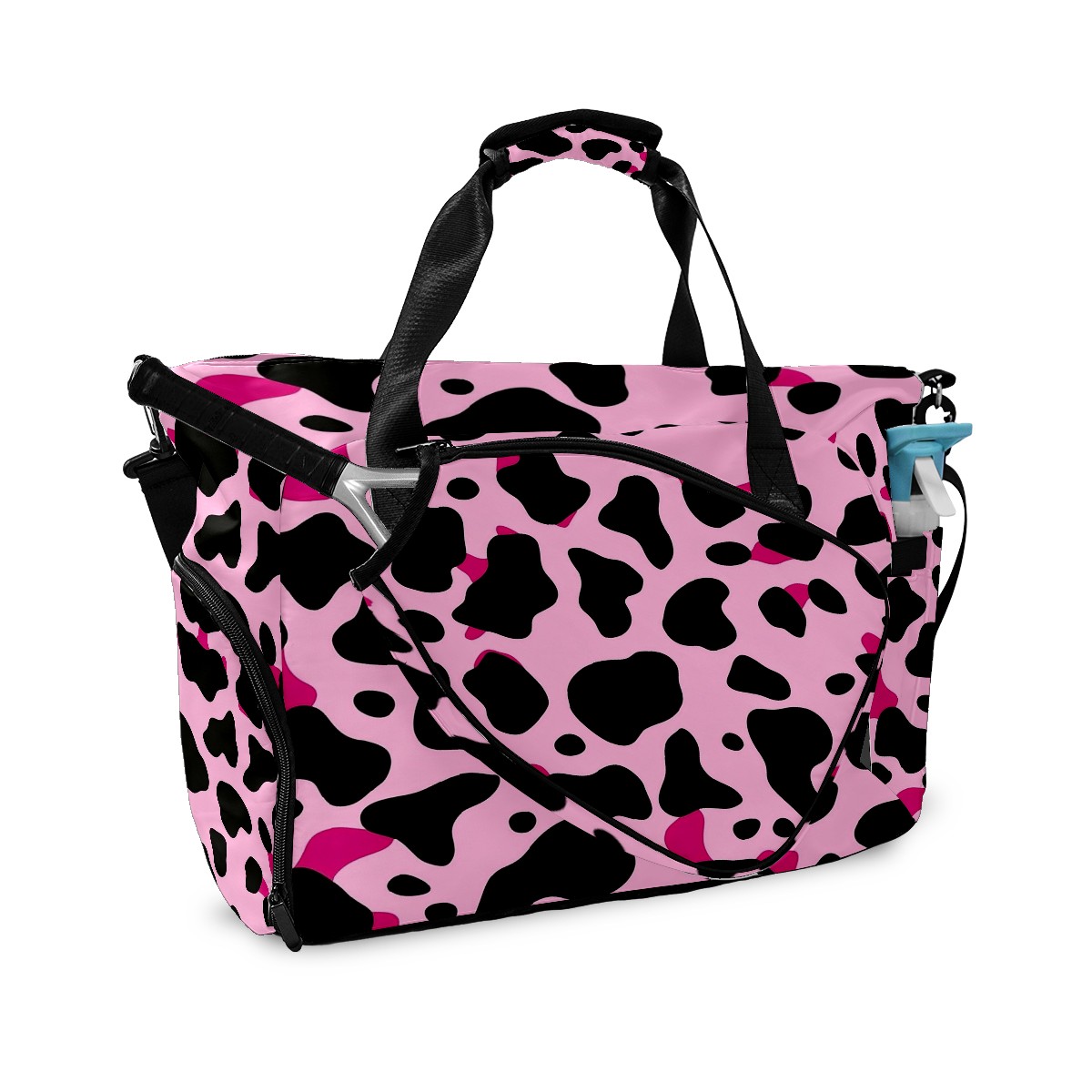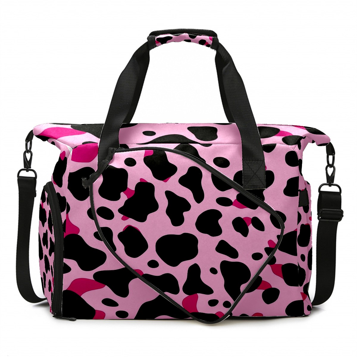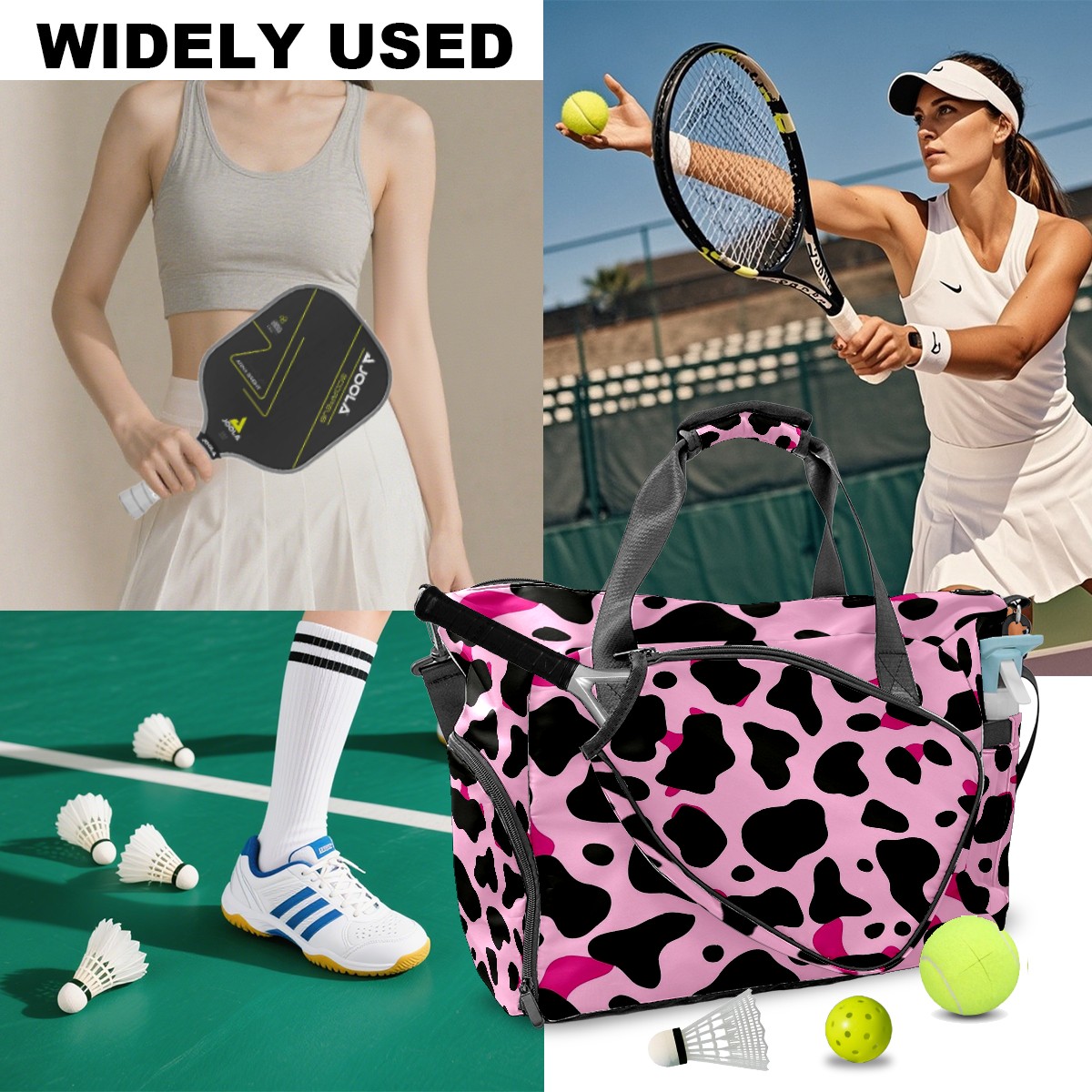 Pickleball Tote Bag Carryall for Paddles Balls and Accessories, Portable Lightweight Gear Bag for Players(Pink And Black Cow Print Pattern)