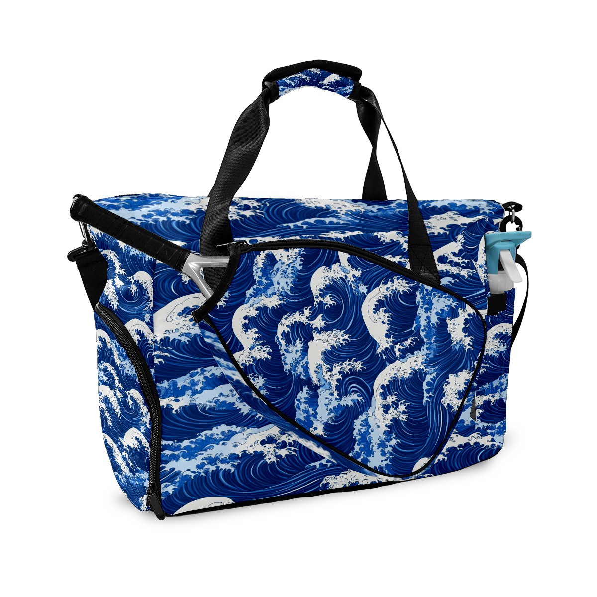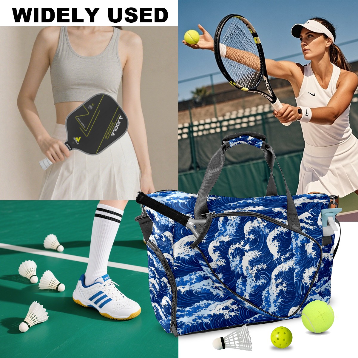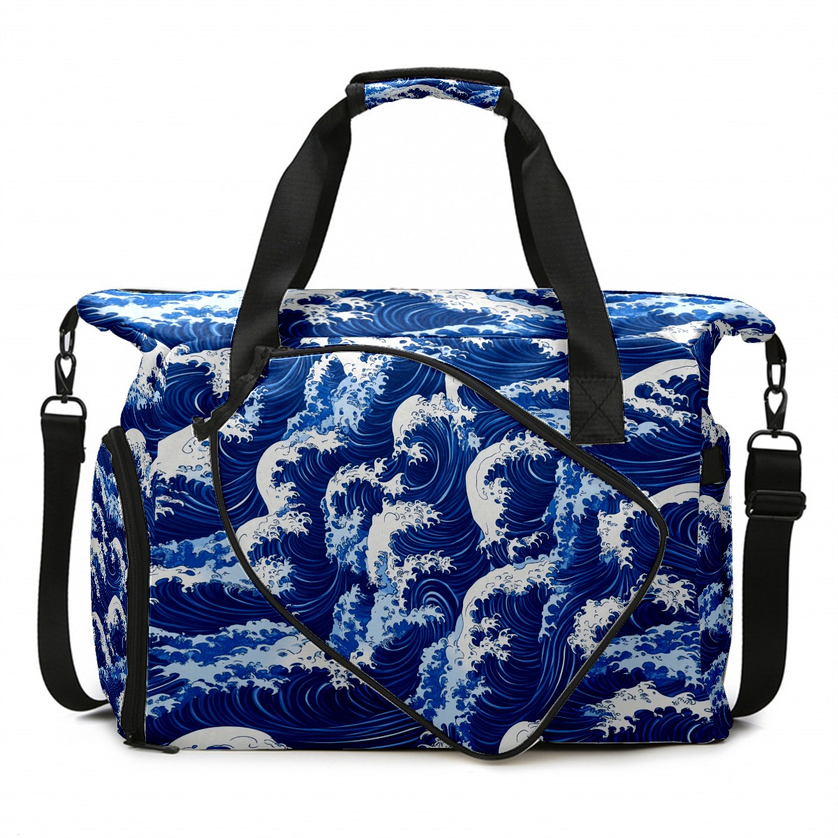 Pickleball Tote Bag Carryall for Paddles Balls and Accessories, Portable Lightweight Gear Bag for Players(Blue And White Ocean Wave)
