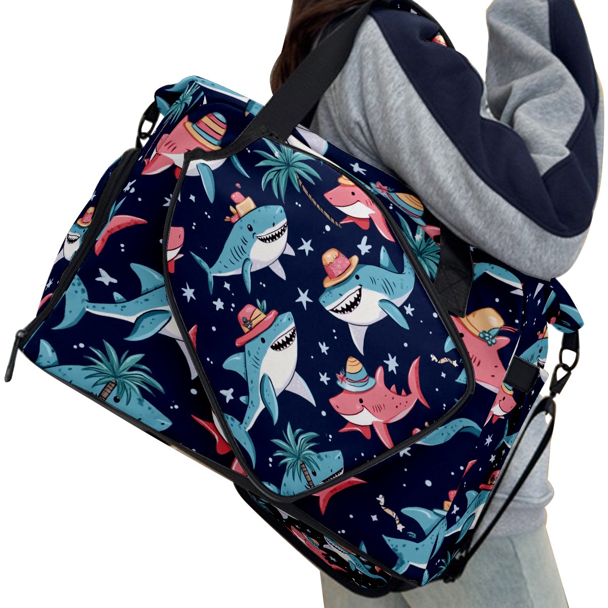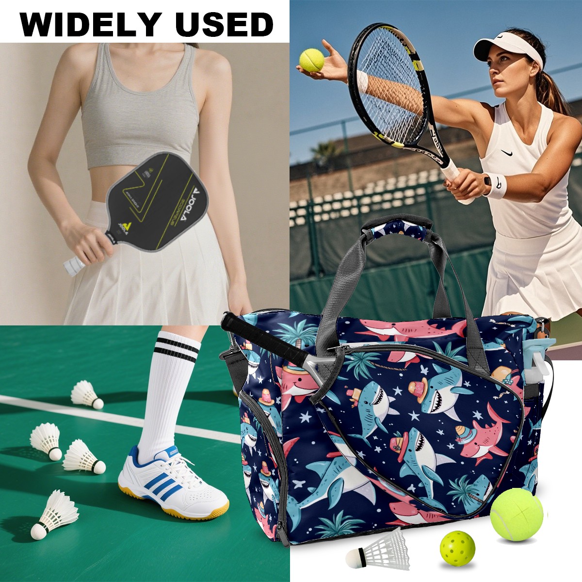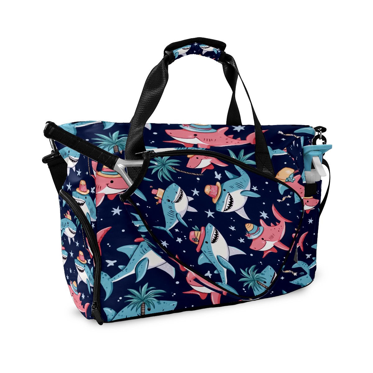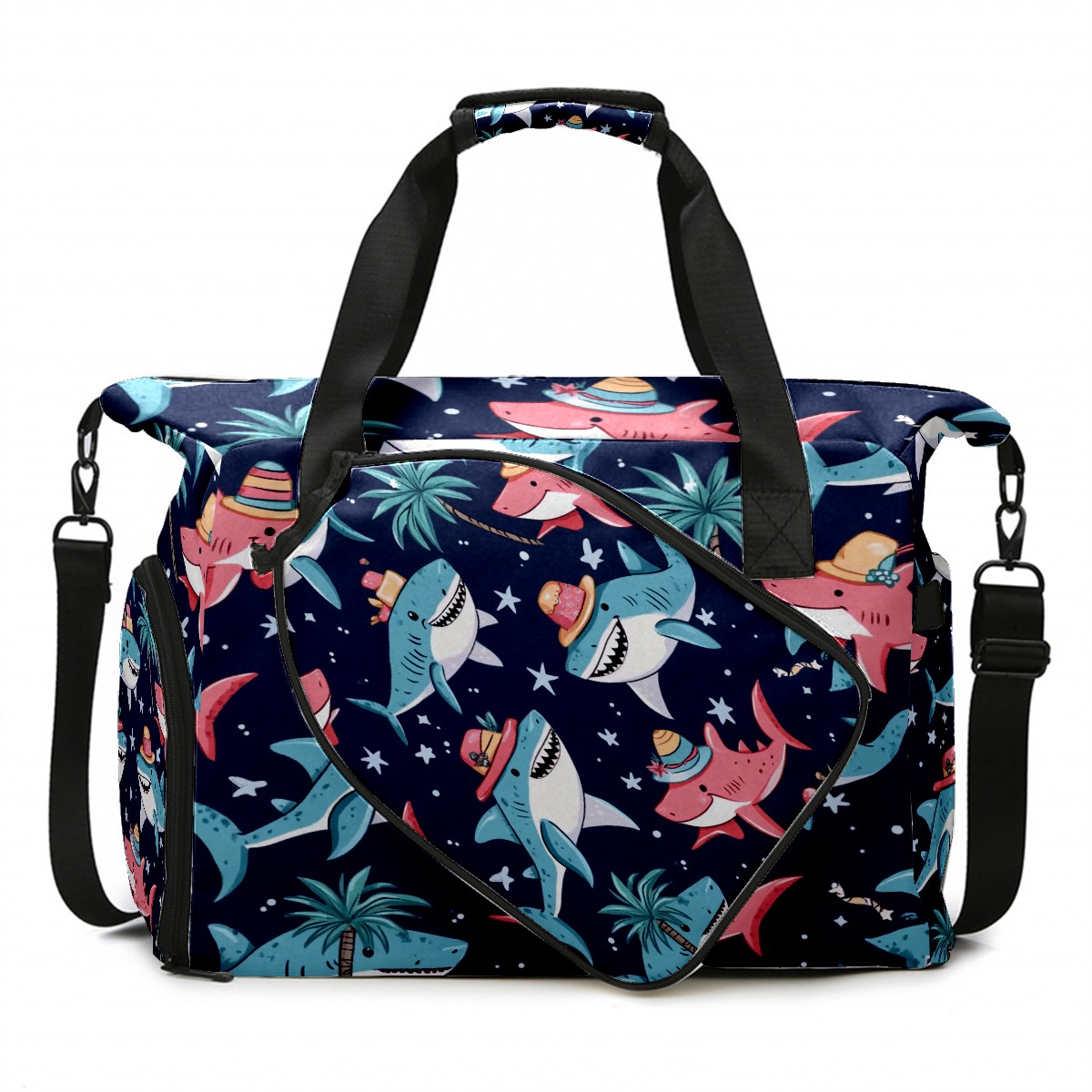 Pickleball Tote Bag Carryall for Paddles Balls and Accessories, Portable Lightweight Gear Bag for Players(Sharks Wearing Hats)
