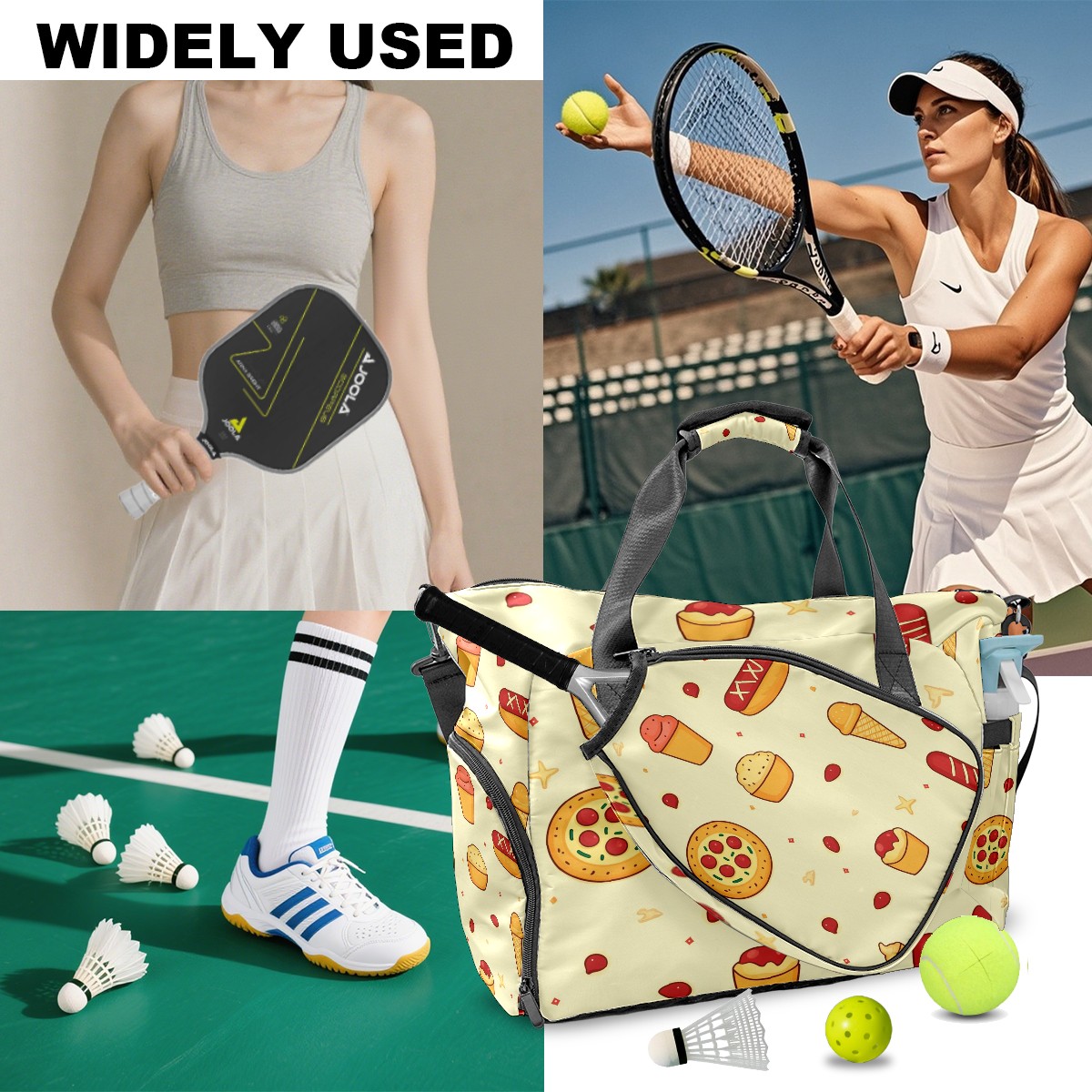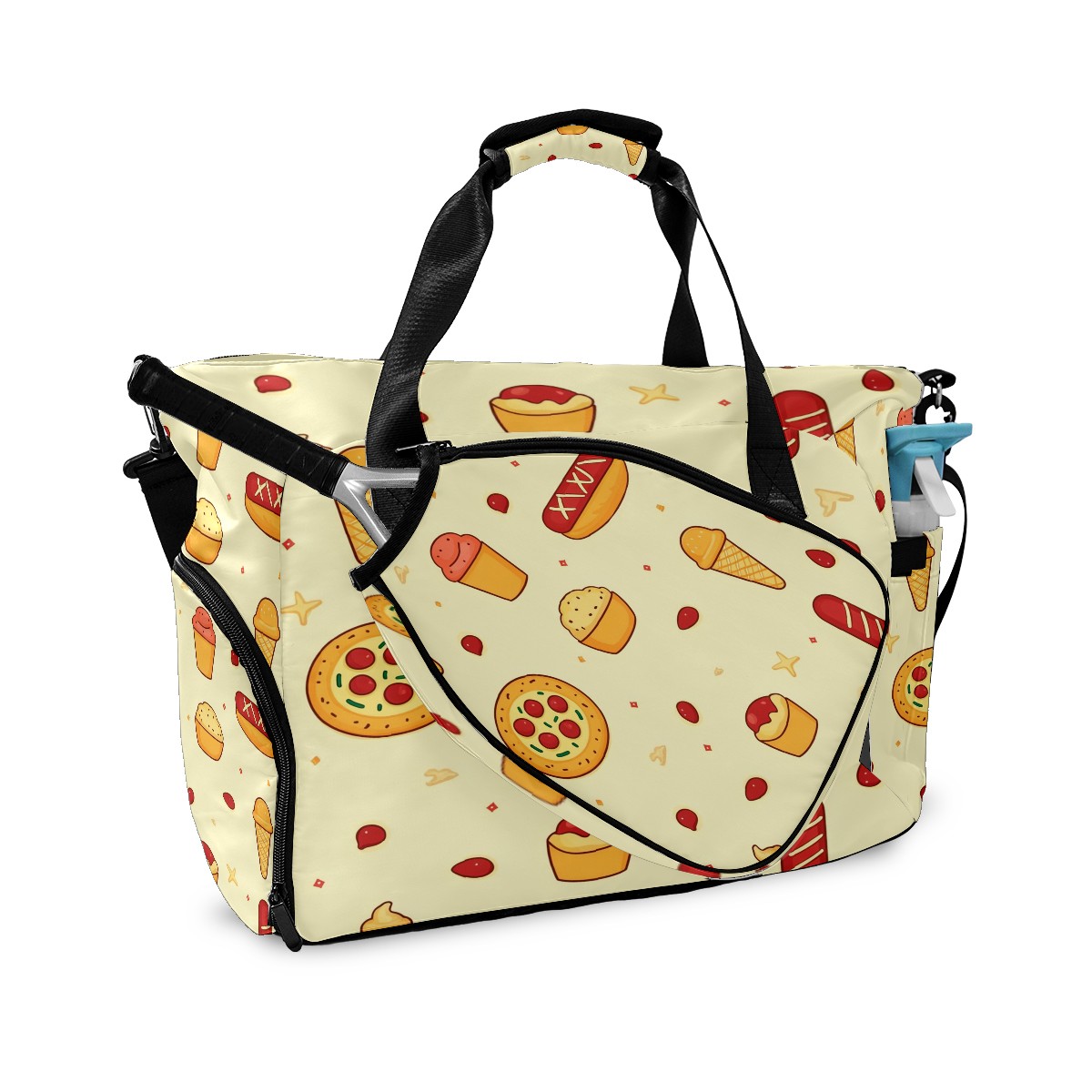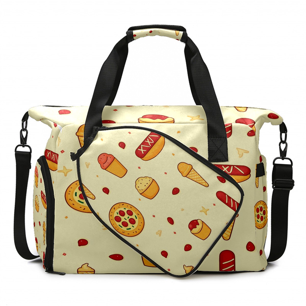 Pickleball Tote Bag Carryall for Paddles Balls and Accessories, Portable Lightweight Gear Bag for Players(Pizza And Hot Dog)