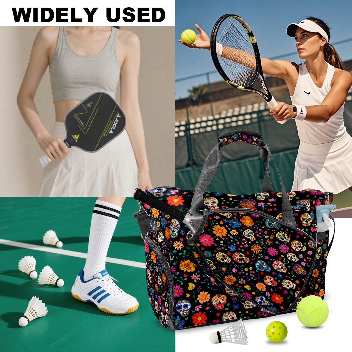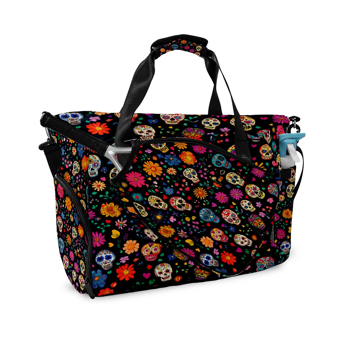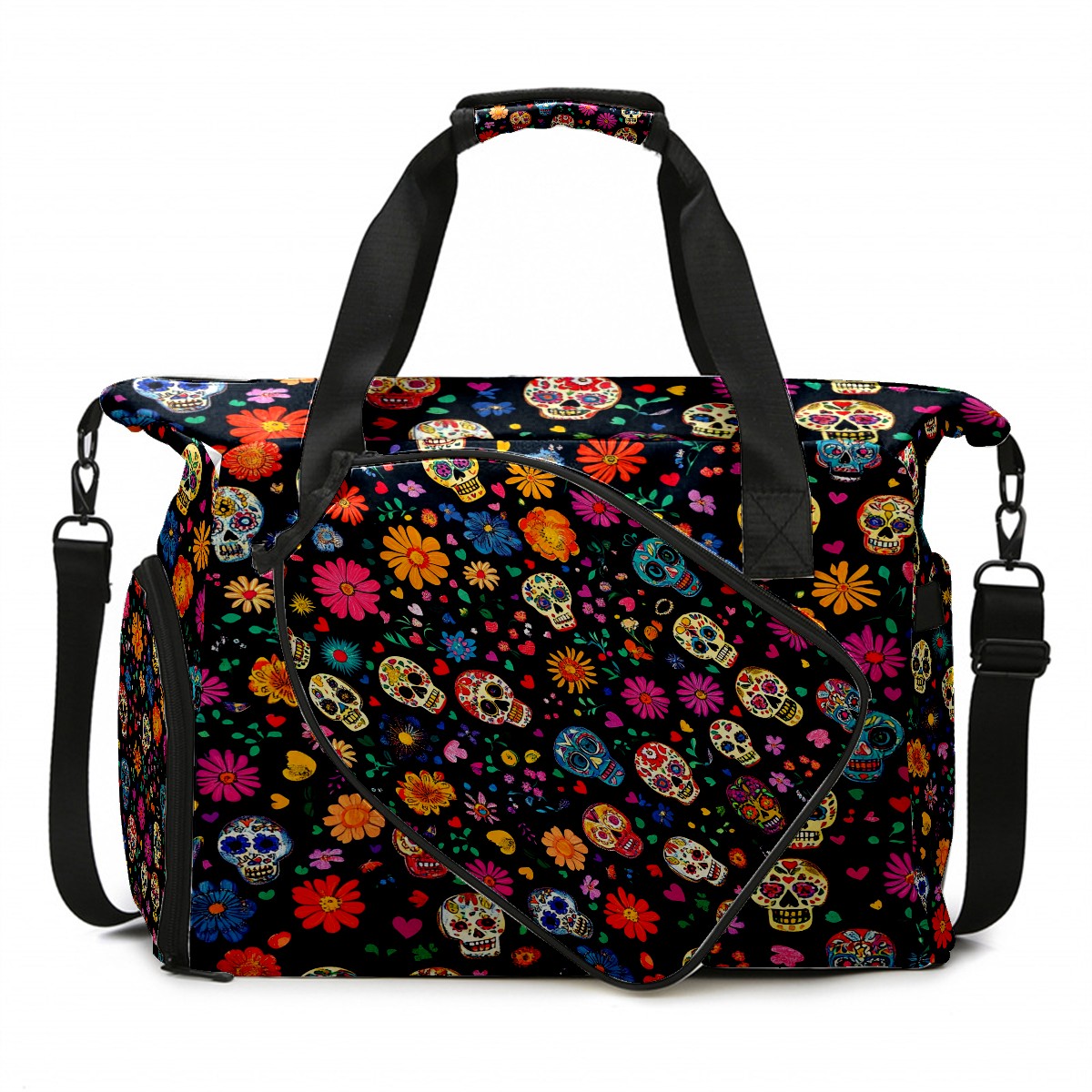 Pickleball Tote Bag Carryall for Paddles Balls and Accessories, Portable Lightweight Gear Bag for Players(Colorful Sugar Skulls And Flowers)