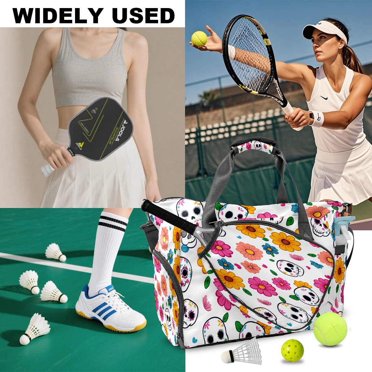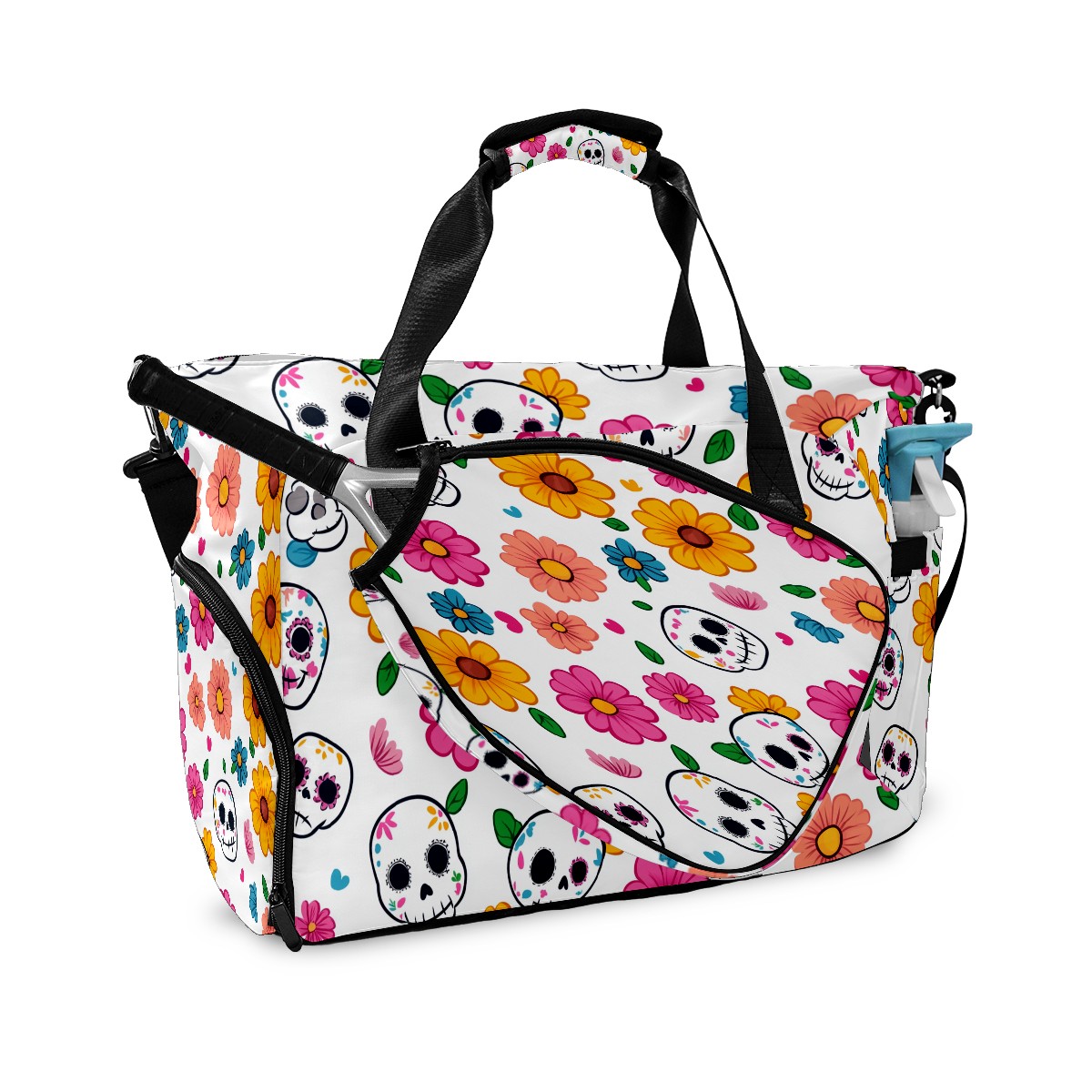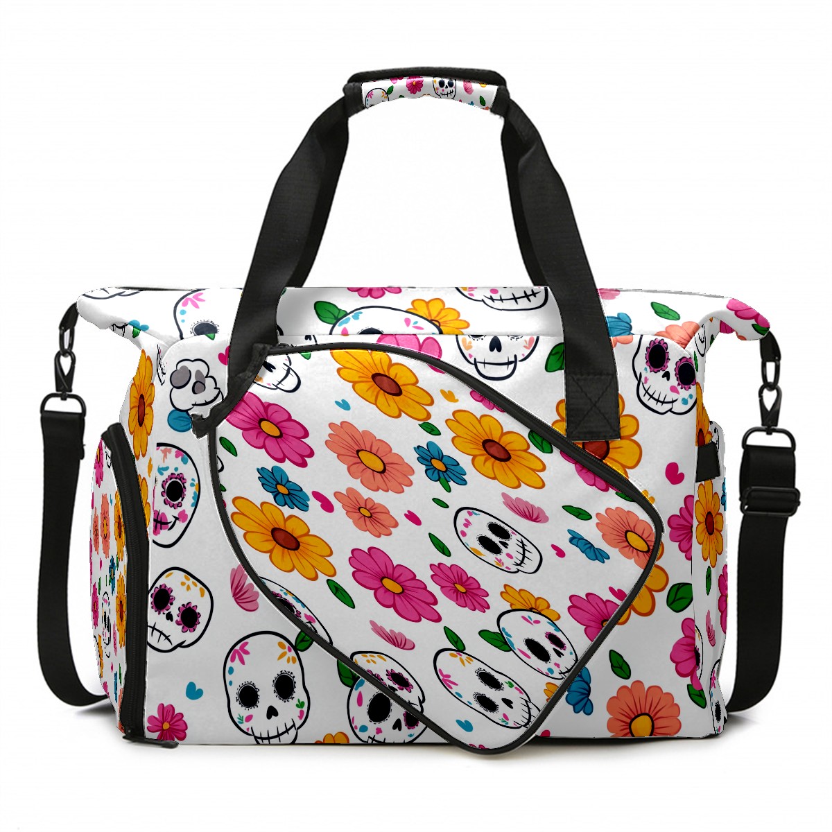 Pickleball Tote Bag Carryall for Paddles Balls and Accessories, Portable Lightweight Gear Bag for Players(Sugar Skulls)