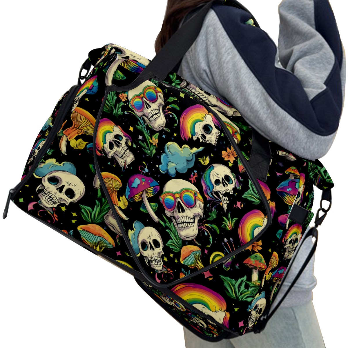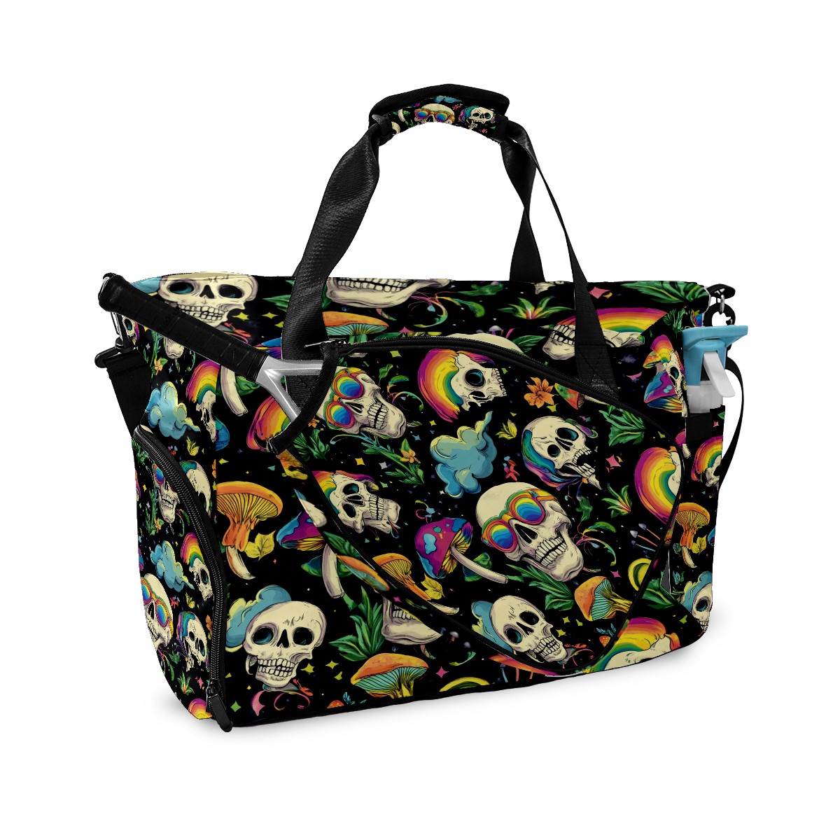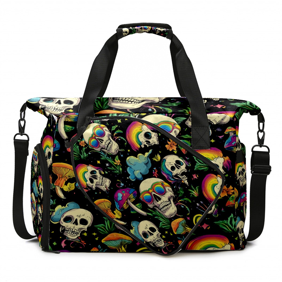 Pickleball Tote Bag Carryall for Paddles Balls and Accessories, Portable Lightweight Gear Bag for Players(Skulls With Rainbow Eyes Mushrooms)