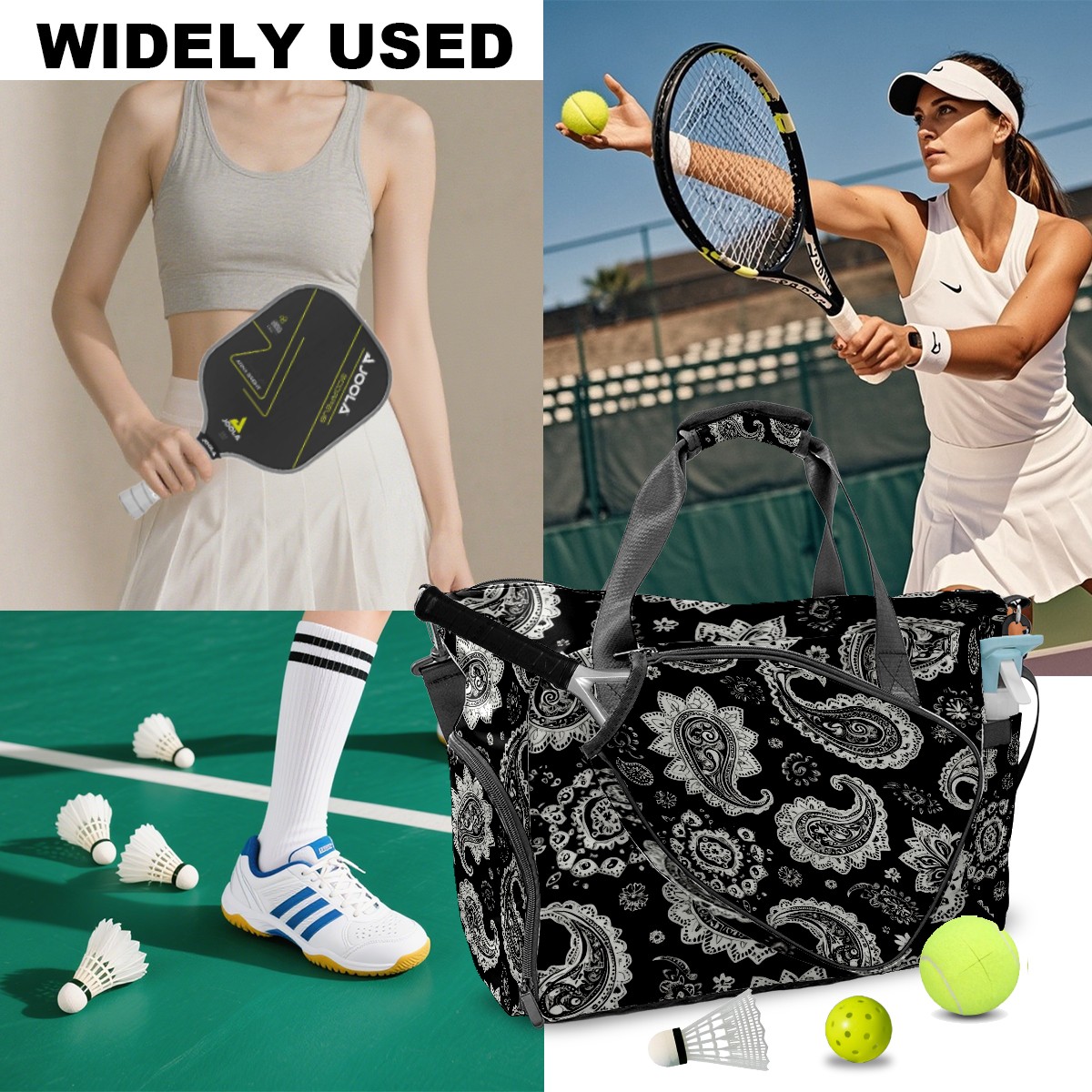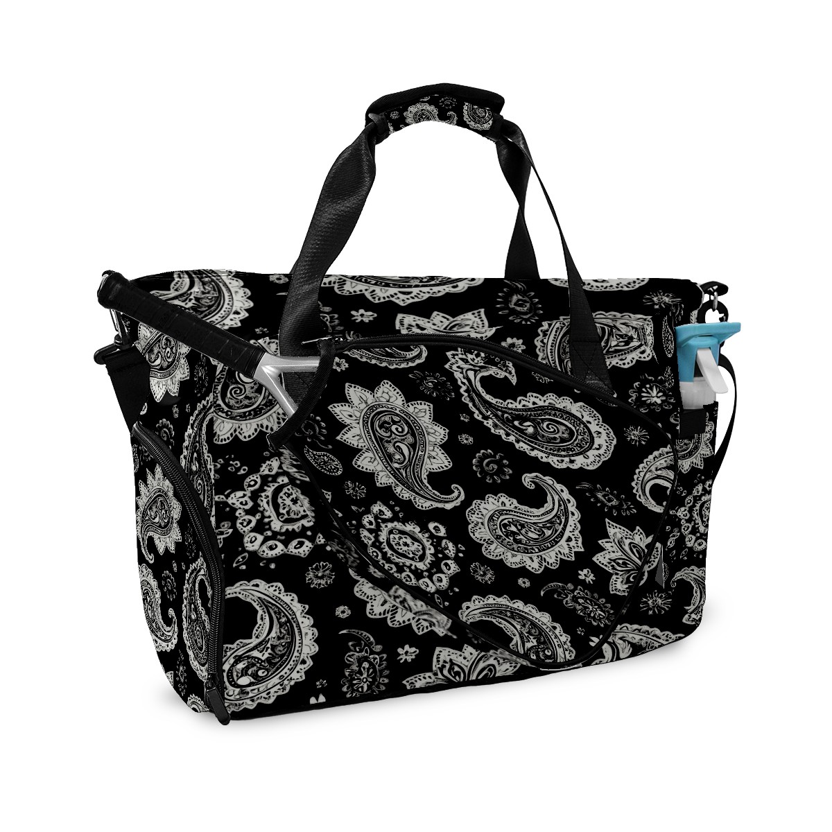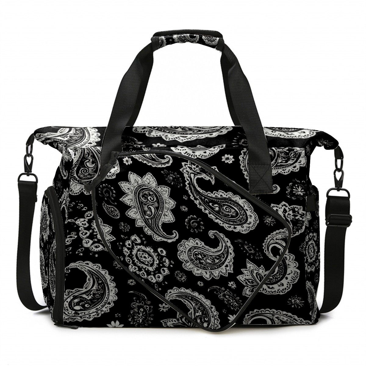 Pickleball Tote Bag Carryall for Paddles Balls and Accessories, Portable Lightweight Gear Bag for Players(Black And White Paisley)