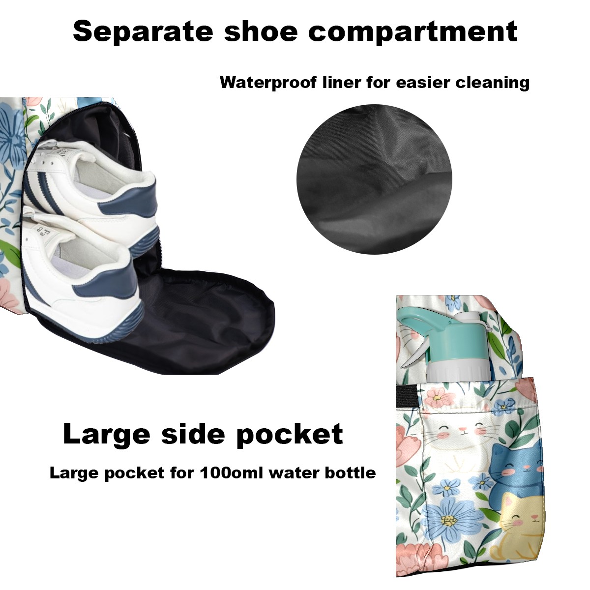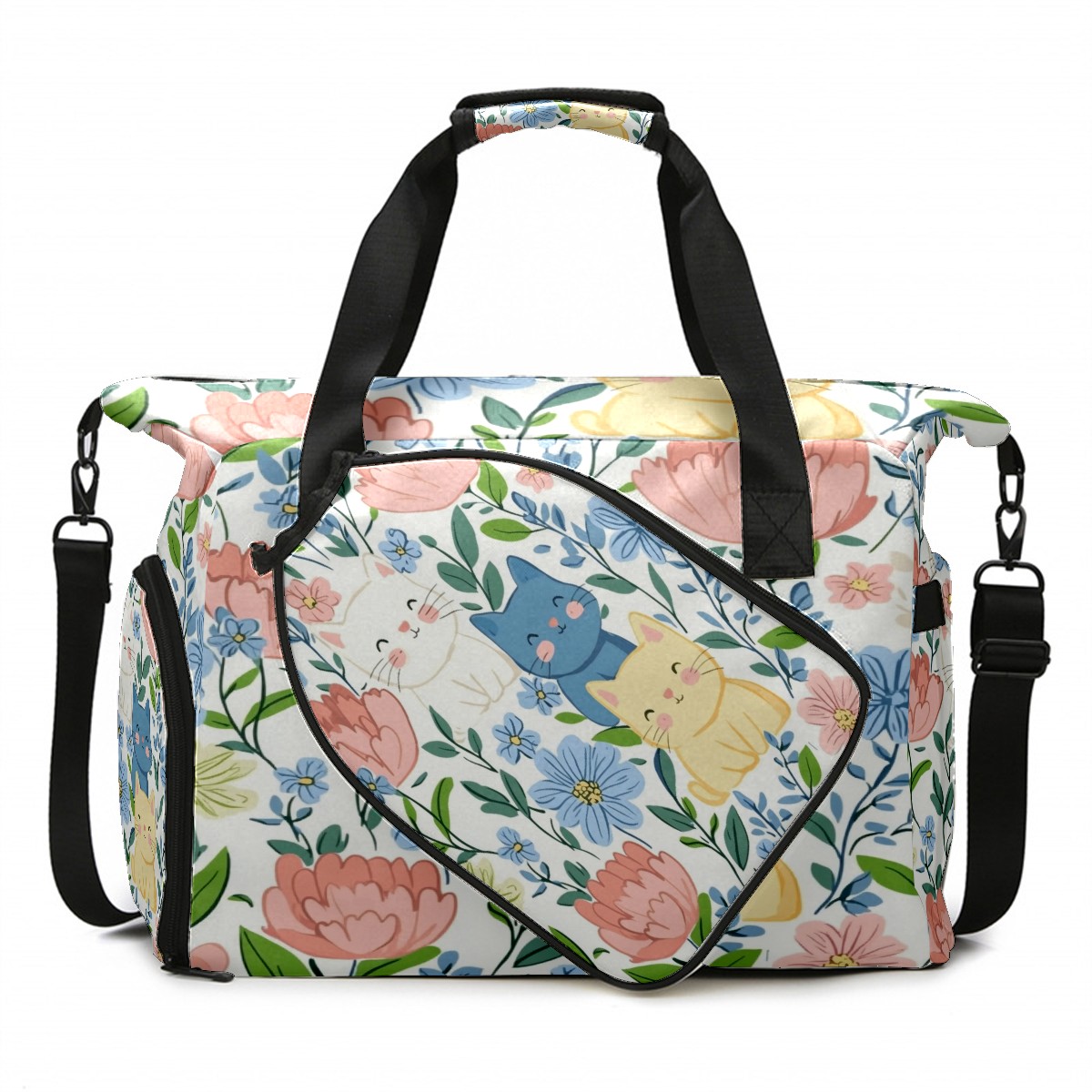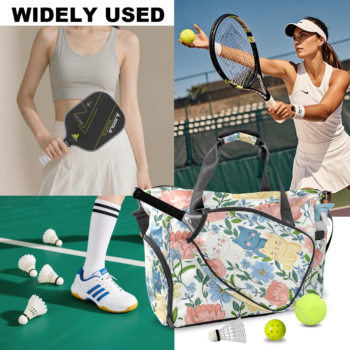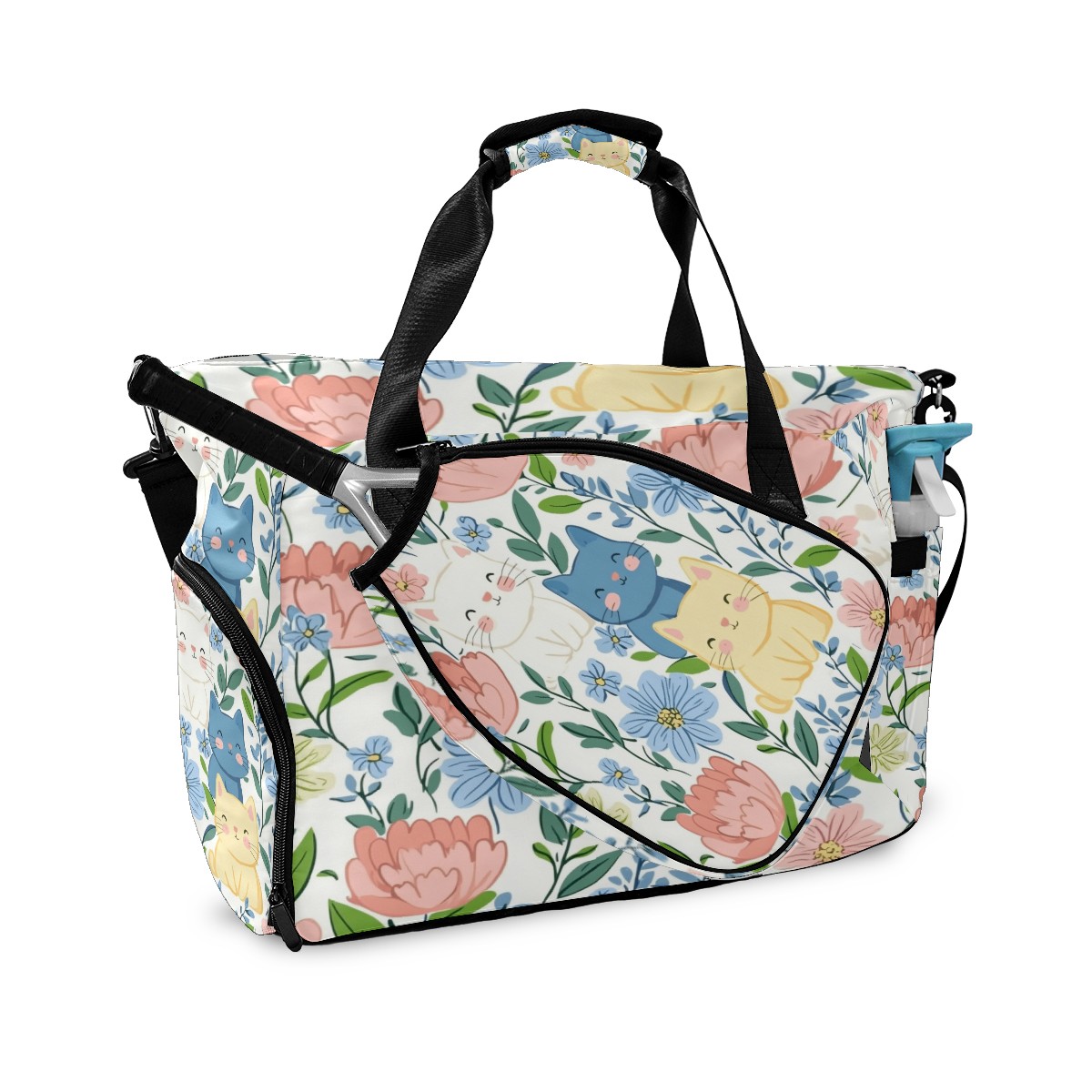 Pickleball Tote Bag Carryall for Paddles Balls and Accessories, Portable Lightweight Gear Bag for Players(Cats In Flowers)
