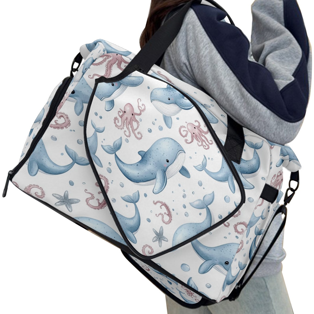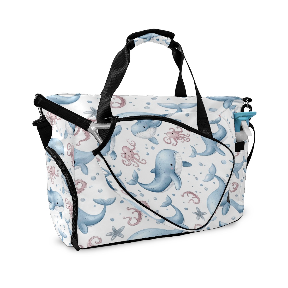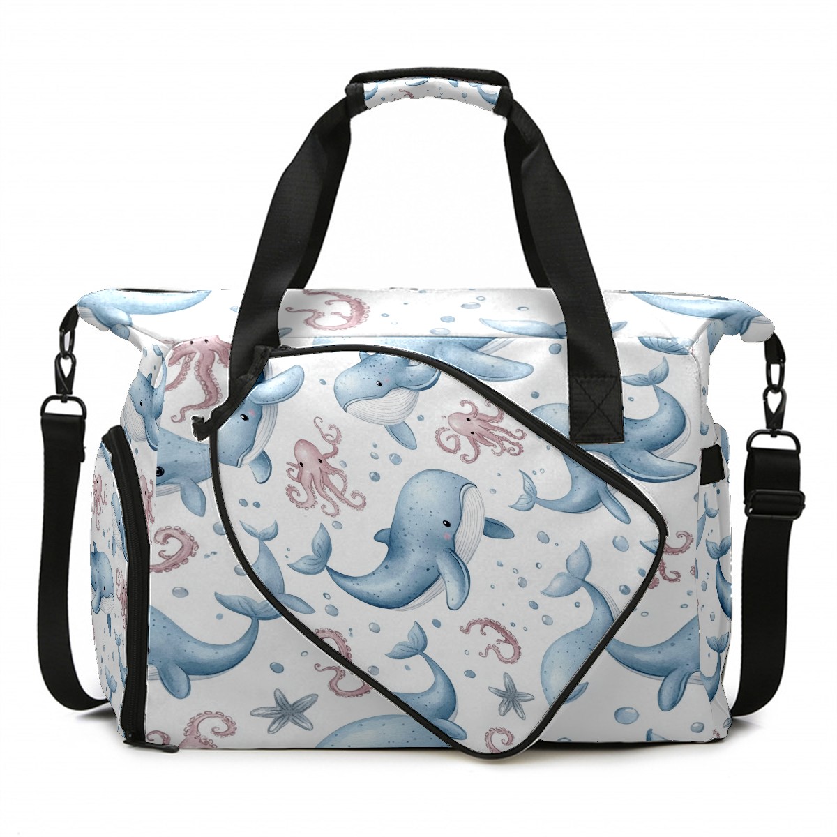 Pickleball Tote Bag Carryall for Paddles Balls and Accessories, Portable Lightweight Gear Bag for Players(Whales Octopus)