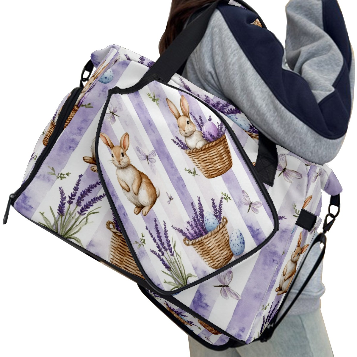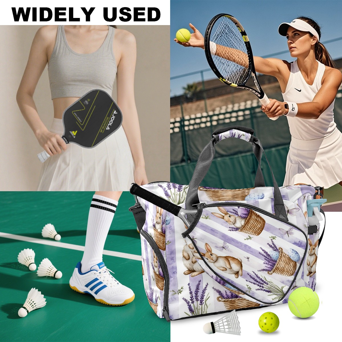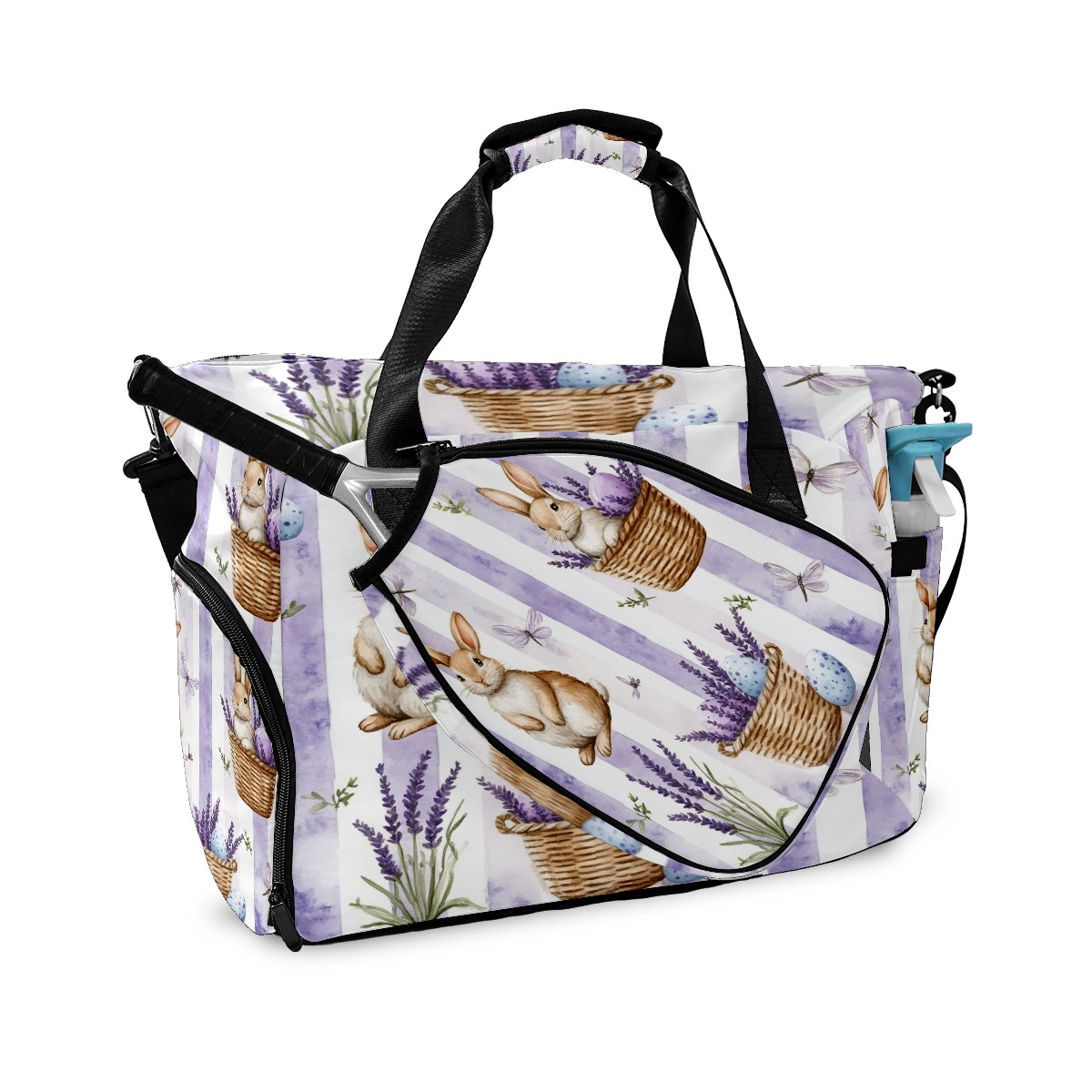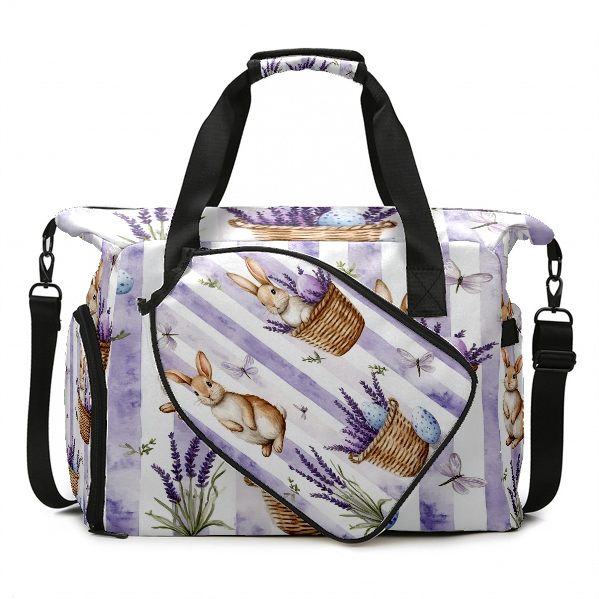 Pickleball Tote Bag Carryall for Paddles Balls and Accessories, Portable Lightweight Gear Bag for Players(Bunnies And Lavender)