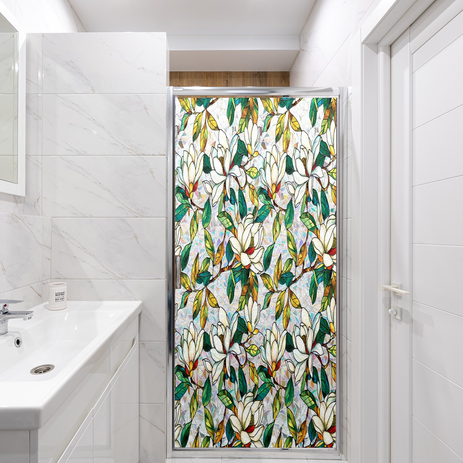 Frosted Glass Window Film Privacy Film Decorative Static Cling Window Film Stained Glass Decals for Bathroom Shower Door Non Adhesive White Flowers Texture (17.7x23.6in)
